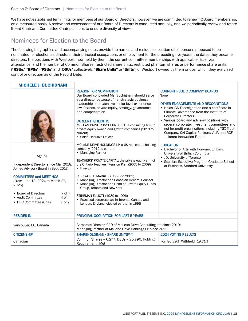 Section 2: Board of Directors | Nominees for Election to the Board WESTPORT FUEL SYSTEMS INC. 2025 MANAGEMENT INFORMATION CIRCULAR | 18 We have not established term limits for members of our Board of Directors; however, we are committed to renewing Board membership, on a measured basis. A review and assessment of our Board of Directors is conducted annually, and we periodically review and rotate Board Chair and Committee Chair positions to ensure diversity of views. Nominees for Election to the Board The following biographies and accompanying notes provide the names and residence location of all persons proposed to be nominated for election as directors, their principal occupations or employment for the preceding five years, the dates they became directors, the positions with Westport now held by them, the current committee memberships with applicable fiscal year attendance, and the number of Common Shares, restricted share units, restricted phantom shares or performance share units, ("RSUs," "RPSs", "PSUs" and "DSUs" collectively, "Share Units" or "Units") of Westport owned by them or over which they exercised control or direction as of the Record Date. MICHELE J. BUCHIGNANI REASON FOR NOMINATION Our Board concluded Ms. Buchignani should serve as a director because of her strategic business leadership and extensive senior level experience in law, finance, private equity, strategy, governance and compensation. CAREER HIGHLIGHTS MCLEAN DRIVE CONSULTING LTD., a consulting firm to private equity owned and growth companies (2010 to current) • Chief Executive Officer MCLANE DRIVE HOLDINGS LP, a US real estate holding company (2012 to current) • Managing Partner TEACHERS’ PRIVATE CAPITAL, the private equity arm of the Ontario Teachers’ Pension Plan (2005 to 2009) • Director CIBC WORLD MARKETS (1996 to 2003) • Managing Director and Canadian General Counsel • Managing Director and Head of Private Equity Funds Group, Toronto and New York STIKEMAN ELLIOTT (1989 to 1996) • Practiced corporate law in Toronto, Canada and London, England; elected partner in 1995 CURRENT PUBLIC COMPANY BOARDS None OTHER ENGAGEMENTS AND RECOGNITIONS • Holds ICD.D designation and a certificate in Climate Governance from the Institute of Corporate Directors • Various board and advisory positions with several corporate, investment committees and not-for-profit organizations including TSX Trust Company, CAI Capital Partners V LP, and RCF Jolimont Innovation Fund II EDUCATION • Bachelor of Arts with Honours, English, University of British Columbia • JD, University of Toronto • Stanford Executive Program, Graduate School of Business, Stanford University Age 61 Independent Director since Mar 2018; Joined Advisory Board in Sept 2017; COMMITTEES and MEETINGS (From June 13, 2024 to March 27, 2025) • Board of Directors 7 of 7 • Audit Committee 4 of 4 • HRC Committee (Chair) 7 of 7 RESIDES IN PRINCIPAL OCCUPATION FOR LAST 5 YEARS Vancouver, BC, Canada Corporate Director, CEO of McLean Drive Consulting Ltd since 2010; Managing Partner of McLane Drive Holdings LP since 2012 CITIZENSHIP SHAREHOLDINGS / SHARE UNITS(1,3) 2024 VOTING RESULTS Canadian Common Shares – 6,277; DSUs – 25,796: Holding Requirement - Met For: 80.29% Withheld: 19.71%