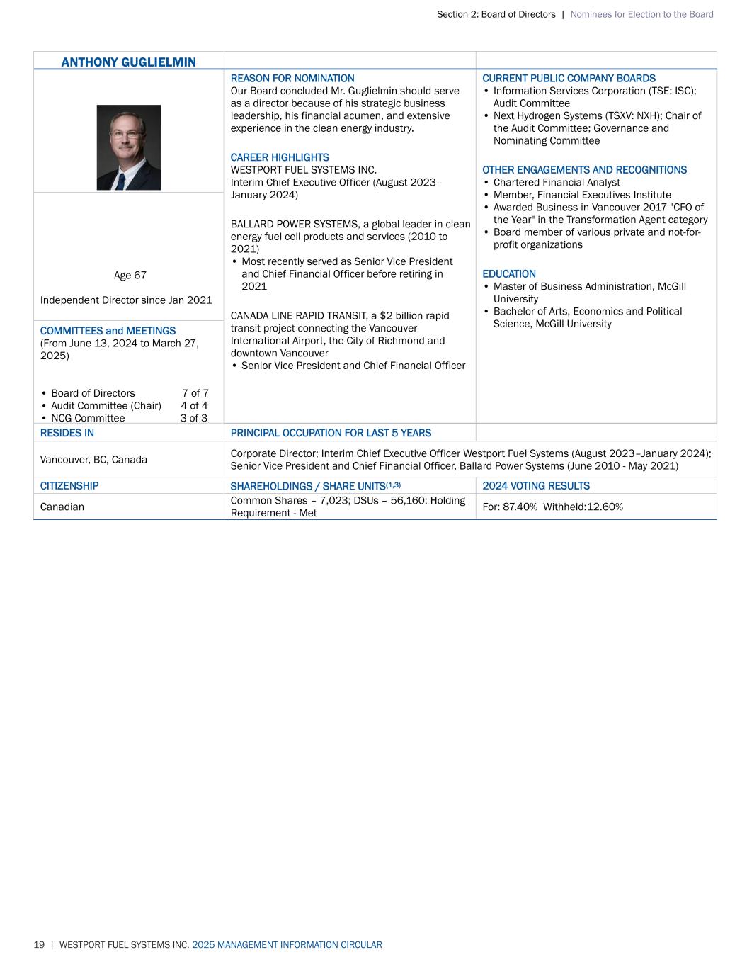 Section 2: Board of Directors | Nominees for Election to the Board 19 | WESTPORT FUEL SYSTEMS INC. 2025 MANAGEMENT INFORMATION CIRCULAR ANTHONY GUGLIELMIN REASON FOR NOMINATION Our Board concluded Mr. Guglielmin should serve as a director because of his strategic business leadership, his financial acumen, and extensive experience in the clean energy industry. CAREER HIGHLIGHTS WESTPORT FUEL SYSTEMS INC. Interim Chief Executive Officer (August 2023– January 2024) BALLARD POWER SYSTEMS, a global leader in clean energy fuel cell products and services (2010 to 2021) • Most recently served as Senior Vice President and Chief Financial Officer before retiring in 2021 CANADA LINE RAPID TRANSIT, a $2 billion rapid transit project connecting the Vancouver International Airport, the City of Richmond and downtown Vancouver • Senior Vice President and Chief Financial Officer CURRENT PUBLIC COMPANY BOARDS • Information Services Corporation (TSE: ISC); Audit Committee • Next Hydrogen Systems (TSXV: NXH); Chair of the Audit Committee; Governance and Nominating Committee OTHER ENGAGEMENTS AND RECOGNITIONS • Chartered Financial Analyst • Member, Financial Executives Institute • Awarded Business in Vancouver 2017 "CFO of the Year" in the Transformation Agent category • Board member of various private and not-for- profit organizations EDUCATION • Master of Business Administration, McGill University • Bachelor of Arts, Economics and Political Science, McGill University Age 67 Independent Director since Jan 2021 COMMITTEES and MEETINGS (From June 13, 2024 to March 27, 2025) • Board of Directors 7 of 7 • Audit Committee (Chair) 4 of 4 • NCG Committee 3 of 3 RESIDES IN PRINCIPAL OCCUPATION FOR LAST 5 YEARS Vancouver, BC, Canada Corporate Director; Interim Chief Executive Officer Westport Fuel Systems (August 2023–January 2024); Senior Vice President and Chief Financial Officer, Ballard Power Systems (June 2010 - May 2021) CITIZENSHIP SHAREHOLDINGS / SHARE UNITS(1,3) 2024 VOTING RESULTS Canadian Common Shares – 7,023; DSUs – 56,160: Holding Requirement - Met For: 87.40% Withheld:12.60%