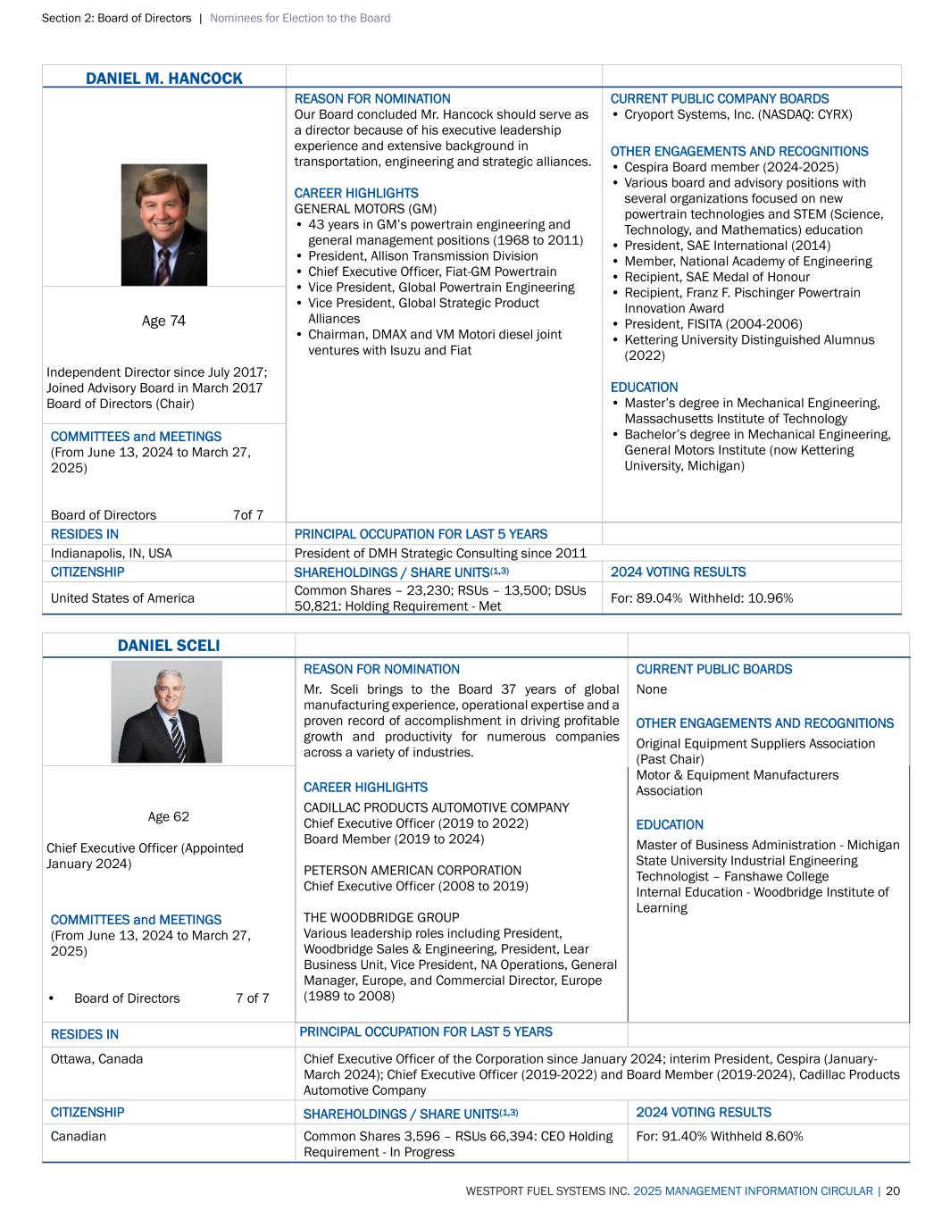 Section 2: Board of Directors | Nominees for Election to the Board WESTPORT FUEL SYSTEMS INC. 2025 MANAGEMENT INFORMATION CIRCULAR | 20 DANIEL M. HANCOCK REASON FOR NOMINATION Our Board concluded Mr. Hancock should serve as a director because of his executive leadership experience and extensive background in transportation, engineering and strategic alliances. CAREER HIGHLIGHTS GENERAL MOTORS (GM) • 43 years in GM’s powertrain engineering and general management positions (1968 to 2011) • President, Allison Transmission Division • Chief Executive Officer, Fiat-GM Powertrain • Vice President, Global Powertrain Engineering • Vice President, Global Strategic Product Alliances • Chairman, DMAX and VM Motori diesel joint ventures with Isuzu and Fiat CURRENT PUBLIC COMPANY BOARDS • Cryoport Systems, Inc. (NASDAQ: CYRX) OTHER ENGAGEMENTS AND RECOGNITIONS • Cespira Board member (2024-2025) • Various board and advisory positions with several organizations focused on new powertrain technologies and STEM (Science, Technology, and Mathematics) education • President, SAE International (2014) • Member, National Academy of Engineering • Recipient, SAE Medal of Honour • Recipient, Franz F. Pischinger Powertrain Innovation Award • President, FISITA (2004-2006) • Kettering University Distinguished Alumnus (2022) EDUCATION • Master’s degree in Mechanical Engineering, Massachusetts Institute of Technology • Bachelor’s degree in Mechanical Engineering, General Motors Institute (now Kettering University, Michigan) Age 74 Independent Director since July 2017; Joined Advisory Board in March 2017 Board of Directors (Chair) COMMITTEES and MEETINGS (From June 13, 2024 to March 27, 2025) Board of Directors 7of 7 RESIDES IN PRINCIPAL OCCUPATION FOR LAST 5 YEARS Indianapolis, IN, USA President of DMH Strategic Consulting since 2011 CITIZENSHIP SHAREHOLDINGS / SHARE UNITS(1,3) 2024 VOTING RESULTS United States of America Common Shares – 23,230; RSUs – 13,500; DSUs 50,821: Holding Requirement - Met For: 89.04% Withheld: 10.96% DANIEL SCELI REASON FOR NOMINATION Mr. Sceli brings to the Board 37 years of global manufacturing experience, operational expertise and a proven record of accomplishment in driving profitable growth and productivity for numerous companies across a variety of industries. CAREER HIGHLIGHTS CADILLAC PRODUCTS AUTOMOTIVE COMPANY Chief Executive Officer (2019 to 2022) Board Member (2019 to 2024) PETERSON AMERICAN CORPORATION Chief Executive Officer (2008 to 2019) THE WOODBRIDGE GROUP Various leadership roles including President, Woodbridge Sales & Engineering, President, Lear Business Unit, Vice President, NA Operations, General Manager, Europe, and Commercial Director, Europe (1989 to 2008) CURRENT PUBLIC BOARDS None OTHER ENGAGEMENTS AND RECOGNITIONS Original Equipment Suppliers Association (Past Chair) Motor & Equipment Manufacturers Association EDUCATION Master of Business Administration - Michigan State University Industrial Engineering Technologist – Fanshawe College Internal Education - Woodbridge Institute of Learning Age 62 Chief Executive Officer (Appointed January 2024) COMMITTEES and MEETINGS (From June 13, 2024 to March 27, 2025) • Board of Directors 7 of 7 RESIDES IN PRINCIPAL OCCUPATION FOR LAST 5 YEARS Ottawa, Canada Chief Executive Officer of the Corporation since January 2024; interim President, Cespira (January- March 2024); Chief Executive Officer (2019-2022) and Board Member (2019-2024), Cadillac Products Automotive Company CITIZENSHIP SHAREHOLDINGS / SHARE UNITS(1,3) 2024 VOTING RESULTS Canadian Common Shares 3,596 – RSUs 66,394: CEO Holding Requirement - In Progress For: 91.40% Withheld 8.60%