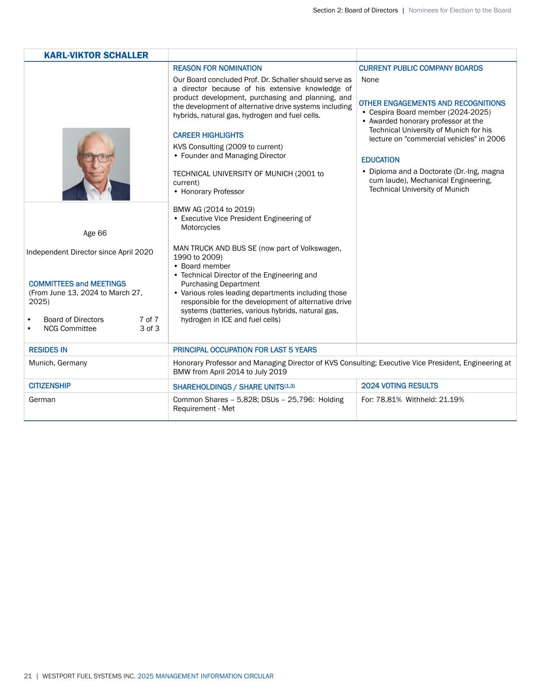 Section 2: Board of Directors | Nominees for Election to the Board 21 | WESTPORT FUEL SYSTEMS INC. 2025 MANAGEMENT INFORMATION CIRCULAR KARL-VIKTOR SCHALLER REASON FOR NOMINATION Our Board concluded Prof. Dr. Schaller should serve as a director because of his extensive knowledge of product development, purchasing and planning, and the development of alternative drive systems including hybrids, natural gas, hydrogen and fuel cells. CAREER HIGHLIGHTS KVS Consulting (2009 to current) • Founder and Managing Director TECHNICAL UNIVERSITY OF MUNICH (2001 to current) • Honorary Professor BMW AG (2014 to 2019) • Executive Vice President Engineering of Motorcycles MAN TRUCK AND BUS SE (now part of Volkswagen, 1990 to 2009) • Board member • Technical Director of the Engineering and Purchasing Department • Various roles leading departments including those responsible for the development of alternative drive systems (batteries, various hybrids, natural gas, hydrogen in ICE and fuel cells) CURRENT PUBLIC COMPANY BOARDS None OTHER ENGAGEMENTS AND RECOGNITIONS • Cespira Board member (2024-2025) • Awarded honorary professor at the Technical University of Munich for his lecture on "commercial vehicles" in 2006 EDUCATION • Diploma and a Doctorate (Dr.-Ing, magna cum laude), Mechanical Engineering, Technical University of Munich Age 66 Independent Director since April 2020 COMMITTEES and MEETINGS (From June 13, 2024 to March 27, 2025) • Board of Directors 7 of 7 • NCG Committee 3 of 3 RESIDES IN PRINCIPAL OCCUPATION FOR LAST 5 YEARS Munich, Germany Honorary Professor and Managing Director of KVS Consulting; Executive Vice President, Engineering at BMW from April 2014 to July 2019 CITIZENSHIP SHAREHOLDINGS / SHARE UNITS(1,3) 2024 VOTING RESULTS German Common Shares – 5,828; DSUs – 25,796: Holding Requirement - Met For: 78.81% Withheld: 21.19%