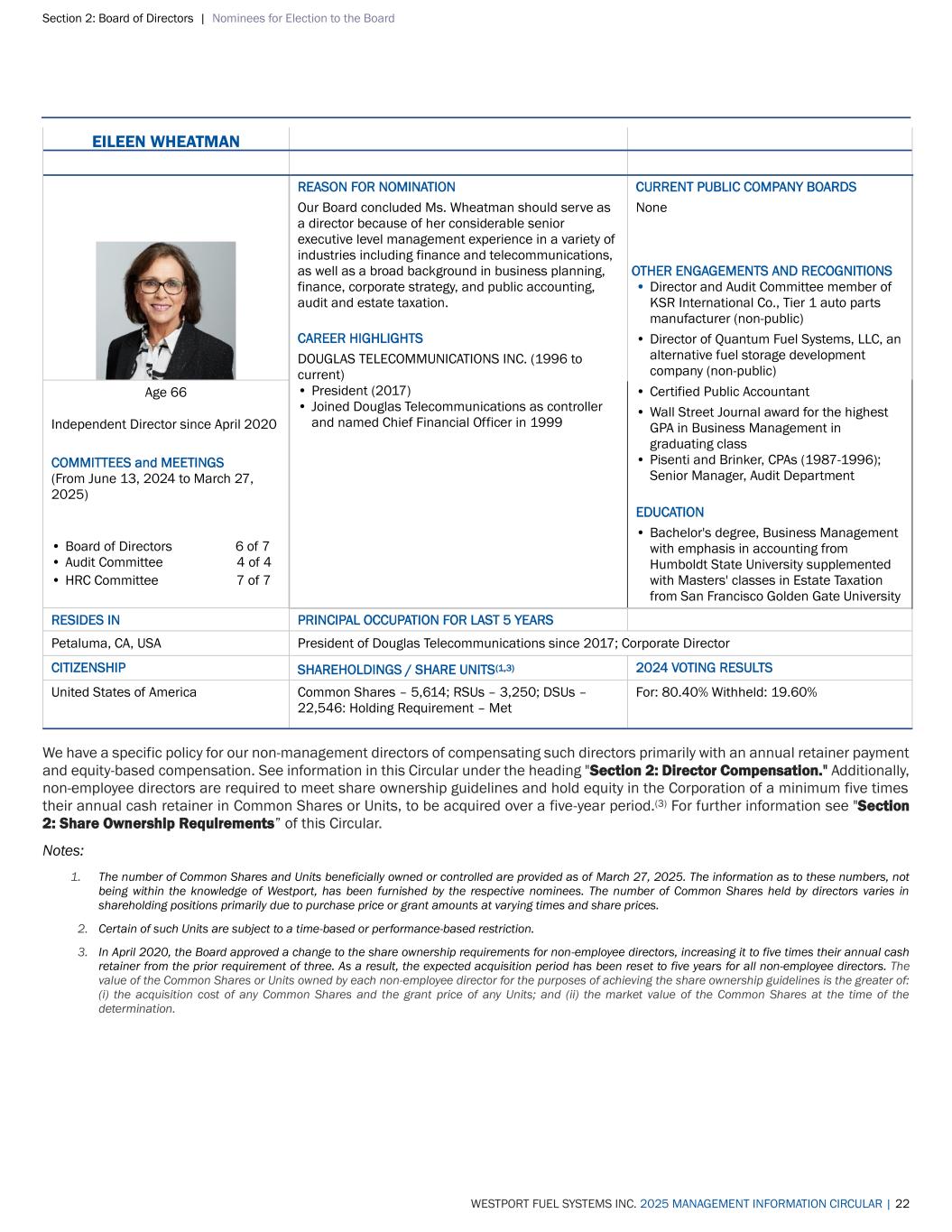 Section 2: Board of Directors | Nominees for Election to the Board WESTPORT FUEL SYSTEMS INC. 2025 MANAGEMENT INFORMATION CIRCULAR | 22 EILEEN WHEATMAN REASON FOR NOMINATION Our Board concluded Ms. Wheatman should serve as a director because of her considerable senior executive level management experience in a variety of industries including finance and telecommunications, as well as a broad background in business planning, finance, corporate strategy, and public accounting, audit and estate taxation. CAREER HIGHLIGHTS DOUGLAS TELECOMMUNICATIONS INC. (1996 to current) • President (2017) • Joined Douglas Telecommunications as controller and named Chief Financial Officer in 1999 CURRENT PUBLIC COMPANY BOARDS None OTHER ENGAGEMENTS AND RECOGNITIONS • Director and Audit Committee member of KSR International Co., Tier 1 auto parts manufacturer (non-public) • Director of Quantum Fuel Systems, LLC, an alternative fuel storage development company (non-public) • Certified Public Accountant • Wall Street Journal award for the highest GPA in Business Management in graduating class • Pisenti and Brinker, CPAs (1987-1996); Senior Manager, Audit Department EDUCATION • Bachelor's degree, Business Management with emphasis in accounting from Humboldt State University supplemented with Masters' classes in Estate Taxation from San Francisco Golden Gate University Age 66 Independent Director since April 2020 COMMITTEES and MEETINGS (From June 13, 2024 to March 27, 2025) • Board of Directors 6 of 7 • Audit Committee 4 of 4 • HRC Committee 7 of 7 RESIDES IN PRINCIPAL OCCUPATION FOR LAST 5 YEARS Petaluma, CA, USA President of Douglas Telecommunications since 2017; Corporate Director CITIZENSHIP SHAREHOLDINGS / SHARE UNITS(1,3) 2024 VOTING RESULTS United States of America Common Shares – 5,614; RSUs – 3,250; DSUs – 22,546: Holding Requirement – Met For: 80.40% Withheld: 19.60% We have a specific policy for our non-management directors of compensating such directors primarily with an annual retainer payment and equity-based compensation. See information in this Circular under the heading "Section 2: Director Compensation." Additionally, non-employee directors are required to meet share ownership guidelines and hold equity in the Corporation of a minimum five times their annual cash retainer in Common Shares or Units, to be acquired over a five-year period.(3) For further information see "Section 2: Share Ownership Requirements” of this Circular. Notes: 1. The number of Common Shares and Units beneficially owned or controlled are provided as of March 27, 2025. The information as to these numbers, not being within the knowledge of Westport, has been furnished by the respective nominees. The number of Common Shares held by directors varies in shareholding positions primarily due to purchase price or grant amounts at varying times and share prices. 2. Certain of such Units are subject to a time-based or performance-based restriction. 3. In April 2020, the Board approved a change to the share ownership requirements for non-employee directors, increasing it to five times their annual cash retainer from the prior requirement of three. As a result, the expected acquisition period has been reset to five years for all non-employee directors. The value of the Common Shares or Units owned by each non-employee director for the purposes of achieving the share ownership guidelines is the greater of: (i) the acquisition cost of any Common Shares and the grant price of any Units; and (ii) the market value of the Common Shares at the time of the determination.