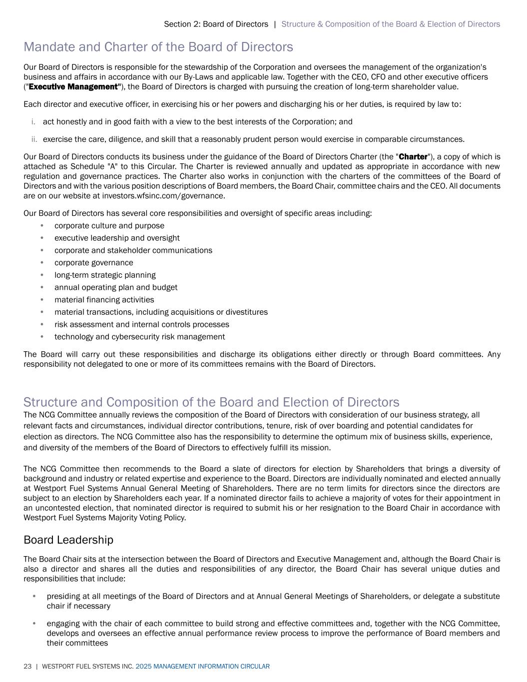 Section 2: Board of Directors | Structure & Composition of the Board & Election of Directors 23 | WESTPORT FUEL SYSTEMS INC. 2025 MANAGEMENT INFORMATION CIRCULAR Mandate and Charter of the Board of Directors Our Board of Directors is responsible for the stewardship of the Corporation and oversees the management of the organization's business and affairs in accordance with our By-Laws and applicable law. Together with the CEO, CFO and other executive officers ("Executive Management"), the Board of Directors is charged with pursuing the creation of long-term shareholder value. Each director and executive officer, in exercising his or her powers and discharging his or her duties, is required by law to: i. act honestly and in good faith with a view to the best interests of the Corporation; and ii. exercise the care, diligence, and skill that a reasonably prudent person would exercise in comparable circumstances. Our Board of Directors conducts its business under the guidance of the Board of Directors Charter (the "Charter"), a copy of which is attached as Schedule "A" to this Circular. The Charter is reviewed annually and updated as appropriate in accordance with new regulation and governance practices. The Charter also works in conjunction with the charters of the committees of the Board of Directors and with the various position descriptions of Board members, the Board Chair, committee chairs and the CEO. All documents are on our website at investors.wfsinc.com/governance. Our Board of Directors has several core responsibilities and oversight of specific areas including: • corporate culture and purpose • executive leadership and oversight • corporate and stakeholder communications • corporate governance • long-term strategic planning • annual operating plan and budget • material financing activities • material transactions, including acquisitions or divestitures • risk assessment and internal controls processes • technology and cybersecurity risk management The Board will carry out these responsibilities and discharge its obligations either directly or through Board committees. Any responsibility not delegated to one or more of its committees remains with the Board of Directors. Structure and Composition of the Board and Election of Directors The NCG Committee annually reviews the composition of the Board of Directors with consideration of our business strategy, all relevant facts and circumstances, individual director contributions, tenure, risk of over boarding and potential candidates for election as directors. The NCG Committee also has the responsibility to determine the optimum mix of business skills, experience, and diversity of the members of the Board of Directors to effectively fulfill its mission. The NCG Committee then recommends to the Board a slate of directors for election by Shareholders that brings a diversity of background and industry or related expertise and experience to the Board. Directors are individually nominated and elected annually at Westport Fuel Systems Annual General Meeting of Shareholders. There are no term limits for directors since the directors are subject to an election by Shareholders each year. If a nominated director fails to achieve a majority of votes for their appointment in an uncontested election, that nominated director is required to submit his or her resignation to the Board Chair in accordance with Westport Fuel Systems Majority Voting Policy. Board Leadership The Board Chair sits at the intersection between the Board of Directors and Executive Management and, although the Board Chair is also a director and shares all the duties and responsibilities of any director, the Board Chair has several unique duties and responsibilities that include: • presiding at all meetings of the Board of Directors and at Annual General Meetings of Shareholders, or delegate a substitute chair if necessary • engaging with the chair of each committee to build strong and effective committees and, together with the NCG Committee, develops and oversees an effective annual performance review process to improve the performance of Board members and their committees