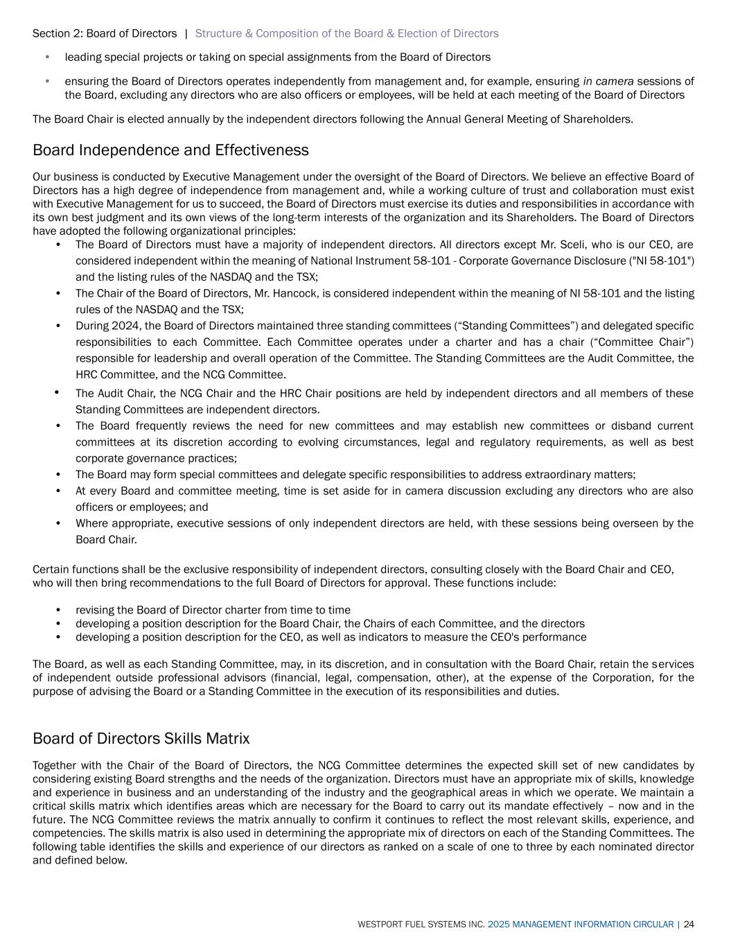 Section 2: Board of Directors | Structure & Composition of the Board & Election of Directors WESTPORT FUEL SYSTEMS INC. 2025 MANAGEMENT INFORMATION CIRCULAR | 24 • leading special projects or taking on special assignments from the Board of Directors • ensuring the Board of Directors operates independently from management and, for example, ensuring in camera sessions of the Board, excluding any directors who are also officers or employees, will be held at each meeting of the Board of Directors The Board Chair is elected annually by the independent directors following the Annual General Meeting of Shareholders. Board Independence and Effectiveness Our business is conducted by Executive Management under the oversight of the Board of Directors. We believe an effective Board of Directors has a high degree of independence from management and, while a working culture of trust and collaboration must exist with Executive Management for us to succeed, the Board of Directors must exercise its duties and responsibilities in accordance with its own best judgment and its own views of the long-term interests of the organization and its Shareholders. The Board of Directors have adopted the following organizational principles: • The Board of Directors must have a majority of independent directors. All directors except Mr. Sceli, who is our CEO, are considered independent within the meaning of National Instrument 58-101 - Corporate Governance Disclosure ("NI 58-101") and the listing rules of the NASDAQ and the TSX; • The Chair of the Board of Directors, Mr. Hancock, is considered independent within the meaning of NI 58-101 and the listing rules of the NASDAQ and the TSX; • During 2024, the Board of Directors maintained three standing committees (“Standing Committees”) and delegated specific responsibilities to each Committee. Each Committee operates under a charter and has a chair (“Committee Chair”) responsible for leadership and overall operation of the Committee. The Standing Committees are the Audit Committee, the HRC Committee, and the NCG Committee. • The Audit Chair, the NCG Chair and the HRC Chair positions are held by independent directors and all members of these Standing Committees are independent directors. • The Board frequently reviews the need for new committees and may establish new committees or disband current committees at its discretion according to evolving circumstances, legal and regulatory requirements, as well as best corporate governance practices; • The Board may form special committees and delegate specific responsibilities to address extraordinary matters; • At every Board and committee meeting, time is set aside for in camera discussion excluding any directors who are also officers or employees; and • Where appropriate, executive sessions of only independent directors are held, with these sessions being overseen by the Board Chair. Certain functions shall be the exclusive responsibility of independent directors, consulting closely with the Board Chair and CEO, who will then bring recommendations to the full Board of Directors for approval. These functions include: • revising the Board of Director charter from time to time • developing a position description for the Board Chair, the Chairs of each Committee, and the directors • developing a position description for the CEO, as well as indicators to measure the CEO's performance The Board, as well as each Standing Committee, may, in its discretion, and in consultation with the Board Chair, retain the services of independent outside professional advisors (financial, legal, compensation, other), at the expense of the Corporation, for the purpose of advising the Board or a Standing Committee in the execution of its responsibilities and duties. Board of Directors Skills Matrix Together with the Chair of the Board of Directors, the NCG Committee determines the expected skill set of new candidates by considering existing Board strengths and the needs of the organization. Directors must have an appropriate mix of skills, knowledge and experience in business and an understanding of the industry and the geographical areas in which we operate. We maintain a critical skills matrix which identifies areas which are necessary for the Board to carry out its mandate effectively – now and in the future. The NCG Committee reviews the matrix annually to confirm it continues to reflect the most relevant skills, experience, and competencies. The skills matrix is also used in determining the appropriate mix of directors on each of the Standing Committees. The following table identifies the skills and experience of our directors as ranked on a scale of one to three by each nominated director and defined below.