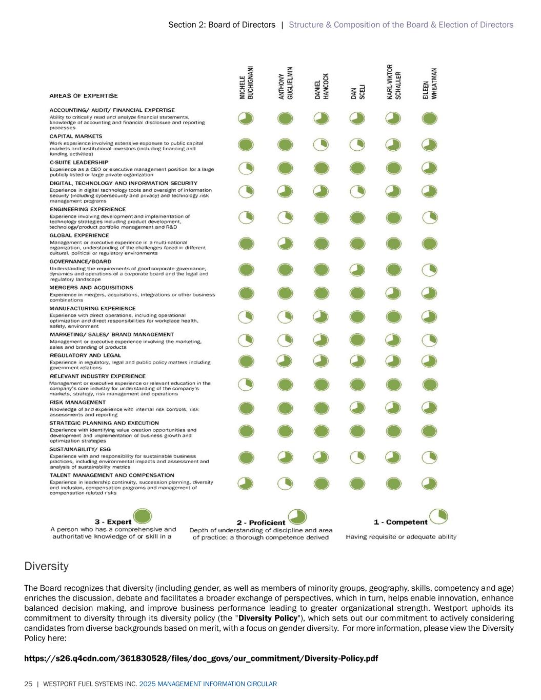Section 2: Board of Directors | Structure & Composition of the Board & Election of Directors 25 | WESTPORT FUEL SYSTEMS INC. 2025 MANAGEMENT INFORMATION CIRCULAR Diversity The Board recognizes that diversity (including gender, as well as members of minority groups, geography, skills, competency and age) enriches the discussion, debate and facilitates a broader exchange of perspectives, which in turn, helps enable innovation, enhance balanced decision making, and improve business performance leading to greater organizational strength. Westport upholds its commitment to diversity through its diversity policy (the "Diversity Policy"), which sets out our commitment to actively considering candidates from diverse backgrounds based on merit, with a focus on gender diversity. For more information, please view the Diversity Policy here: https://s26.q4cdn.com/361830528/files/doc_govs/our_commitment/Diversity-Policy.pdf