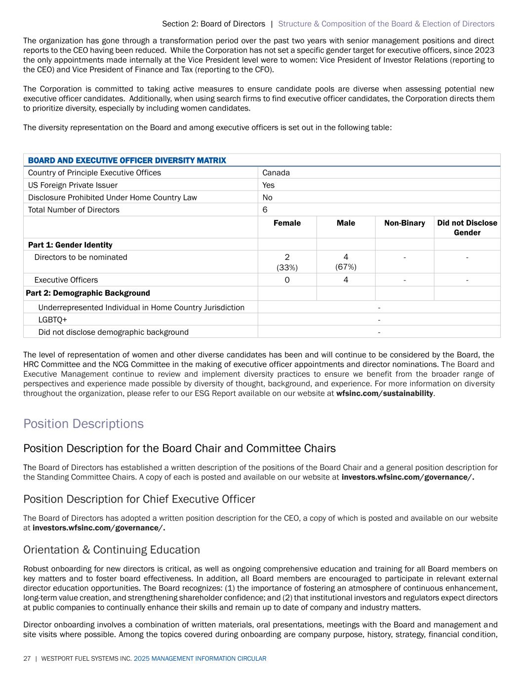 Section 2: Board of Directors | Structure & Composition of the Board & Election of Directors 27 | WESTPORT FUEL SYSTEMS INC. 2025 MANAGEMENT INFORMATION CIRCULAR The organization has gone through a transformation period over the past two years with senior management positions and direct reports to the CEO having been reduced. While the Corporation has not set a specific gender target for executive officers, since 2023 the only appointments made internally at the Vice President level were to women: Vice President of Investor Relations (reporting to the CEO) and Vice President of Finance and Tax (reporting to the CFO). The Corporation is committed to taking active measures to ensure candidate pools are diverse when assessing potential new executive officer candidates. Additionally, when using search firms to find executive officer candidates, the Corporation directs them to prioritize diversity, especially by including women candidates. The diversity representation on the Board and among executive officers is set out in the following table: BOARD AND EXECUTIVE OFFICER DIVERSITY MATRIX Country of Principle Executive Offices Canada US Foreign Private Issuer Yes Disclosure Prohibited Under Home Country Law No Total Number of Directors 6 Female Male Non-Binary Did not Disclose Gender Part 1: Gender Identity Directors to be nominated 2 (33%) 4 (67%) - - Executive Officers 0 4 - - Part 2: Demographic Background Underrepresented Individual in Home Country Jurisdiction - LGBTQ+ - Did not disclose demographic background - The level of representation of women and other diverse candidates has been and will continue to be considered by the Board, the HRC Committee and the NCG Committee in the making of executive officer appointments and director nominations. The Board and Executive Management continue to review and implement diversity practices to ensure we benefit from the broader range of perspectives and experience made possible by diversity of thought, background, and experience. For more information on diversity throughout the organization, please refer to our ESG Report available on our website at wfsinc.com/sustainability. Position Descriptions Position Description for the Board Chair and Committee Chairs The Board of Directors has established a written description of the positions of the Board Chair and a general position description for the Standing Committee Chairs. A copy of each is posted and available on our website at investors.wfsinc.com/governance/. Position Description for Chief Executive Officer The Board of Directors has adopted a written position description for the CEO, a copy of which is posted and available on our website at investors.wfsinc.com/governance/. Orientation & Continuing Education Robust onboarding for new directors is critical, as well as ongoing comprehensive education and training for all Board members on key matters and to foster board effectiveness. In addition, all Board members are encouraged to participate in relevant external director education opportunities. The Board recognizes: (1) the importance of fostering an atmosphere of continuous enhancement, long-term value creation, and strengthening shareholder confidence; and (2) that institutional investors and regulators expect directors at public companies to continually enhance their skills and remain up to date of company and industry matters. Director onboarding involves a combination of written materials, oral presentations, meetings with the Board and management and site visits where possible. Among the topics covered during onboarding are company purpose, history, strategy, financial condition,