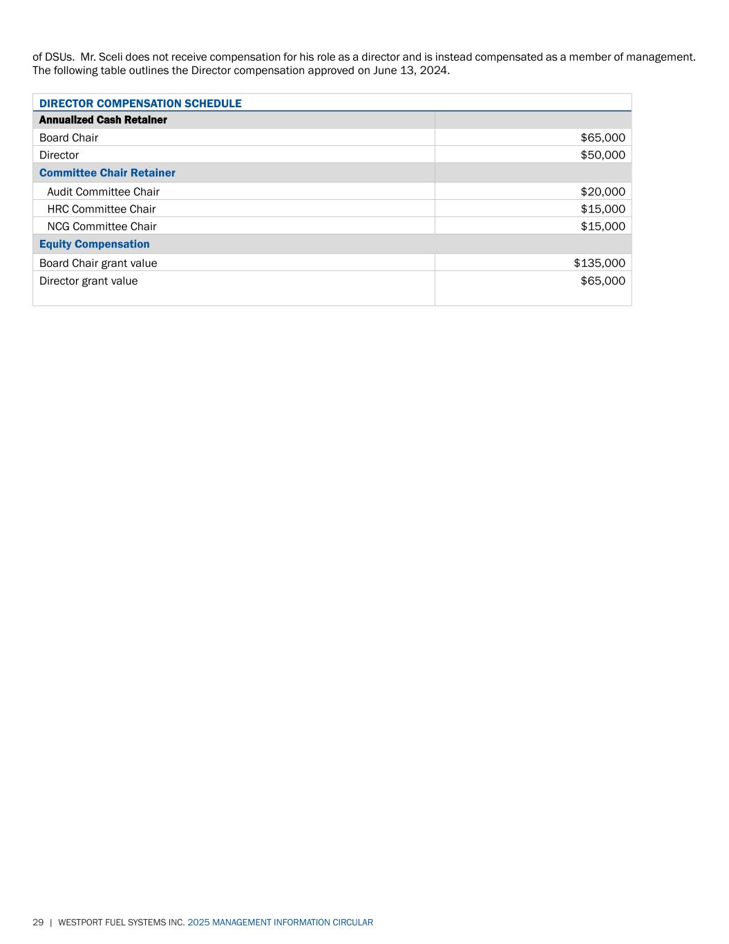29 | WESTPORT FUEL SYSTEMS INC. 2025 MANAGEMENT INFORMATION CIRCULAR of DSUs. Mr. Sceli does not receive compensation for his role as a director and is instead compensated as a member of management. The following table outlines the Director compensation approved on June 13, 2024. DIRECTOR COMPENSATION SCHEDULE Annualized Cash Retainer Board Chair $65,000 Director $50,000 Committee Chair Retainer Audit Committee Chair $20,000 HRC Committee Chair $15,000 NCG Committee Chair $15,000 Equity Compensation Board Chair grant value $135,000 Director grant value $65,000