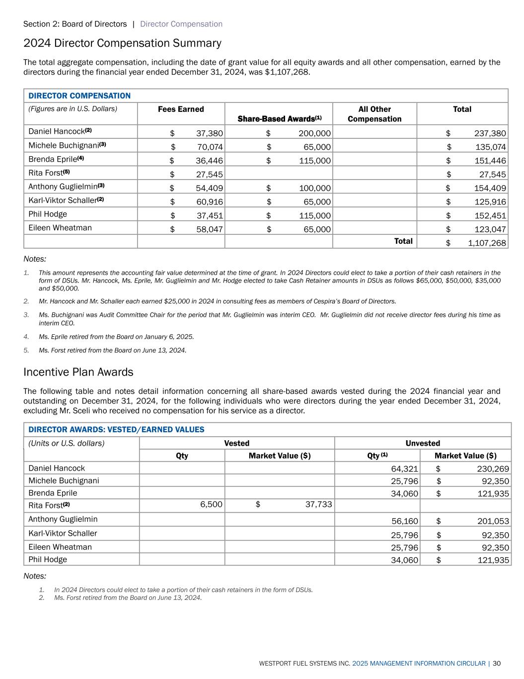 Section 2: Board of Directors | Director Compensation WESTPORT FUEL SYSTEMS INC. 2025 MANAGEMENT INFORMATION CIRCULAR | 30 2024 Director Compensation Summary The total aggregate compensation, including the date of grant value for all equity awards and all other compensation, earned by the directors during the financial year ended December 31, 2024, was $1,107,268. DIRECTOR COMPENSATION (Figures are in U.S. Dollars) Fees Earned Share-Based Awards(1) All Other Compensation Total Daniel Hancock(2) $ 37,380 $ 200,000 $ 237,380 Michele Buchignani(3) $ 70,074 $ 65,000 $ 135,074 Brenda Eprile(4) $ 36,446 $ 115,000 $ 151,446 Rita Forst(5) $ 27,545 $ 27,545 Anthony Guglielmin(3) $ 54,409 $ 100,000 $ 154,409 Karl-Viktor Schaller(2) $ 60,916 $ 65,000 $ 125,916 Phil Hodge $ 37,451 $ 115,000 $ 152,451 Eileen Wheatman $ 58,047 $ 65,000 $ 123,047 Total $ 1,107,268 Notes: 1. This amount represents the accounting fair value determined at the time of grant. In 2024 Directors could elect to take a portion of their cash retainers in the form of DSUs. Mr. Hancock, Ms. Eprile, Mr. Guglielmin and Mr. Hodge elected to take Cash Retainer amounts in DSUs as follows $65,000, $50,000, $35,000 and $50,000. 2. Mr. Hancock and Mr. Schaller each earned $25,000 in 2024 in consulting fees as members of Cespira’s Board of Directors. 3. Ms. Buchignani was Audit Committee Chair for the period that Mr. Guglielmin was interim CEO. Mr. Guglielmin did not receive director fees during his time as interim CEO. 4. Ms. Eprile retired from the Board on January 6, 2025. 5. Ms. Forst retired from the Board on June 13, 2024. Incentive Plan Awards The following table and notes detail information concerning all share-based awards vested during the 2024 financial year and outstanding on December 31, 2024, for the following individuals who were directors during the year ended December 31, 2024, excluding Mr. Sceli who received no compensation for his service as a director. DIRECTOR AWARDS: VESTED/EARNED VALUES (Units or U.S. dollars) Vested Unvested Qty Market Value ($) Qty (1) Market Value ($) Daniel Hancock 64,321 $ 230,269 Michele Buchignani 25,796 $ 92,350 Brenda Eprile 34,060 $ 121,935 Rita Forst(2) 6,500 $ 37,733 Anthony Guglielmin 56,160 $ 201,053 Karl-Viktor Schaller 25,796 $ 92,350 Eileen Wheatman 25,796 $ 92,350 Phil Hodge 34,060 $ 121,935 Notes: 1. In 2024 Directors could elect to take a portion of their cash retainers in the form of DSUs. 2. Ms. Forst retired from the Board on June 13, 2024.