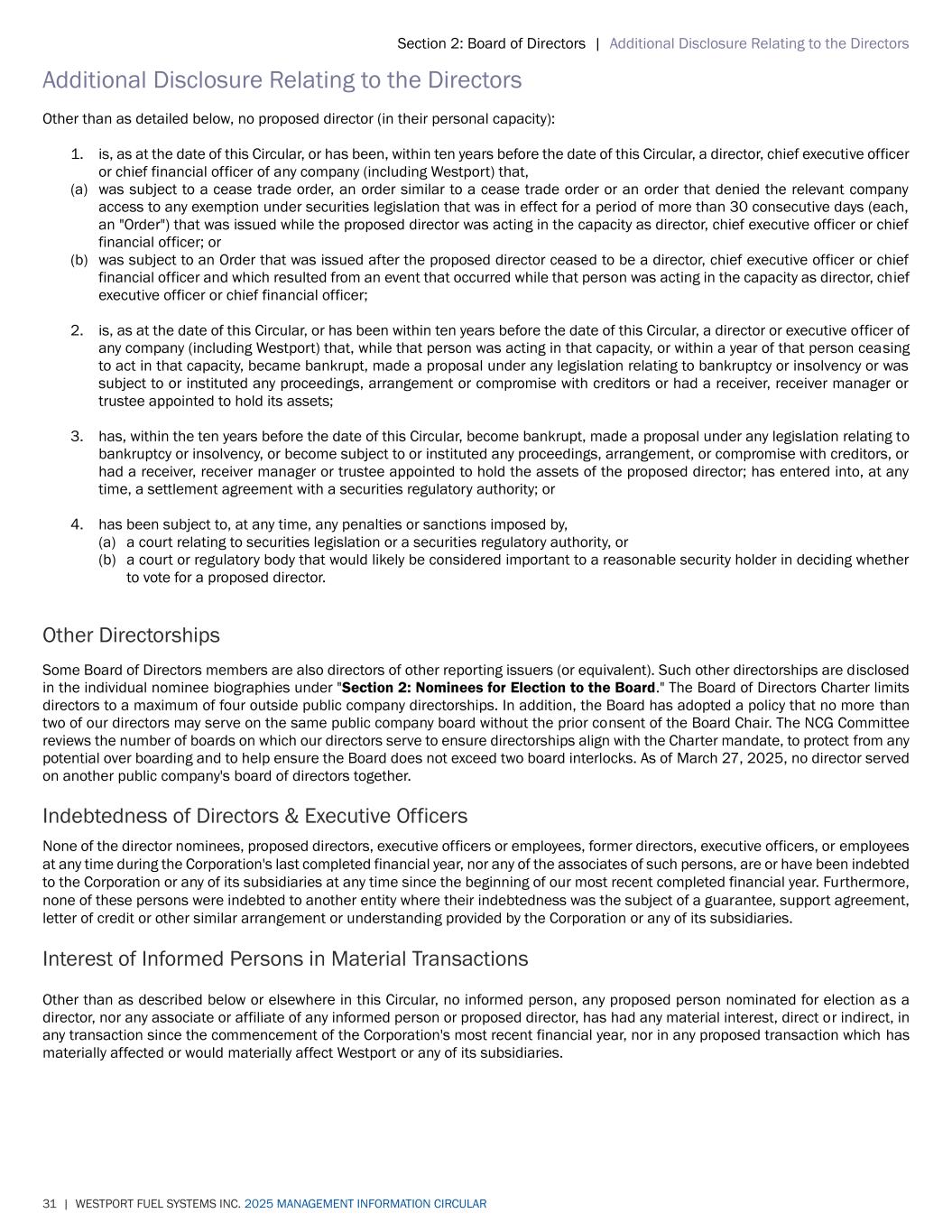 Section 2: Board of Directors | Additional Disclosure Relating to the Directors 31 | WESTPORT FUEL SYSTEMS INC. 2025 MANAGEMENT INFORMATION CIRCULAR Additional Disclosure Relating to the Directors Other than as detailed below, no proposed director (in their personal capacity): 1. is, as at the date of this Circular, or has been, within ten years before the date of this Circular, a director, chief executive officer or chief financial officer of any company (including Westport) that, (a) was subject to a cease trade order, an order similar to a cease trade order or an order that denied the relevant company access to any exemption under securities legislation that was in effect for a period of more than 30 consecutive days (each, an "Order") that was issued while the proposed director was acting in the capacity as director, chief executive officer or chief financial officer; or (b) was subject to an Order that was issued after the proposed director ceased to be a director, chief executive officer or chief financial officer and which resulted from an event that occurred while that person was acting in the capacity as director, chief executive officer or chief financial officer; 2. is, as at the date of this Circular, or has been within ten years before the date of this Circular, a director or executive officer of any company (including Westport) that, while that person was acting in that capacity, or within a year of that person ceasing to act in that capacity, became bankrupt, made a proposal under any legislation relating to bankruptcy or insolvency or was subject to or instituted any proceedings, arrangement or compromise with creditors or had a receiver, receiver manager or trustee appointed to hold its assets; 3. has, within the ten years before the date of this Circular, become bankrupt, made a proposal under any legislation relating to bankruptcy or insolvency, or become subject to or instituted any proceedings, arrangement, or compromise with creditors, or had a receiver, receiver manager or trustee appointed to hold the assets of the proposed director; has entered into, at any time, a settlement agreement with a securities regulatory authority; or 4. has been subject to, at any time, any penalties or sanctions imposed by, (a) a court relating to securities legislation or a securities regulatory authority, or (b) a court or regulatory body that would likely be considered important to a reasonable security holder in deciding whether to vote for a proposed director. Other Directorships Some Board of Directors members are also directors of other reporting issuers (or equivalent). Such other directorships are disclosed in the individual nominee biographies under "Section 2: Nominees for Election to the Board." The Board of Directors Charter limits directors to a maximum of four outside public company directorships. In addition, the Board has adopted a policy that no more than two of our directors may serve on the same public company board without the prior consent of the Board Chair. The NCG Committee reviews the number of boards on which our directors serve to ensure directorships align with the Charter mandate, to protect from any potential over boarding and to help ensure the Board does not exceed two board interlocks. As of March 27, 2025, no director served on another public company's board of directors together. Indebtedness of Directors & Executive Officers None of the director nominees, proposed directors, executive officers or employees, former directors, executive officers, or employees at any time during the Corporation's last completed financial year, nor any of the associates of such persons, are or have been indebted to the Corporation or any of its subsidiaries at any time since the beginning of our most recent completed financial year. Furthermore, none of these persons were indebted to another entity where their indebtedness was the subject of a guarantee, support agreement, letter of credit or other similar arrangement or understanding provided by the Corporation or any of its subsidiaries. Interest of Informed Persons in Material Transactions Other than as described below or elsewhere in this Circular, no informed person, any proposed person nominated for election as a director, nor any associate or affiliate of any informed person or proposed director, has had any material interest, direct or indirect, in any transaction since the commencement of the Corporation's most recent financial year, nor in any proposed transaction which has materially affected or would materially affect Westport or any of its subsidiaries.