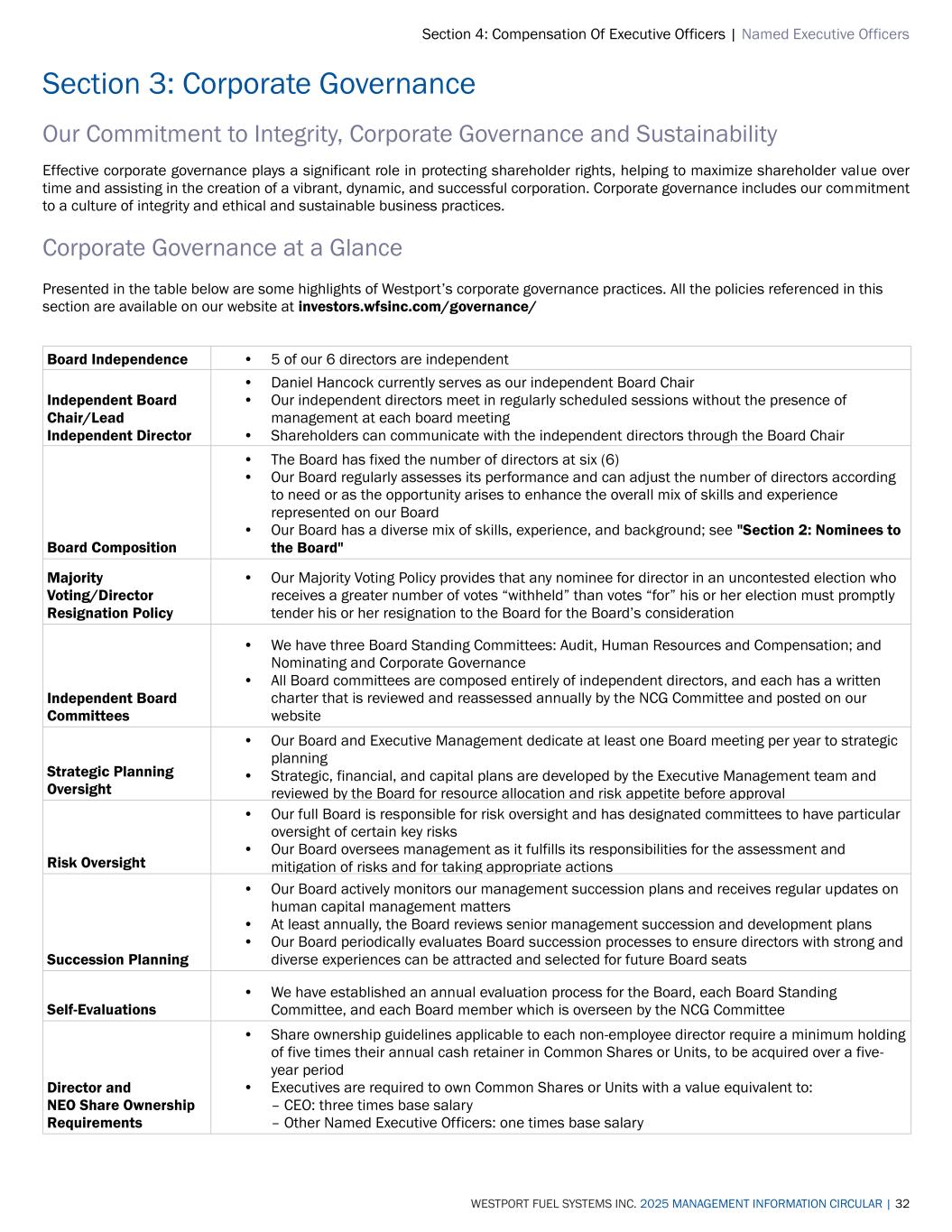 Section 4: Compensation Of Executive Officers | Named Executive Officers WESTPORT FUEL SYSTEMS INC. 2025 MANAGEMENT INFORMATION CIRCULAR | 32 Section 3: Corporate Governance Our Commitment to Integrity, Corporate Governance and Sustainability Effective corporate governance plays a significant role in protecting shareholder rights, helping to maximize shareholder value over time and assisting in the creation of a vibrant, dynamic, and successful corporation. Corporate governance includes our commitment to a culture of integrity and ethical and sustainable business practices. Corporate Governance at a Glance Presented in the table below are some highlights of Westport’s corporate governance practices. All the policies referenced in this section are available on our website at investors.wfsinc.com/governance/ Board Independence • 5 of our 6 directors are independent Independent Board Chair/Lead Independent Director • Daniel Hancock currently serves as our independent Board Chair • Our independent directors meet in regularly scheduled sessions without the presence of management at each board meeting • Shareholders can communicate with the independent directors through the Board Chair Board Composition • The Board has fixed the number of directors at six (6) • Our Board regularly assesses its performance and can adjust the number of directors according to need or as the opportunity arises to enhance the overall mix of skills and experience represented on our Board • Our Board has a diverse mix of skills, experience, and background; see "Section 2: Nominees to the Board" Majority Voting/Director Resignation Policy • Our Majority Voting Policy provides that any nominee for director in an uncontested election who receives a greater number of votes “withheld” than votes “for” his or her election must promptly tender his or her resignation to the Board for the Board’s consideration Independent Board Committees • We have three Board Standing Committees: Audit, Human Resources and Compensation; and Nominating and Corporate Governance • All Board committees are composed entirely of independent directors, and each has a written charter that is reviewed and reassessed annually by the NCG Committee and posted on our website Strategic Planning Oversight • Our Board and Executive Management dedicate at least one Board meeting per year to strategic planning • Strategic, financial, and capital plans are developed by the Executive Management team and reviewed by the Board for resource allocation and risk appetite before approval Risk Oversight • Our full Board is responsible for risk oversight and has designated committees to have particular oversight of certain key risks • Our Board oversees management as it fulfills its responsibilities for the assessment and mitigation of risks and for taking appropriate actions Succession Planning • Our Board actively monitors our management succession plans and receives regular updates on human capital management matters • At least annually, the Board reviews senior management succession and development plans • Our Board periodically evaluates Board succession processes to ensure directors with strong and diverse experiences can be attracted and selected for future Board seats Self-Evaluations • We have established an annual evaluation process for the Board, each Board Standing Committee, and each Board member which is overseen by the NCG Committee Director and NEO Share Ownership Requirements • Share ownership guidelines applicable to each non-employee director require a minimum holding of five times their annual cash retainer in Common Shares or Units, to be acquired over a five- year period • Executives are required to own Common Shares or Units with a value equivalent to: – CEO: three times base salary – Other Named Executive Officers: one times base salary