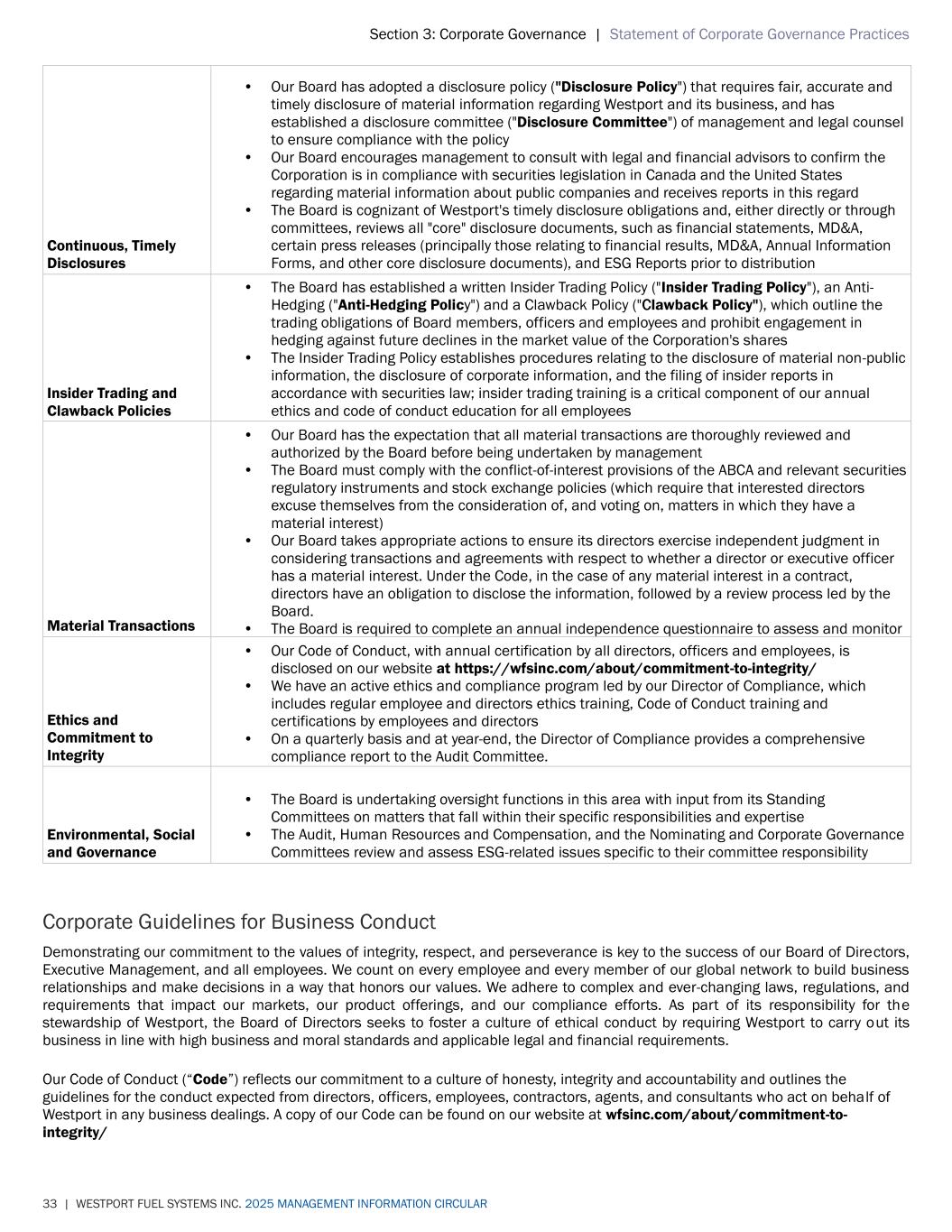 Section 3: Corporate Governance | Statement of Corporate Governance Practices 33 | WESTPORT FUEL SYSTEMS INC. 2025 MANAGEMENT INFORMATION CIRCULAR Continuous, Timely Disclosures • Our Board has adopted a disclosure policy ("Disclosure Policy") that requires fair, accurate and timely disclosure of material information regarding Westport and its business, and has established a disclosure committee ("Disclosure Committee") of management and legal counsel to ensure compliance with the policy • Our Board encourages management to consult with legal and financial advisors to confirm the Corporation is in compliance with securities legislation in Canada and the United States regarding material information about public companies and receives reports in this regard • The Board is cognizant of Westport's timely disclosure obligations and, either directly or through committees, reviews all "core" disclosure documents, such as financial statements, MD&A, certain press releases (principally those relating to financial results, MD&A, Annual Information Forms, and other core disclosure documents), and ESG Reports prior to distribution Insider Trading and Clawback Policies • The Board has established a written Insider Trading Policy ("Insider Trading Policy"), an Anti- Hedging ("Anti-Hedging Policy") and a Clawback Policy ("Clawback Policy"), which outline the trading obligations of Board members, officers and employees and prohibit engagement in hedging against future declines in the market value of the Corporation's shares • The Insider Trading Policy establishes procedures relating to the disclosure of material non-public information, the disclosure of corporate information, and the filing of insider reports in accordance with securities law; insider trading training is a critical component of our annual ethics and code of conduct education for all employees Material Transactions • Our Board has the expectation that all material transactions are thoroughly reviewed and authorized by the Board before being undertaken by management • The Board must comply with the conflict-of-interest provisions of the ABCA and relevant securities regulatory instruments and stock exchange policies (which require that interested directors excuse themselves from the consideration of, and voting on, matters in which they have a material interest) • Our Board takes appropriate actions to ensure its directors exercise independent judgment in considering transactions and agreements with respect to whether a director or executive officer has a material interest. Under the Code, in the case of any material interest in a contract, directors have an obligation to disclose the information, followed by a review process led by the Board. • The Board is required to complete an annual independence questionnaire to assess and monitor any material transactions. Ethics and Commitment to Integrity • Our Code of Conduct, with annual certification by all directors, officers and employees, is disclosed on our website at https://wfsinc.com/about/commitment-to-integrity/ • We have an active ethics and compliance program led by our Director of Compliance, which includes regular employee and directors ethics training, Code of Conduct training and certifications by employees and directors • On a quarterly basis and at year-end, the Director of Compliance provides a comprehensive compliance report to the Audit Committee. Environmental, Social and Governance • The Board is undertaking oversight functions in this area with input from its Standing Committees on matters that fall within their specific responsibilities and expertise • The Audit, Human Resources and Compensation, and the Nominating and Corporate Governance Committees review and assess ESG-related issues specific to their committee responsibility Corporate Guidelines for Business Conduct Demonstrating our commitment to the values of integrity, respect, and perseverance is key to the success of our Board of Directors, Executive Management, and all employees. We count on every employee and every member of our global network to build business relationships and make decisions in a way that honors our values. We adhere to complex and ever-changing laws, regulations, and requirements that impact our markets, our product offerings, and our compliance efforts. As part of its responsibility for the stewardship of Westport, the Board of Directors seeks to foster a culture of ethical conduct by requiring Westport to carry out its business in line with high business and moral standards and applicable legal and financial requirements. Our Code of Conduct (“Code”) reflects our commitment to a culture of honesty, integrity and accountability and outlines the guidelines for the conduct expected from directors, officers, employees, contractors, agents, and consultants who act on behalf of Westport in any business dealings. A copy of our Code can be found on our website at wfsinc.com/about/commitment-to- integrity/