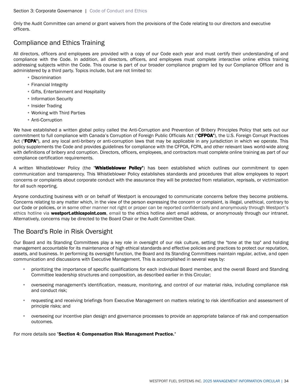 Section 3: Corporate Governance | Code of Conduct and Ethics WESTPORT FUEL SYSTEMS INC. 2025 MANAGEMENT INFORMATION CIRCULAR | 34 Only the Audit Committee can amend or grant waivers from the provisions of the Code relating to our directors and executive officers. Compliance and Ethics Training All directors, officers and employees are provided with a copy of our Code each year and must certify their understanding of and compliance with the Code. In addition, all directors, officers, and employees must complete interactive online ethics training addressing subjects within the Code. This course is part of our broader compliance program led by our Compliance Officer and is administered by a third party. Topics include, but are not limited to: • Discrimination • Financial Integrity • Gifts, Entertainment and Hospitality • Information Security • Insider Trading • Working with Third Parties • Anti-Corruption We have established a written global policy called the Anti-Corruption and Prevention of Bribery Principles Policy that sets out our commitment to full compliance with Canada’s Corruption of Foreign Public Officials Act ("CFPOA"), the U.S. Foreign Corrupt Practices Act ("FCPA"), and any local anti-bribery or anti-corruption laws that may be applicable in any jurisdiction in which we operate. This policy supplements the Code and provides guidelines for compliance with the CFPOA, FCPA, and other relevant laws world-wide along with definitions of bribery and corruption. Directors, officers, employees, and contractors must complete online training as part of our compliance certification requirements. A written Whistleblower Policy (the "Whistleblower Policy") has been established which outlines our commitment to open communication and transparency. This Whistleblower Policy establishes standards and procedures that allow employees to report concerns or complaints about corporate conduct with the assurance they will be protected from retaliation, reprisals, or victimization for all such reporting. Anyone conducting business with or on behalf of Westport is encouraged to communicate concerns before they become problems. Concerns relating to any matter which, in the view of the person expressing the concern or complaint, is illegal, unethical, contrary to our Code or policies, or in some other manner not right or proper can be reported confidentially and anonymously through Westport’s ethics hotline via westport.ethicspoint.com, email to the ethics hotline alert email address, or anonymously through our intranet. Alternatively, concerns may be directed to the Board Chair or the Audit Committee Chair. The Board's Role in Risk Oversight Our Board and its Standing Committees play a key role in oversight of our risk culture, setting the "tone at the top" and holding management accountable for its maintenance of high ethical standards and effective policies and practices to protect our reputation, assets, and business. In performing its oversight function, the Board and its Standing Committees maintain regular, active, and open communication and discussions with Executive Management. This is accomplished in several ways by: • prioritizing the importance of specific qualifications for each individual Board member, and the overall Board and Standing Committee leadership structures and composition, as described earlier in this Circular; • overseeing management's identification, measure, monitoring, and control of our material risks, including compliance risk and conduct risk; • requesting and receiving briefings from Executive Management on matters relating to risk identification and assessment of principle risks; and • overseeing our incentive plan design and governance processes to provide an appropriate balance of risk and compensation outcomes. For more details see "Section 4: Compensation Risk Management Practice."