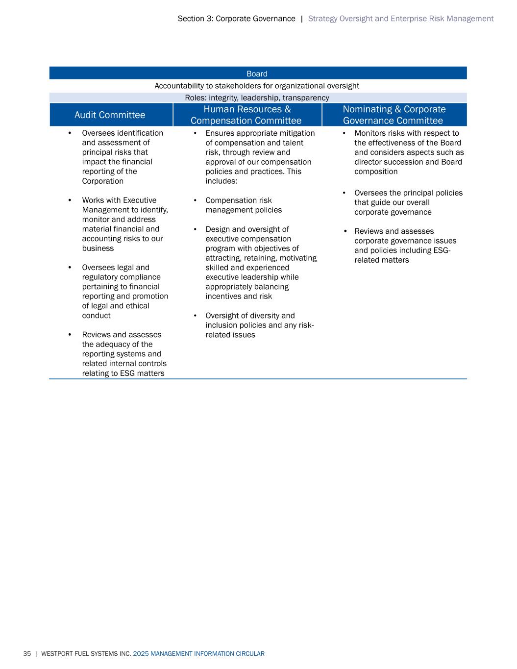 Section 3: Corporate Governance | Strategy Oversight and Enterprise Risk Management 35 | WESTPORT FUEL SYSTEMS INC. 2025 MANAGEMENT INFORMATION CIRCULAR Board Accountability to stakeholders for organizational oversight Roles: integrity, leadership, transparency Audit Committee Human Resources & Compensation Committee Nominating & Corporate Governance Committee • Oversees identification and assessment of principal risks that impact the financial reporting of the Corporation • Works with Executive Management to identify, monitor and address material financial and accounting risks to our business • Oversees legal and regulatory compliance pertaining to financial reporting and promotion of legal and ethical conduct • Reviews and assesses the adequacy of the reporting systems and related internal controls relating to ESG matters • Ensures appropriate mitigation of compensation and talent risk, through review and approval of our compensation policies and practices. This includes: • Compensation risk management policies • Design and oversight of executive compensation program with objectives of attracting, retaining, motivating skilled and experienced executive leadership while appropriately balancing incentives and risk • Oversight of diversity and inclusion policies and any risk- related issues • Monitors risks with respect to the effectiveness of the Board and considers aspects such as director succession and Board composition • Oversees the principal policies that guide our overall corporate governance • Reviews and assesses corporate governance issues and policies including ESG- related matters