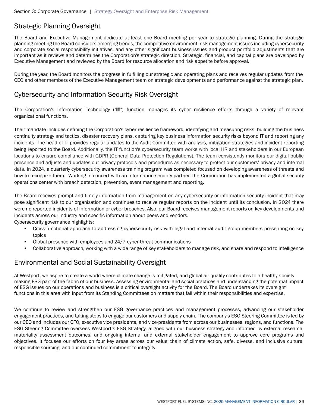Section 3: Corporate Governance | Strategy Oversight and Enterprise Risk Management WESTPORT FUEL SYSTEMS INC. 2025 MANAGEMENT INFORMATION CIRCULAR | 36 Strategic Planning Oversight The Board and Executive Management dedicate at least one Board meeting per year to strategic planning. During the strategic planning meeting the Board considers emerging trends, the competitive environment, risk management issues including cybersecurity and corporate social responsibility initiatives, and any other significant business issues and product portfolio adjustments that are important as it reviews and determines the Corporation's strategic direction. Strategic, financial, and capital plans are developed by Executive Management and reviewed by the Board for resource allocation and risk appetite before approval. During the year, the Board monitors the progress in fulfilling our strategic and operating plans and receives regular updates from the CEO and other members of the Executive Management team on strategic developments and performance against the strategic plan. Cybersecurity and Information Security Risk Oversight The Corporation's Information Technology ("IT") function manages its cyber resilience efforts through a variety of relevant organizational functions. Their mandate includes defining the Corporation's cyber resilience framework, identifying and measuring risks, building the business continuity strategy and tactics, disaster recovery plans, capturing key business information security risks beyond IT and reporting any incidents. The head of IT provides regular updates to the Audit Committee with analysis, mitigation strategies and incident reporting being reported to the Board. Additionally, the IT function's cybersecurity team works with local HR and stakeholders in our European locations to ensure compliance with GDPR (General Data Protection Regulations). The team consistently monitors our digital public presence and adjusts and updates our privacy protocols and procedures as necessary to protect our customers' privacy and internal data. In 2024, a quarterly cybersecurity awareness training program was completed focused on developing awareness of threats and how to recognize them. Working in concert with an information security partner, the Corporation has implemented a global security operations center with breach detection, prevention, event management and reporting. The Board receives prompt and timely information from management on any cybersecurity or information security incident that may pose significant risk to our organization and continues to receive regular reports on the incident until its conclusion. In 2024 there were no reported incidents of information or cyber breaches. Also, our Board receives management reports on key developments and incidents across our industry and specific information about peers and vendors. Cybersecurity governance highlights: • Cross-functional approach to addressing cybersecurity risk with legal and internal audit group members presenting on key topics • Global presence with employees and 24/7 cyber threat communications • Collaborative approach, working with a wide range of key stakeholders to manage risk, and share and respond to intelligence Environmental and Social Sustainability Oversight At Westport, we aspire to create a world where climate change is mitigated, and global air quality contributes to a healthy society making ESG part of the fabric of our business. Assessing environmental and social practices and understanding the potential impact of ESG issues on our operations and business is a critical oversight activity for the Board. The Board undertakes its oversight functions in this area with input from its Standing Committees on matters that fall within their responsibilities and expertise. We continue to review and strengthen our ESG governance practices and management processes, advancing our stakeholder engagement practices, and taking steps to engage our customers and supply chain. The company's ESG Steering Committee is led by our CEO and includes our CFO, executive vice presidents, and vice-presidents from across our businesses, regions, and functions. The ESG Steering Committee oversees Westport’s ESG Strategy, aligned with our business strategy and informed by external research, materiality assessment outcomes, and ongoing internal and external stakeholder engagement to approve core programs and objectives. It focuses our efforts on four key areas across our value chain of climate action, safe, diverse, and inclusive culture, responsible sourcing, and our continued commitment to integrity.
