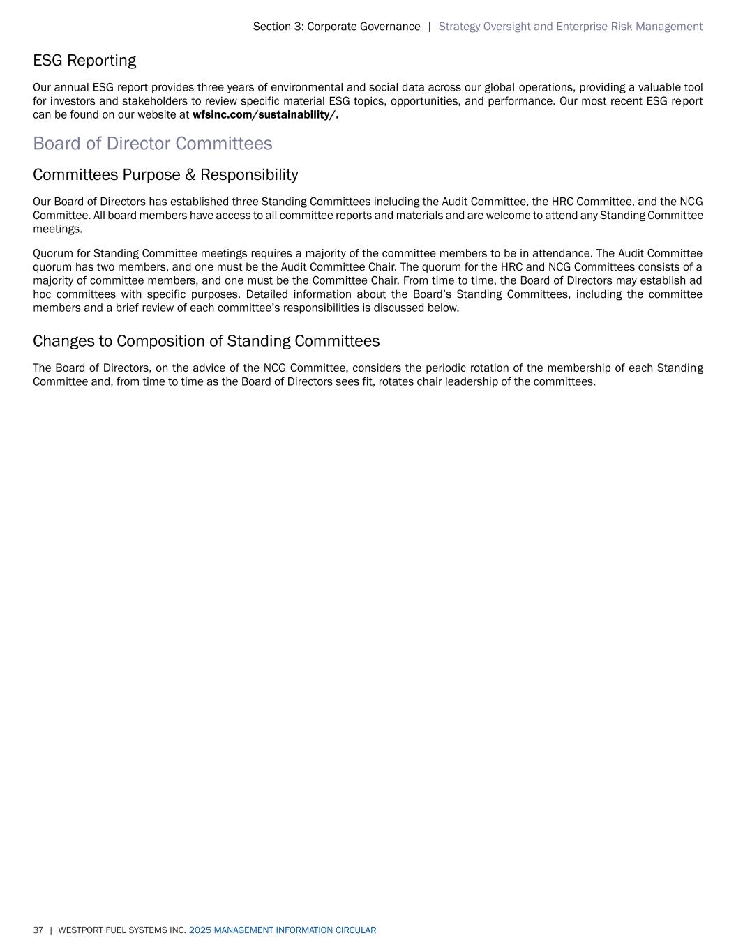 Section 3: Corporate Governance | Strategy Oversight and Enterprise Risk Management 37 | WESTPORT FUEL SYSTEMS INC. 2025 MANAGEMENT INFORMATION CIRCULAR ESG Reporting Our annual ESG report provides three years of environmental and social data across our global operations, providing a valuable tool for investors and stakeholders to review specific material ESG topics, opportunities, and performance. Our most recent ESG report can be found on our website at wfsinc.com/sustainability/. Board of Director Committees Committees Purpose & Responsibility Our Board of Directors has established three Standing Committees including the Audit Committee, the HRC Committee, and the NCG Committee. All board members have access to all committee reports and materials and are welcome to attend any Standing Committee meetings. Quorum for Standing Committee meetings requires a majority of the committee members to be in attendance. The Audit Committee quorum has two members, and one must be the Audit Committee Chair. The quorum for the HRC and NCG Committees consists of a majority of committee members, and one must be the Committee Chair. From time to time, the Board of Directors may establish ad hoc committees with specific purposes. Detailed information about the Board’s Standing Committees, including the committee members and a brief review of each committee’s responsibilities is discussed below. Changes to Composition of Standing Committees The Board of Directors, on the advice of the NCG Committee, considers the periodic rotation of the membership of each Standing Committee and, from time to time as the Board of Directors sees fit, rotates chair leadership of the committees.