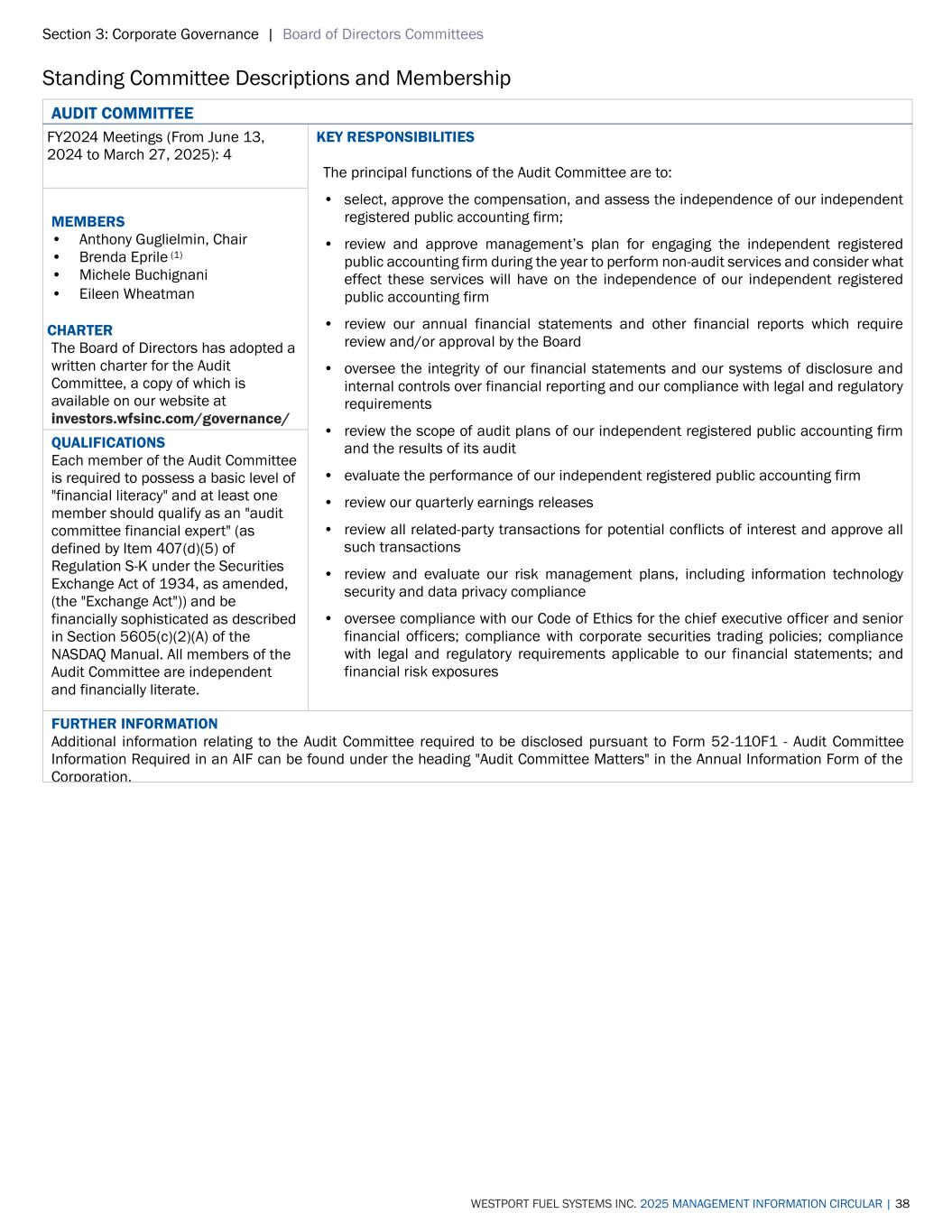 Section 3: Corporate Governance | Board of Directors Committees WESTPORT FUEL SYSTEMS INC. 2025 MANAGEMENT INFORMATION CIRCULAR | 38 Standing Committee Descriptions and Membership AUDIT COMMITTEE FY2024 Meetings (From June 13, 2024 to March 27, 2025): 4 KEY RESPONSIBILITIES The principal functions of the Audit Committee are to: • select, approve the compensation, and assess the independence of our independent registered public accounting firm; • review and approve management’s plan for engaging the independent registered public accounting firm during the year to perform non-audit services and consider what effect these services will have on the independence of our independent registered public accounting firm • review our annual financial statements and other financial reports which require review and/or approval by the Board • oversee the integrity of our financial statements and our systems of disclosure and internal controls over financial reporting and our compliance with legal and regulatory requirements • review the scope of audit plans of our independent registered public accounting firm and the results of its audit • evaluate the performance of our independent registered public accounting firm • review our quarterly earnings releases • review all related-party transactions for potential conflicts of interest and approve all such transactions • review and evaluate our risk management plans, including information technology security and data privacy compliance • oversee compliance with our Code of Ethics for the chief executive officer and senior financial officers; compliance with corporate securities trading policies; compliance with legal and regulatory requirements applicable to our financial statements; and financial risk exposures MEMBERS • Anthony Guglielmin, Chair • Brenda Eprile (1) • Michele Buchignani • Eileen Wheatman CHARTER The Board of Directors has adopted a written charter for the Audit Committee, a copy of which is available on our website at investors.wfsinc.com/governance/ QUALIFICATIONS Each member of the Audit Committee is required to possess a basic level of "financial literacy" and at least one member should qualify as an "audit committee financial expert" (as defined by Item 407(d)(5) of Regulation S-K under the Securities Exchange Act of 1934, as amended, (the "Exchange Act")) and be financially sophisticated as described in Section 5605(c)(2)(A) of the NASDAQ Manual. All members of the Audit Committee are independent and financially literate. FURTHER INFORMATION Additional information relating to the Audit Committee required to be disclosed pursuant to Form 52-110F1 - Audit Committee Information Required in an AIF can be found under the heading "Audit Committee Matters" in the Annual Information Form of the Corporation.