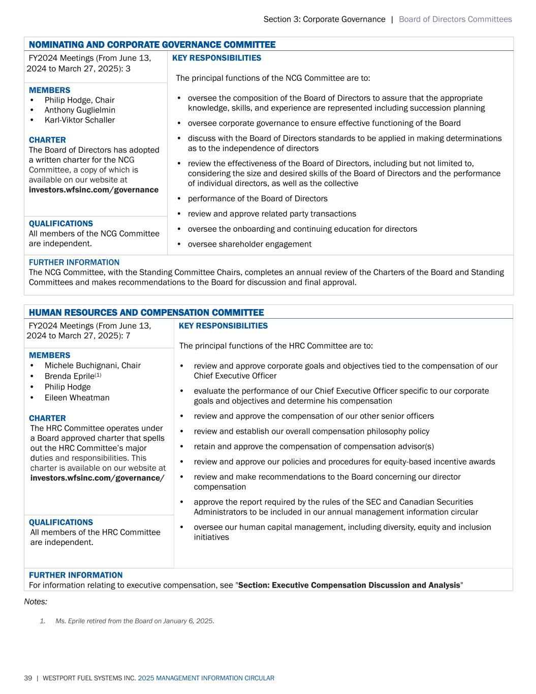 Section 3: Corporate Governance | Board of Directors Committees 39 | WESTPORT FUEL SYSTEMS INC. 2025 MANAGEMENT INFORMATION CIRCULAR NOMINATING AND CORPORATE GOVERNANCE COMMITTEE FY2024 Meetings (From June 13, 2024 to March 27, 2025): 3 KEY RESPONSIBILITIES The principal functions of the NCG Committee are to: • oversee the composition of the Board of Directors to assure that the appropriate knowledge, skills, and experience are represented including succession planning • oversee corporate governance to ensure effective functioning of the Board • discuss with the Board of Directors standards to be applied in making determinations as to the independence of directors • review the effectiveness of the Board of Directors, including but not limited to, considering the size and desired skills of the Board of Directors and the performance of individual directors, as well as the collective • performance of the Board of Directors • review and approve related party transactions • oversee the onboarding and continuing education for directors • oversee shareholder engagement MEMBERS • Philip Hodge, Chair • Anthony Guglielmin • Karl-Viktor Schaller CHARTER The Board of Directors has adopted a written charter for the NCG Committee, a copy of which is available on our website at investors.wfsinc.com/governance QUALIFICATIONS All members of the NCG Committee are independent. FURTHER INFORMATION The NCG Committee, with the Standing Committee Chairs, completes an annual review of the Charters of the Board and Standing Committees and makes recommendations to the Board for discussion and final approval. HUMAN RESOURCES AND COMPENSATION COMMITTEE FY2024 Meetings (From June 13, 2024 to March 27, 2025): 7 KEY RESPONSIBILITIES The principal functions of the HRC Committee are to: • review and approve corporate goals and objectives tied to the compensation of our Chief Executive Officer • evaluate the performance of our Chief Executive Officer specific to our corporate goals and objectives and determine his compensation • review and approve the compensation of our other senior officers • review and establish our overall compensation philosophy policy • retain and approve the compensation of compensation advisor(s) • review and approve our policies and procedures for equity-based incentive awards • review and make recommendations to the Board concerning our director compensation • approve the report required by the rules of the SEC and Canadian Securities Administrators to be included in our annual management information circular • oversee our human capital management, including diversity, equity and inclusion initiatives MEMBERS • Michele Buchignani, Chair • Brenda Eprile(1) • Philip Hodge • Eileen Wheatman CHARTER The HRC Committee operates under a Board approved charter that spells out the HRC Committee’s major duties and responsibilities. This charter is available on our website at investors.wfsinc.com/governance/ QUALIFICATIONS All members of the HRC Committee are independent. FURTHER INFORMATION For information relating to executive compensation, see "Section: Executive Compensation Discussion and Analysis" Notes: 1. Ms. Eprile retired from the Board on January 6, 2025.