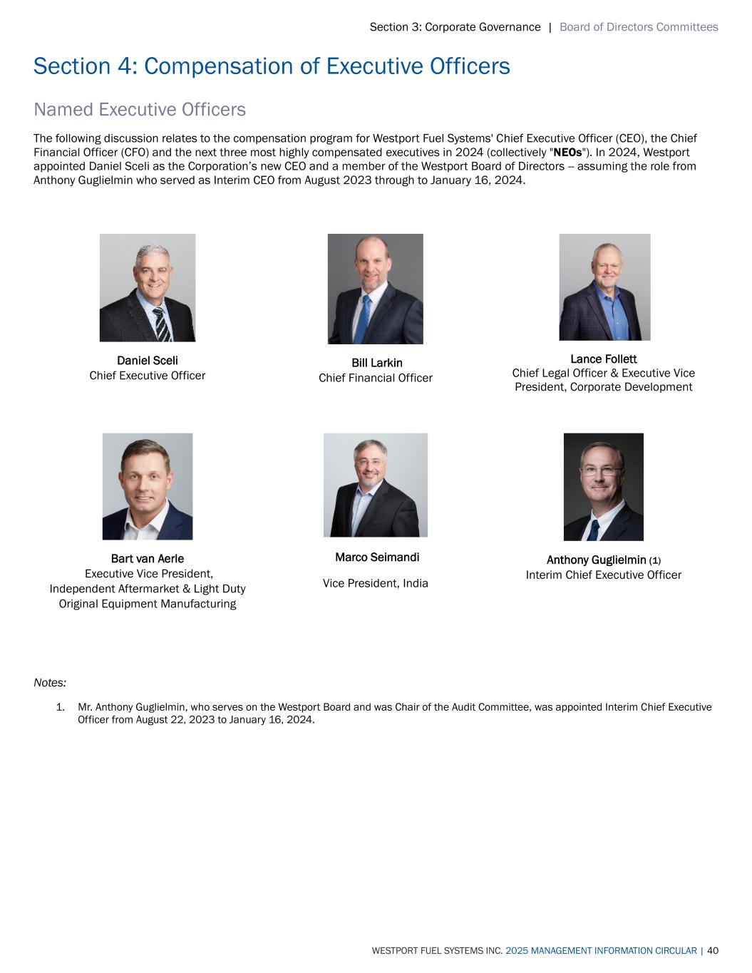 Section 3: Corporate Governance | Board of Directors Committees WESTPORT FUEL SYSTEMS INC. 2025 MANAGEMENT INFORMATION CIRCULAR | 40 Section 4: Compensation of Executive Officers Named Executive Officers The following discussion relates to the compensation program for Westport Fuel Systems' Chief Executive Officer (CEO), the Chief Financial Officer (CFO) and the next three most highly compensated executives in 2024 (collectively "NEOs"). In 2024, Westport appointed Daniel Sceli as the Corporation’s new CEO and a member of the Westport Board of Directors -- assuming the role from Anthony Guglielmin who served as Interim CEO from August 2023 through to January 16, 2024. Daniel Sceli Chief Executive Officer Bill Larkin Chief Financial Officer Lance Follett Chief Legal Officer & Executive Vice President, Corporate Development Bart van Aerle Executive Vice President, Independent Aftermarket & Light Duty Original Equipment Manufacturing Marco Seimandi Vice President, India Anthony Guglielmin (1) Interim Chief Executive Officer Notes: 1. Mr. Anthony Guglielmin, who serves on the Westport Board and was Chair of the Audit Committee, was appointed Interim Chief Executive Officer from August 22, 2023 to January 16, 2024.