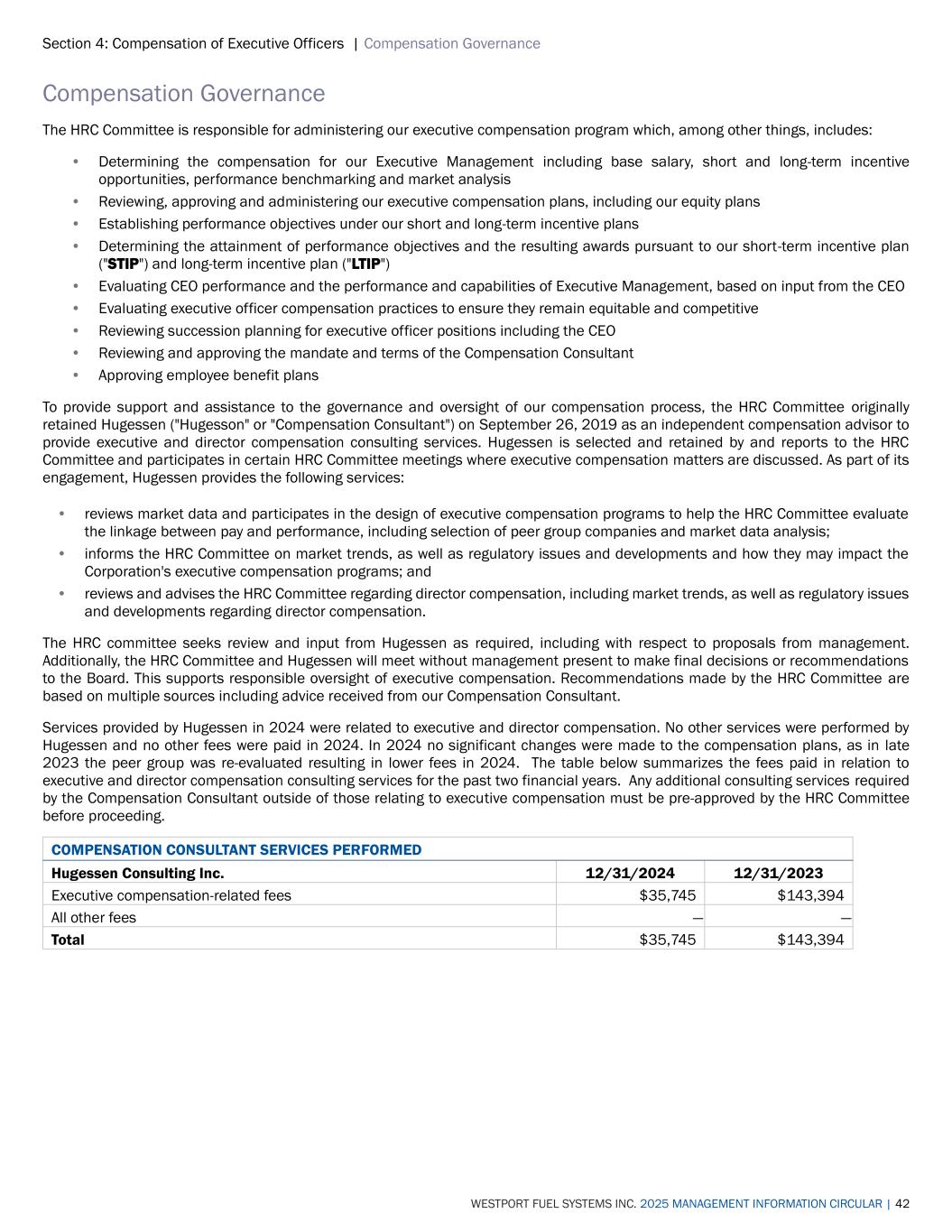Section 4: Compensation of Executive Officers | Compensation Governance WESTPORT FUEL SYSTEMS INC. 2025 MANAGEMENT INFORMATION CIRCULAR | 42 Compensation Governance The HRC Committee is responsible for administering our executive compensation program which, among other things, includes: • Determining the compensation for our Executive Management including base salary, short and long-term incentive opportunities, performance benchmarking and market analysis • Reviewing, approving and administering our executive compensation plans, including our equity plans • Establishing performance objectives under our short and long-term incentive plans • Determining the attainment of performance objectives and the resulting awards pursuant to our short-term incentive plan ("STIP") and long-term incentive plan ("LTIP") • Evaluating CEO performance and the performance and capabilities of Executive Management, based on input from the CEO • Evaluating executive officer compensation practices to ensure they remain equitable and competitive • Reviewing succession planning for executive officer positions including the CEO • Reviewing and approving the mandate and terms of the Compensation Consultant • Approving employee benefit plans To provide support and assistance to the governance and oversight of our compensation process, the HRC Committee originally retained Hugessen ("Hugesson" or "Compensation Consultant") on September 26, 2019 as an independent compensation advisor to provide executive and director compensation consulting services. Hugessen is selected and retained by and reports to the HRC Committee and participates in certain HRC Committee meetings where executive compensation matters are discussed. As part of its engagement, Hugessen provides the following services: • reviews market data and participates in the design of executive compensation programs to help the HRC Committee evaluate the linkage between pay and performance, including selection of peer group companies and market data analysis; • informs the HRC Committee on market trends, as well as regulatory issues and developments and how they may impact the Corporation's executive compensation programs; and • reviews and advises the HRC Committee regarding director compensation, including market trends, as well as regulatory issues and developments regarding director compensation. The HRC committee seeks review and input from Hugessen as required, including with respect to proposals from management. Additionally, the HRC Committee and Hugessen will meet without management present to make final decisions or recommendations to the Board. This supports responsible oversight of executive compensation. Recommendations made by the HRC Committee are based on multiple sources including advice received from our Compensation Consultant. Services provided by Hugessen in 2024 were related to executive and director compensation. No other services were performed by Hugessen and no other fees were paid in 2024. In 2024 no significant changes were made to the compensation plans, as in late 2023 the peer group was re-evaluated resulting in lower fees in 2024. The table below summarizes the fees paid in relation to executive and director compensation consulting services for the past two financial years. Any additional consulting services required by the Compensation Consultant outside of those relating to executive compensation must be pre-approved by the HRC Committee before proceeding. COMPENSATION CONSULTANT SERVICES PERFORMED Hugessen Consulting Inc. 12/31/2024 12/31/2023 Executive compensation-related fees $35,745 $143,394 All other fees — — Total $35,745 $143,394