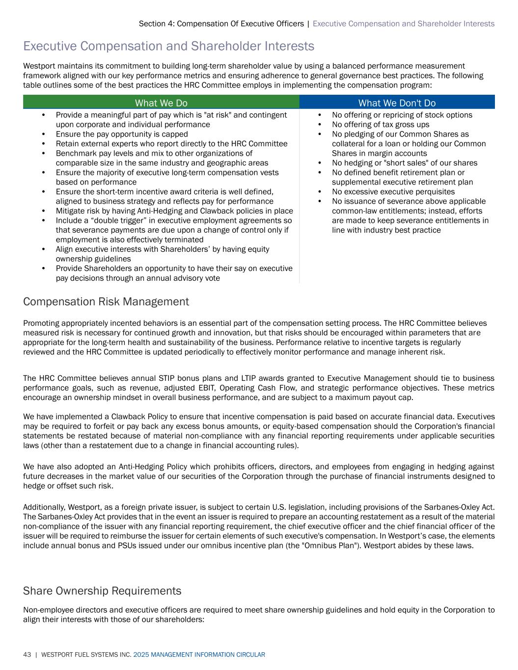 Section 4: Compensation Of Executive Officers | Executive Compensation and Shareholder Interests 43 | WESTPORT FUEL SYSTEMS INC. 2025 MANAGEMENT INFORMATION CIRCULAR Executive Compensation and Shareholder Interests Westport maintains its commitment to building long-term shareholder value by using a balanced performance measurement framework aligned with our key performance metrics and ensuring adherence to general governance best practices. The following table outlines some of the best practices the HRC Committee employs in implementing the compensation program: What We Do What We Don't Do • Provide a meaningful part of pay which is "at risk" and contingent upon corporate and individual performance • Ensure the pay opportunity is capped • Retain external experts who report directly to the HRC Committee • Benchmark pay levels and mix to other organizations of comparable size in the same industry and geographic areas • Ensure the majority of executive long-term compensation vests based on performance • Ensure the short-term incentive award criteria is well defined, aligned to business strategy and reflects pay for performance • Mitigate risk by having Anti-Hedging and Clawback policies in place • Include a “double trigger” in executive employment agreements so that severance payments are due upon a change of control only if employment is also effectively terminated • Align executive interests with Shareholders’ by having equity ownership guidelines • Provide Shareholders an opportunity to have their say on executive pay decisions through an annual advisory vote • No offering or repricing of stock options • No offering of tax gross ups • No pledging of our Common Shares as collateral for a loan or holding our Common Shares in margin accounts • No hedging or "short sales" of our shares • No defined benefit retirement plan or supplemental executive retirement plan • No excessive executive perquisites • No issuance of severance above applicable common-law entitlements; instead, efforts are made to keep severance entitlements in line with industry best practice Compensation Risk Management Promoting appropriately incented behaviors is an essential part of the compensation setting process. The HRC Committee believes measured risk is necessary for continued growth and innovation, but that risks should be encouraged within parameters that are appropriate for the long-term health and sustainability of the business. Performance relative to incentive targets is regularly reviewed and the HRC Committee is updated periodically to effectively monitor performance and manage inherent risk. The HRC Committee believes annual STIP bonus plans and LTIP awards granted to Executive Management should tie to business performance goals, such as revenue, adjusted EBIT, Operating Cash Flow, and strategic performance objectives. These metrics encourage an ownership mindset in overall business performance, and are subject to a maximum payout cap. We have implemented a Clawback Policy to ensure that incentive compensation is paid based on accurate financial data. Executives may be required to forfeit or pay back any excess bonus amounts, or equity-based compensation should the Corporation's financial statements be restated because of material non-compliance with any financial reporting requirements under applicable securities laws (other than a restatement due to a change in financial accounting rules). We have also adopted an Anti-Hedging Policy which prohibits officers, directors, and employees from engaging in hedging against future decreases in the market value of our securities of the Corporation through the purchase of financial instruments designed to hedge or offset such risk. Additionally, Westport, as a foreign private issuer, is subject to certain U.S. legislation, including provisions of the Sarbanes-Oxley Act. The Sarbanes-Oxley Act provides that in the event an issuer is required to prepare an accounting restatement as a result of the material non-compliance of the issuer with any financial reporting requirement, the chief executive officer and the chief financial officer of the issuer will be required to reimburse the issuer for certain elements of such executive's compensation. In Westport’s case, the elements include annual bonus and PSUs issued under our omnibus incentive plan (the "Omnibus Plan"). Westport abides by these laws. Share Ownership Requirements Non-employee directors and executive officers are required to meet share ownership guidelines and hold equity in the Corporation to align their interests with those of our shareholders:
