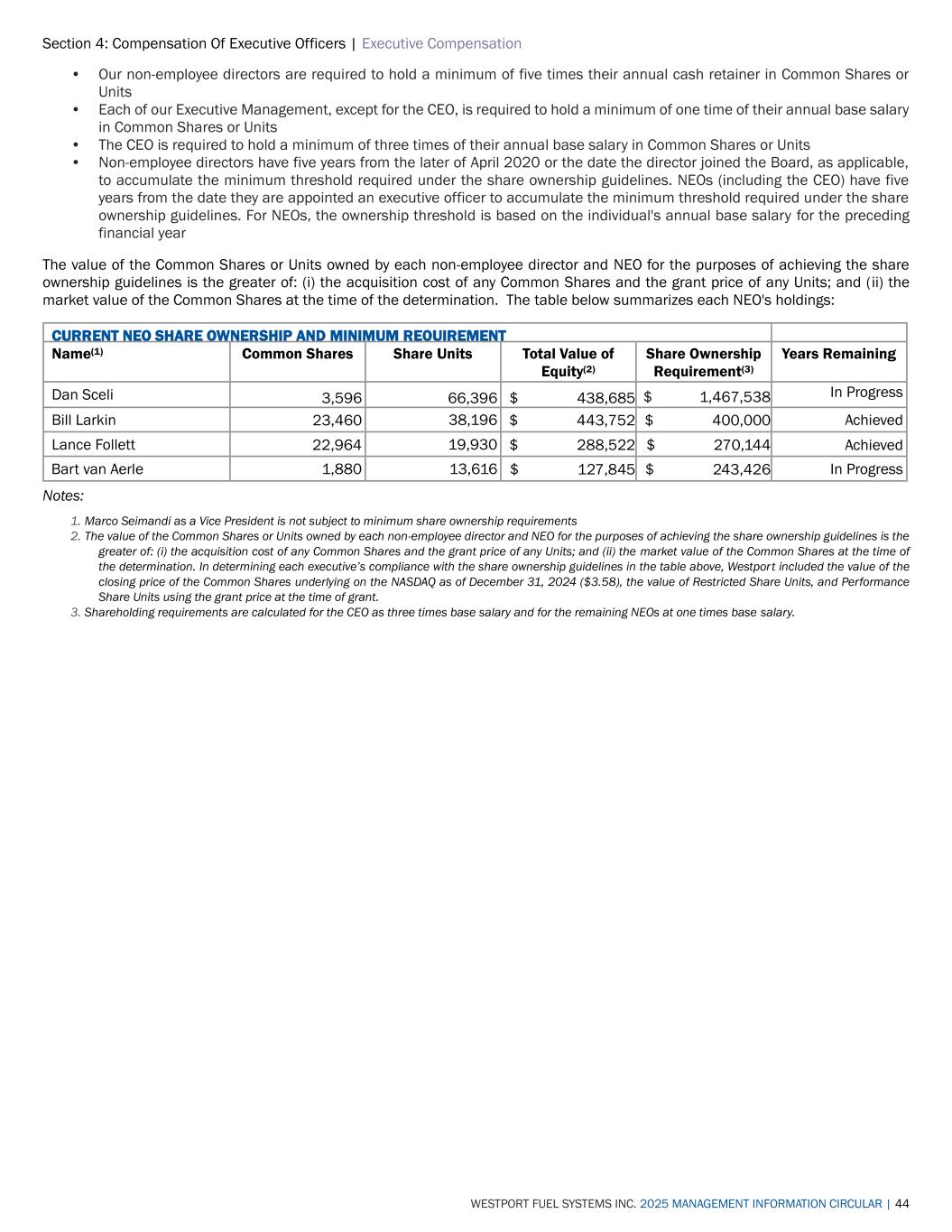 Section 4: Compensation Of Executive Officers | Executive Compensation WESTPORT FUEL SYSTEMS INC. 2025 MANAGEMENT INFORMATION CIRCULAR | 44 • Our non-employee directors are required to hold a minimum of five times their annual cash retainer in Common Shares or Units • Each of our Executive Management, except for the CEO, is required to hold a minimum of one time of their annual base salary in Common Shares or Units • The CEO is required to hold a minimum of three times of their annual base salary in Common Shares or Units • Non-employee directors have five years from the later of April 2020 or the date the director joined the Board, as applicable, to accumulate the minimum threshold required under the share ownership guidelines. NEOs (including the CEO) have five years from the date they are appointed an executive officer to accumulate the minimum threshold required under the share ownership guidelines. For NEOs, the ownership threshold is based on the individual's annual base salary for the preceding financial year The value of the Common Shares or Units owned by each non-employee director and NEO for the purposes of achieving the share ownership guidelines is the greater of: (i) the acquisition cost of any Common Shares and the grant price of any Units; and (ii) the market value of the Common Shares at the time of the determination. The table below summarizes each NEO's holdings: CURRENT NEO SHARE OWNERSHIP AND MINIMUM REQUIREMENT Name(1) Common Shares Share Units Total Value of Equity(2) Share Ownership Requirement(3) Years Remaining Dan Sceli 3,596 66,396 $ 438,685 $ 1,467,538 In Progress Bill Larkin 23,460 38,196 $ 443,752 $ 400,000 Achieved Lance Follett 22,964 19,930 $ 288,522 $ 270,144 Achieved Bart van Aerle 1,880 13,616 $ 127,845 $ 243,426 In Progress Notes: 1. Marco Seimandi as a Vice President is not subject to minimum share ownership requirements 2. The value of the Common Shares or Units owned by each non-employee director and NEO for the purposes of achieving the share ownership guidelines is the greater of: (i) the acquisition cost of any Common Shares and the grant price of any Units; and (ii) the market value of the Common Shares at the time of the determination. In determining each executive’s compliance with the share ownership guidelines in the table above, Westpor t included the value of the closing price of the Common Shares underlying on the NASDAQ as of December 31, 2024 ($3.58), the value of Restricted Share Units, and Performance Share Units using the grant price at the time of grant. 3. Shareholding requirements are calculated for the CEO as three times base salary and for the remaining NEOs at one times base salary.