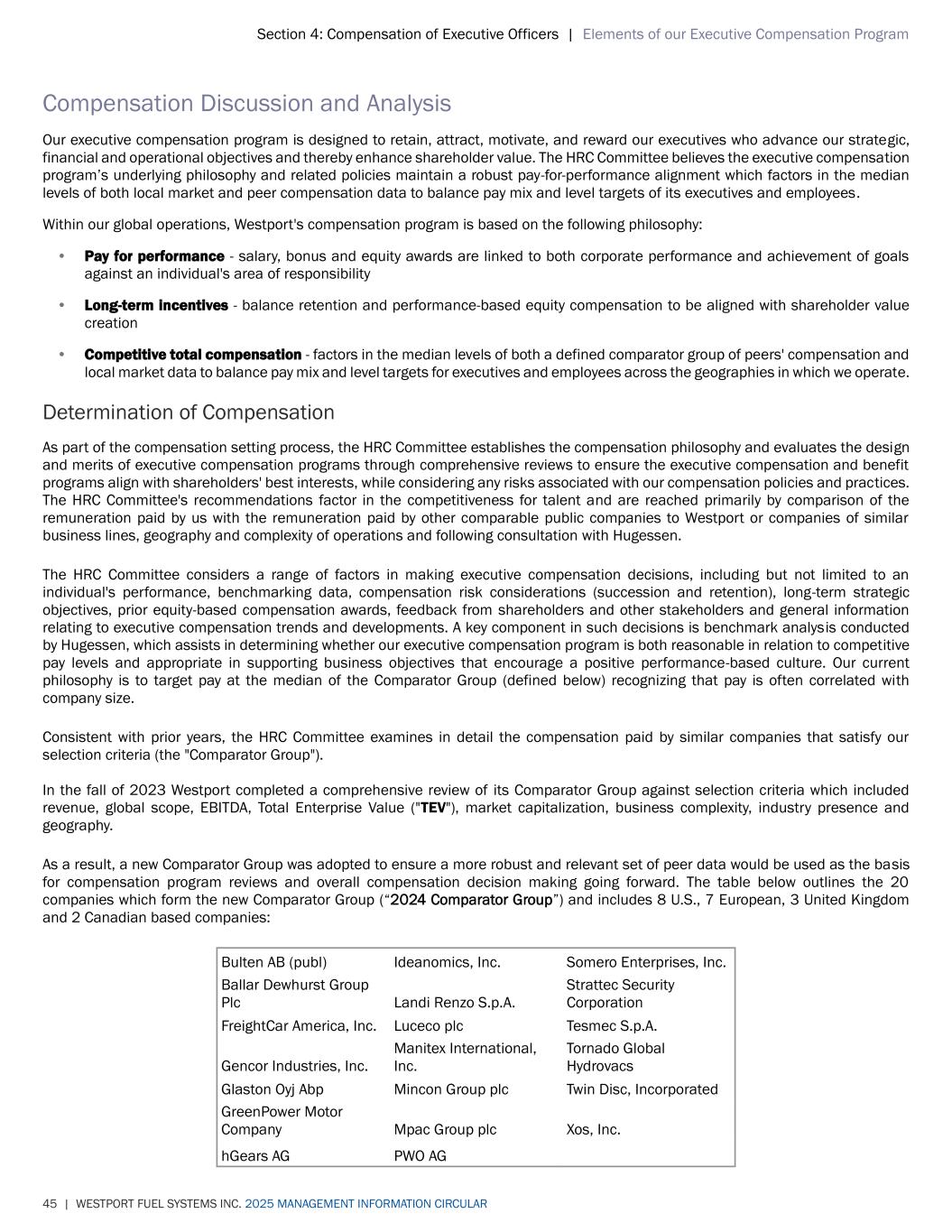 Section 4: Compensation of Executive Officers | Elements of our Executive Compensation Program 45 | WESTPORT FUEL SYSTEMS INC. 2025 MANAGEMENT INFORMATION CIRCULAR Compensation Discussion and Analysis Our executive compensation program is designed to retain, attract, motivate, and reward our executives who advance our strategic, financial and operational objectives and thereby enhance shareholder value. The HRC Committee believes the executive compensation program’s underlying philosophy and related policies maintain a robust pay-for-performance alignment which factors in the median levels of both local market and peer compensation data to balance pay mix and level targets of its executives and employees. Within our global operations, Westport's compensation program is based on the following philosophy: • Pay for performance - salary, bonus and equity awards are linked to both corporate performance and achievement of goals against an individual's area of responsibility • Long-term incentives - balance retention and performance-based equity compensation to be aligned with shareholder value creation • Competitive total compensation - factors in the median levels of both a defined comparator group of peers' compensation and local market data to balance pay mix and level targets for executives and employees across the geographies in which we operate. Determination of Compensation As part of the compensation setting process, the HRC Committee establishes the compensation philosophy and evaluates the design and merits of executive compensation programs through comprehensive reviews to ensure the executive compensation and benefit programs align with shareholders' best interests, while considering any risks associated with our compensation policies and practices. The HRC Committee's recommendations factor in the competitiveness for talent and are reached primarily by comparison of the remuneration paid by us with the remuneration paid by other comparable public companies to Westport or companies of similar business lines, geography and complexity of operations and following consultation with Hugessen. The HRC Committee considers a range of factors in making executive compensation decisions, including but not limited to an individual's performance, benchmarking data, compensation risk considerations (succession and retention), long-term strategic objectives, prior equity-based compensation awards, feedback from shareholders and other stakeholders and general information relating to executive compensation trends and developments. A key component in such decisions is benchmark analysis conducted by Hugessen, which assists in determining whether our executive compensation program is both reasonable in relation to competitive pay levels and appropriate in supporting business objectives that encourage a positive performance-based culture. Our current philosophy is to target pay at the median of the Comparator Group (defined below) recognizing that pay is often correlated with company size. Consistent with prior years, the HRC Committee examines in detail the compensation paid by similar companies that satisfy our selection criteria (the "Comparator Group"). In the fall of 2023 Westport completed a comprehensive review of its Comparator Group against selection criteria which included revenue, global scope, EBITDA, Total Enterprise Value ("TEV"), market capitalization, business complexity, industry presence and geography. As a result, a new Comparator Group was adopted to ensure a more robust and relevant set of peer data would be used as the basis for compensation program reviews and overall compensation decision making going forward. The table below outlines the 20 companies which form the new Comparator Group (“2024 Comparator Group”) and includes 8 U.S., 7 European, 3 United Kingdom and 2 Canadian based companies: Bulten AB (publ) Ideanomics, Inc. Somero Enterprises, Inc. Ballar Dewhurst Group Plc Landi Renzo S.p.A. Strattec Security Corporation FreightCar America, Inc. Luceco plc Tesmec S.p.A. Gencor Industries, Inc. Manitex International, Inc. Tornado Global Hydrovacs Glaston Oyj Abp Mincon Group plc Twin Disc, Incorporated GreenPower Motor Company Mpac Group plc Xos, Inc. hGears AG PWO AG