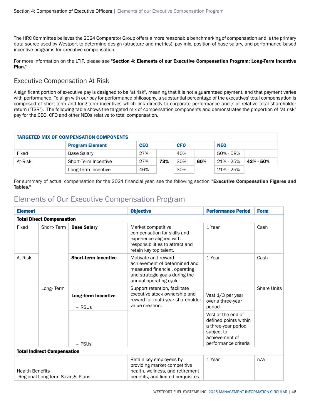 Section 4: Compensation of Executive Officers | Elements of our Executive Compensation Program WESTPORT FUEL SYSTEMS INC. 2025 MANAGEMENT INFORMATION CIRCULAR | 46 The HRC Committee believes the 2024 Comparator Group offers a more reasonable benchmarking of compensation and is the primary data source used by Westport to determine design (structure and metrics), pay mix, position of base salary, and performance-based incentive programs for executive compensation. For more information on the LTIP, please see "Section 4: Elements of our Executive Compensation Program: Long-Term Incentive Plan." Executive Compensation At Risk A significant portion of executive pay is designed to be "at risk", meaning that it is not a guaranteed payment, and that payment varies with performance. To align with our pay for performance philosophy, a substantial percentage of the executives' total compensation is comprised of short-term and long-term incentives which link directly to corporate performance and / or relative total shareholder return ("TSR"). The following table shows the targeted mix of compensation components and demonstrates the proportion of "at risk" pay for the CEO, CFO and other NEOs relative to total compensation. TARGETED MIX OF COMPENSATION COMPONENTS Program Element CEO CFO NEO Fixed Base Salary 27% 40% 50% - 58% At-Risk Short-Term Incentive 27% 73% 30% 60% 21% - 25% 42% - 50% Long-Term Incentive 46% 30% 21% - 25% For summary of actual compensation for the 2024 financial year, see the following section "Executive Compensation Figures and Tables." Elements of Our Executive Compensation Program Element Objective Performance Period Form Total Direct Compensation Fixed Short- Term Base Salary Market competitive compensation for skills and experience aligned with responsibilities to attract and retain key top talent. 1 Year Cash At Risk Short-term Incentive Motivate and reward achievement of determined and measured financial, operating and strategic goals during the annual operating cycle. 1 Year Cash Long- Term Long-term Incentive – RSUs Support retention, facilitate executive stock ownership and reward for multi-year shareholder value creation. Vest 1/3 per year over a three-year period Share Units – PSUs Vest at the end of defined points within a three-year period subject to achievement of performance criteria Total Indirect Compensation Health Benefits Regional Long-term Savings Plans Retain key employees by providing market competitive health, wellness, and retirement benefits, and limited perquisites. 1 Year n/a