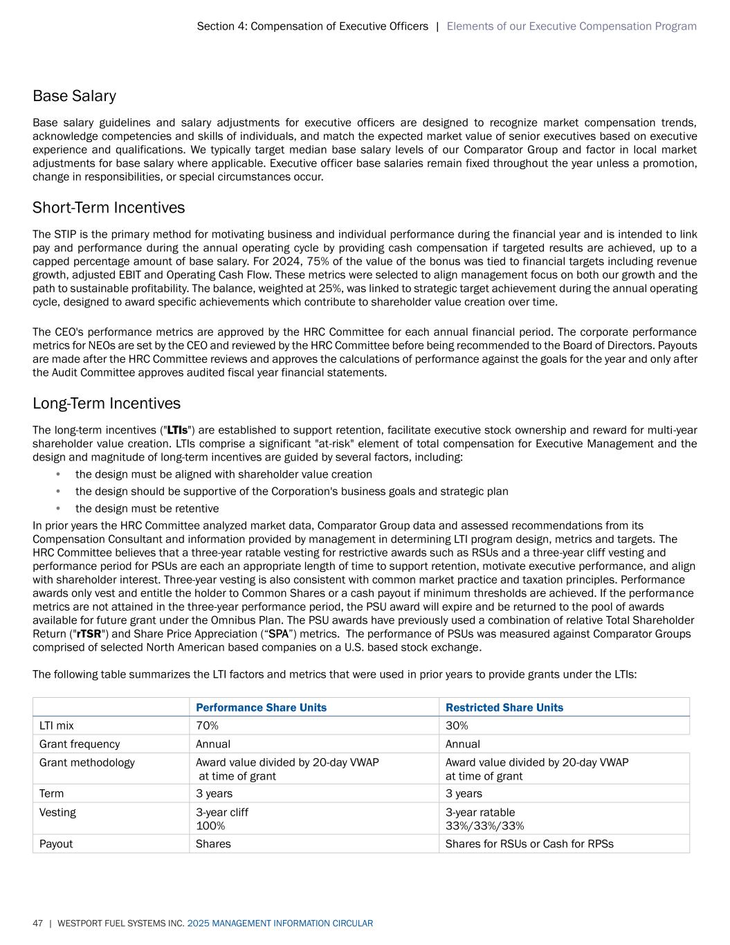 Section 4: Compensation of Executive Officers | Elements of our Executive Compensation Program 47 | WESTPORT FUEL SYSTEMS INC. 2025 MANAGEMENT INFORMATION CIRCULAR Base Salary Base salary guidelines and salary adjustments for executive officers are designed to recognize market compensation trends, acknowledge competencies and skills of individuals, and match the expected market value of senior executives based on executive experience and qualifications. We typically target median base salary levels of our Comparator Group and factor in local market adjustments for base salary where applicable. Executive officer base salaries remain fixed throughout the year unless a promotion, change in responsibilities, or special circumstances occur. Short-Term Incentives The STIP is the primary method for motivating business and individual performance during the financial year and is intended to link pay and performance during the annual operating cycle by providing cash compensation if targeted results are achieved, up to a capped percentage amount of base salary. For 2024, 75% of the value of the bonus was tied to financial targets including revenue growth, adjusted EBIT and Operating Cash Flow. These metrics were selected to align management focus on both our growth and the path to sustainable profitability. The balance, weighted at 25%, was linked to strategic target achievement during the annual operating cycle, designed to award specific achievements which contribute to shareholder value creation over time. The CEO's performance metrics are approved by the HRC Committee for each annual financial period. The corporate performance metrics for NEOs are set by the CEO and reviewed by the HRC Committee before being recommended to the Board of Directors. Payouts are made after the HRC Committee reviews and approves the calculations of performance against the goals for the year and only after the Audit Committee approves audited fiscal year financial statements. Long-Term Incentives The long-term incentives ("LTIs") are established to support retention, facilitate executive stock ownership and reward for multi-year shareholder value creation. LTIs comprise a significant "at-risk" element of total compensation for Executive Management and the design and magnitude of long-term incentives are guided by several factors, including: • the design must be aligned with shareholder value creation • the design should be supportive of the Corporation's business goals and strategic plan • the design must be retentive In prior years the HRC Committee analyzed market data, Comparator Group data and assessed recommendations from its Compensation Consultant and information provided by management in determining LTI program design, metrics and targets. The HRC Committee believes that a three-year ratable vesting for restrictive awards such as RSUs and a three-year cliff vesting and performance period for PSUs are each an appropriate length of time to support retention, motivate executive performance, and align with shareholder interest. Three-year vesting is also consistent with common market practice and taxation principles. Performance awards only vest and entitle the holder to Common Shares or a cash payout if minimum thresholds are achieved. If the performance metrics are not attained in the three-year performance period, the PSU award will expire and be returned to the pool of awards available for future grant under the Omnibus Plan. The PSU awards have previously used a combination of relative Total Shareholder Return ("rTSR") and Share Price Appreciation (“SPA”) metrics. The performance of PSUs was measured against Comparator Groups comprised of selected North American based companies on a U.S. based stock exchange. The following table summarizes the LTI factors and metrics that were used in prior years to provide grants under the LTIs: Performance Share Units Restricted Share Units LTI mix 70% 30% Grant frequency Annual Annual Grant methodology Award value divided by 20-day VWAP at time of grant Award value divided by 20-day VWAP at time of grant Term 3 years 3 years Vesting 3-year cliff 100% 3-year ratable 33%/33%/33% Payout Shares Shares for RSUs or Cash for RPSs