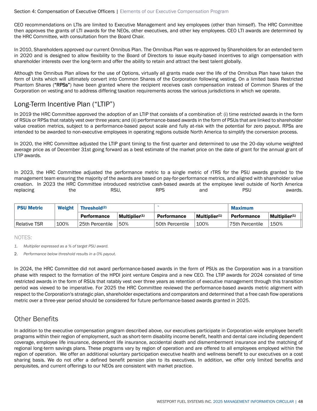 Section 4: Compensation of Executive Officers | Elements of our Executive Compensation Program WESTPORT FUEL SYSTEMS INC. 2025 MANAGEMENT INFORMATION CIRCULAR | 48 CEO recommendations on LTIs are limited to Executive Management and key employees (other than himself). The HRC Committee then approves the grants of LTI awards for the NEOs, other executives, and other key employees. CEO LTI awards are determined by the HRC Committee, with consultation from the Board Chair. In 2010, Shareholders approved our current Omnibus Plan. The Omnibus Plan was re-approved by Shareholders for an extended term in 2020 and is designed to allow flexibility to the Board of Directors to issue equity-based incentives to align compensation with shareholder interests over the long-term and offer the ability to retain and attract the best talent globally. Although the Omnibus Plan allows for the use of Options, virtually all grants made over the life of the Omnibus Plan have taken the form of Units which will ultimately convert into Common Shares of the Corporation following vesting. On a limited basis Restricted Phantom Shares (“RPSs”) have been granted where the recipient receives cash compensation instead of Common Shares of the Corporation on vesting and to address differing taxation requirements across the various jurisdictions in which we operate. Long-Term Incentive Plan (“LTIP”) In 2019 the HRC Committee approved the adoption of an LTIP that consists of a combination of: (i) time restricted awards in the form of RSUs or RPSs that ratably vest over three years; and (ii) performance-based awards in the form of PSUs that are linked to shareholder value creation metrics, subject to a performance-based payout scale and fully at-risk with the potential for zero payout. RPSs are intended to be awarded to non-executive employees in operating regions outside North America to simplify the conversion process. In 2020, the HRC Committee adjusted the LTIP grant timing to the first quarter and determined to use the 20-day volume weighted average price as of December 31st going forward as a best estimate of the market price on the date of grant for the annual grant of LTIP awards. In 2023, the HRC Committee adjusted the performance metric to a single metric of rTRS for the PSU awards granted to the management team ensuring the majority of the awards are based on pay-for-performance metrics, and aligned with shareholder value creation. In 2023 the HRC Committee introduced restrictive cash-based awards at the employee level outside of North America replacing the RSU, RPS and PSU awards. PSU Metric Weight Threshold(2) ` Maximum Performance Multiplier(1) Performance Multiplier(1) Performance Multiplier(1) Relative TSR 100% 25th Percentile 50% 50th Percentile 100% 75th Percentile 150% NOTES: 1. Multiplier expressed as a % of target PSU award. 2. Performance below threshold results in a 0% payout. In 2024, the HRC Committee did not award performance-based awards in the form of PSUs as the Corporation was in a transition phase with respect to the formation of the HPDI joint venture Cespira and a new CEO. The LTIP awards for 2024 consisted of time restricted awards in the form of RSUs that ratably vest over three years as retention of executive management through this transition period was viewed to be imperative. For 2025 the HRC Committee reviewed the performance-based awards metric alignment with respect to the Corporation's strategic plan, shareholder expectations and comparators and determined that a free cash flow operations metric over a three-year period should be considered for future performance-based awards granted in 2025. Other Benefits In addition to the executive compensation program described above, our executives participate in Corporation-wide employee benefit programs within their region of employment, such as short-term disability income benefit, health and dental care including dependent coverage, employee life insurance, dependent life insurance, accidental death and dismemberment insurance and the matching of regional long-term savings plans. These programs vary by region of operation and are offered to all employees employed within the region of operation. We offer an additional voluntary participation executive health and wellness benefit to our executives on a cost sharing basis. We do not offer a defined benefit pension plan to its executives. In addition, we offer only limited benefits and perquisites, and current offerings to our NEOs are consistent with market practice.