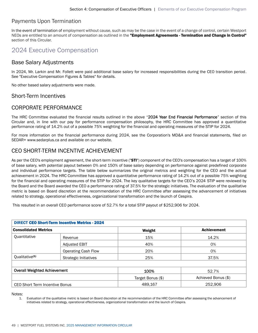 Section 4: Compensation of Executive Officers | Elements of our Executive Compensation Program 49 | WESTPORT FUEL SYSTEMS INC. 2025 MANAGEMENT INFORMATION CIRCULAR Payments Upon Termination In the event of termination of employment without cause, such as may be the case in the event of a change of control, certain Westport NEOs are entitled to an amount of compensation as outlined in the "Employment Agreements - Termination and Change in Control" section of this Circular. 2024 Executive Compensation Base Salary Adjustments In 2024, Mr. Larkin and Mr. Follett were paid additional base salary for increased responsibilities during the CEO transition period. See "Executive Compensation Figures & Tables" for details. No other based salary adjustments were made. Short-Term Incentives CORPORATE PERFORMANCE The HRC Committee evaluated the financial results outlined in the above “2024 Year End Financial Performance” section of this Circular and, in line with our pay for performance compensation philosophy, the HRC Committee has approved a quantitative performance rating of 14.2% out of a possible 75% weighting for the financial and operating measures of the STIP for 2024. For more information on the financial performance during 2024, see the Corporation's MD&A and financial statements, filed on SEDAR+ www.sedarplus.ca and available on our website. CEO SHORT-TERM INCENTIVE ACHIEVEMENT As per the CEO's employment agreement, the short-term incentive ("STI") component of the CEO's compensation has a target of 100% of base salary, with potential payout between 0% and 150% of base salary depending on performance against predefined corporate and individual performance targets. The table below summarizes the original metrics and weighting for the CEO and the actual achievement in 2024. The HRC Committee has approved a quantitative performance rating of 14.2% out of a possible 75% weighting for the financial and operating measures of the STIP for 2024. The key qualitative targets for the CEO’s 2024 STIP were reviewed by the Board and the Board awarded the CEO a performance rating of 37.5% for the strategic initiatives. The evaluation of the qualitative metric is based on Board discretion at the recommendation of the HRC Committee after assessing the advancement of initiatives related to strategy, operational effectiveness, organizational transformation and the launch of Cespira. This resulted in an overall CEO performance score of 52.7% for a total STIP payout of $252,906 for 2024. DIRECT CEO Short-Term Incentive Metrics - 2024 Consolidated Metrics Weight Achievement Quantitative Revenue 15% 14.2% Adjusted EBIT 40% 0% Operating Cash Flow 20% 0% Qualitative(1) Strategic Initiatives 25% 37.5% Overall Weighted Achievement 100% 52.7% Target Bonus ($) Achieved Bonus ($) CEO Short Term Incentive Bonus 489,167 252,906 Notes: 1. Evaluation of the qualitative metric is based on Board discretion at the recommendation of the HRC Committee after assessing the advancement of initiatives related to strategy, operational effectiveness, organizational transformation and the launch of Cespira.