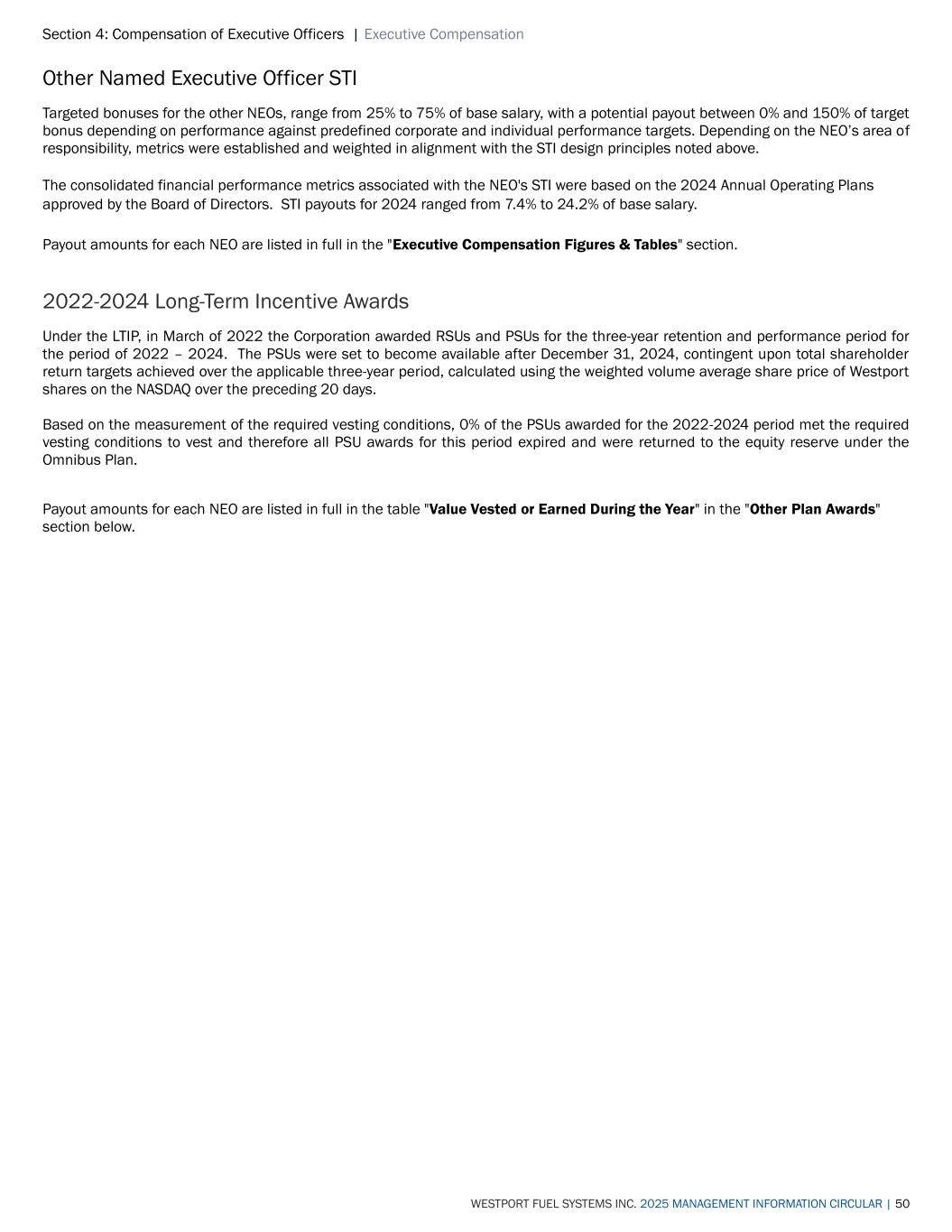 Section 4: Compensation of Executive Officers | Executive Compensation WESTPORT FUEL SYSTEMS INC. 2025 MANAGEMENT INFORMATION CIRCULAR | 50 Other Named Executive Officer STI Targeted bonuses for the other NEOs, range from 25% to 75% of base salary, with a potential payout between 0% and 150% of target bonus depending on performance against predefined corporate and individual performance targets. Depending on the NEO’s area of responsibility, metrics were established and weighted in alignment with the STI design principles noted above. The consolidated financial performance metrics associated with the NEO's STI were based on the 2024 Annual Operating Plans approved by the Board of Directors. STI payouts for 2024 ranged from 7.4% to 24.2% of base salary. Payout amounts for each NEO are listed in full in the "Executive Compensation Figures & Tables" section. 2022-2024 Long-Term Incentive Awards Under the LTIP, in March of 2022 the Corporation awarded RSUs and PSUs for the three-year retention and performance period for the period of 2022 – 2024. The PSUs were set to become available after December 31, 2024, contingent upon total shareholder return targets achieved over the applicable three-year period, calculated using the weighted volume average share price of Westport shares on the NASDAQ over the preceding 20 days. Based on the measurement of the required vesting conditions, 0% of the PSUs awarded for the 2022-2024 period met the required vesting conditions to vest and therefore all PSU awards for this period expired and were returned to the equity reserve under the Omnibus Plan. Payout amounts for each NEO are listed in full in the table "Value Vested or Earned During the Year" in the "Other Plan Awards" section below.