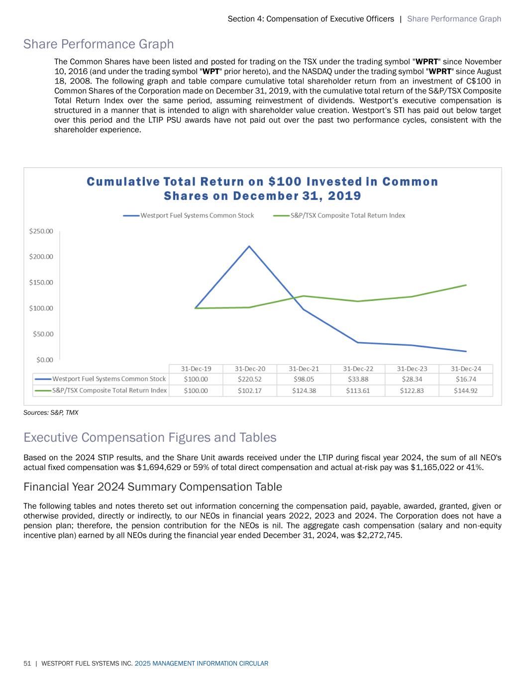 Section 4: Compensation of Executive Officers | Share Performance Graph 51 | WESTPORT FUEL SYSTEMS INC. 2025 MANAGEMENT INFORMATION CIRCULAR Share Performance Graph The Common Shares have been listed and posted for trading on the TSX under the trading symbol "WPRT" since November 10, 2016 (and under the trading symbol "WPT" prior hereto), and the NASDAQ under the trading symbol "WPRT" since August 18, 2008. The following graph and table compare cumulative total shareholder return from an investment of C$100 in Common Shares of the Corporation made on December 31, 2019, with the cumulative total return of the S&P/TSX Composite Total Return Index over the same period, assuming reinvestment of dividends. Westport’s executive compensation is structured in a manner that is intended to align with shareholder value creation. Westport’s STI has paid out below target over this period and the LTIP PSU awards have not paid out over the past two performance cycles, consistent with the shareholder experience. Sources: S&P, TMX Executive Compensation Figures and Tables Based on the 2024 STIP results, and the Share Unit awards received under the LTIP during fiscal year 2024, the sum of all NEO's actual fixed compensation was $1,694,629 or 59% of total direct compensation and actual at-risk pay was $1,165,022 or 41%. Financial Year 2024 Summary Compensation Table The following tables and notes thereto set out information concerning the compensation paid, payable, awarded, granted, given or otherwise provided, directly or indirectly, to our NEOs in financial years 2022, 2023 and 2024. The Corporation does not have a pension plan; therefore, the pension contribution for the NEOs is nil. The aggregate cash compensation (salary and non-equity incentive plan) earned by all NEOs during the financial year ended December 31, 2024, was $2,272,745.