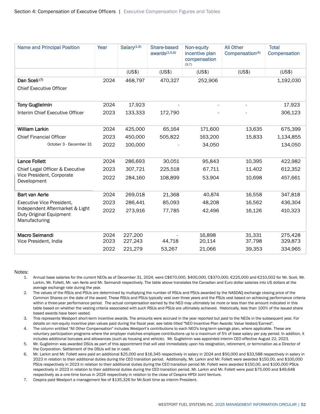 Section 4: Compensation of Executive Officers | Executive Compensation Figures and Tables WESTPORT FUEL SYSTEMS INC. 2025 MANAGEMENT INFORMATION CIRCULAR | 52 Name and Principal Position Year Salary(1,6) Share-based awards(2,5,6) Non-equity incentive plan compensation (3,7) All Other Compensation(4) Total Compensation (US$) (US$) (US$) (US$) (US$) Dan Sceli (7) 2024 468,797 470,327 252,906 1,192,030 Chief Executive Officer Tony Guglielmin 2024 17,923 - - - 17,923 Interim Chief Executive Officer 2023 133,333 172,790 - - 306,123 William Larkin 2024 425,000 65,164 171,600 13,635 675,399 Chief Financial Officer 2023 450,000 505,822 163,200 15,833 1,134,855 October 3 - December 31 2022 100,000 - 34,050 134,050 Lance Follett 2024 286,693 30,051 95,843 10,395 422,982 Chief Legal Officer & Executive Vice President, Corporate Development 2023 307,721 225,518 67,711 11.402 612,352 2022 284,160 108,899 53,904 10,698 457,661 Bart van Aerle 2024 269,018 21,368 40,874 16,558 347,818 Executive Vice President, Independent Aftermarket & Light Duty Original Equipment Manufacturing 2023 286,441 85,093 48,208 16,562 436,304 2022 273,916 77,785 42,496 16,126 410,323 Macro Seimandi 2024 227,200 - 16,898 31,331 275,428 Vice President, India 2023 227,243 44,718 20,114 37,798 329,873 2022 221,279 53,267 21,066 39,353 334,965 Notes: 1. Annual base salaries for the current NEOs as of December 31, 2024, were C$670,000, $400,000, C$370,000, €225,000 and €210,002 for Mr. Sceli, Mr. Larkin, Mr. Follett, Mr. van Aerle and Mr. Seimandi respectively. The table above translates the Canadian and Euro dollar salaries into US dollars at the average exchange rate during the year. 2. The values of the RSUs and PSUs are determined by multiplying the number of RSUs and PSUs awarded by the NASDAQ exchange closing price of the Common Shares on the date of the award. These RSUs and PSUs typically vest over three years and the PSUs vest based on achieving performance criteria within a three-year performance period. The actual compensation earned by the NEO may ultimately be more or less than the amount indicated in this table based on whether the vesting criteria associated with such RSUs and PSUs are ultimately achieved. Historically, less than 100% of the issued share based awards have been vested. 3. This represents Westport short-term incentive awards. The amounts were accrued in the year reported but paid to the NEOs in the subsequent year. For details on non-equity incentive plan values paid during the fiscal year, see table titled "NEO Incentive Plan Awards: Value Vested/Earned". 4. The column entitled "All Other Compensation" includes Westport’s contributions to each NEO's long-term savings plan, where applicable. These are voluntary participation programs where the employer matches employee contributions up to a maximum of 5% of base salary per pay period. In addition, it includes additional bonuses and allowances (such as housing and vehicle). Mr. Guglielmin was appointed interim CEO effective August 22, 2023. 5. Mr. Guglielmin was awarded DSUs as part of this appointment that will vest immediately upon his resignation, retirement, or termination as a Director of the Corporation. Settlement of the DSUs will be in cash. 6. Mr. Larkin and Mr. Follett were paid an additional $25,000 and $16,345 respectively in salary in 2024 and $50,000 and $33,588 respectively in salary in 2023 in relation to their additional duties during the CEO transition period. Additionally, Mr. Larkin and Mr. Follett were awarded $150,00, and $100,000 PSUs respectively in 2023 in relation to their additional duties during the CEO transition period Mr. Follett were awarded $150,00, and $100,000 PSUs respectively in 2023 in relation to their additional duties during the CEO transition period. Mr. Larkin and Mr. Follett were paid $75,000 and $49,648 respectively as a one-time bonus in 2024 respectively in relation to the close of Cespira HPDI Joint Venture. 7. Cespira paid Westport a management fee of $135,326 for Mr.Sceli time as interim President.
