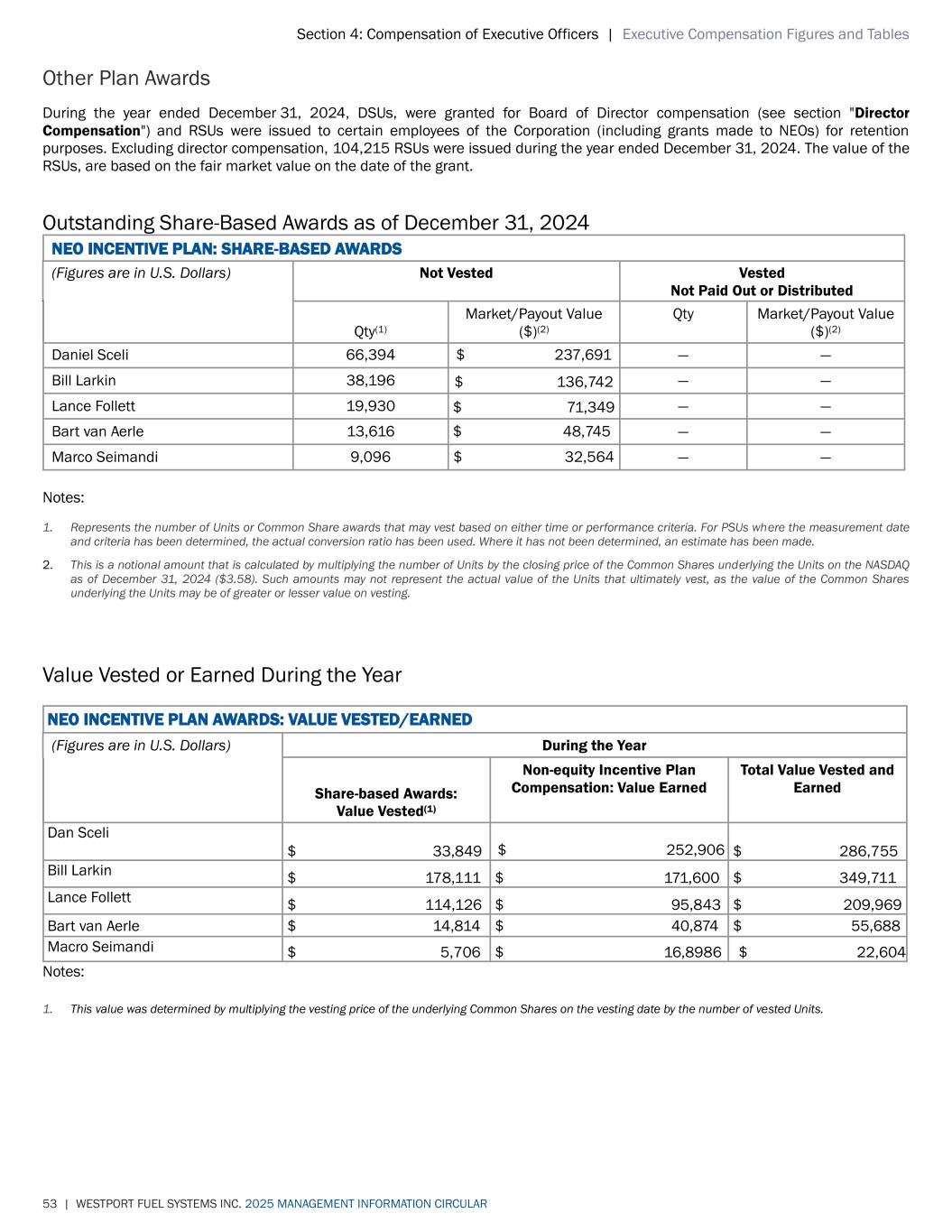 Section 4: Compensation of Executive Officers | Executive Compensation Figures and Tables 53 | WESTPORT FUEL SYSTEMS INC. 2025 MANAGEMENT INFORMATION CIRCULAR Other Plan Awards During the year ended December 31, 2024, DSUs, were granted for Board of Director compensation (see section "Director Compensation") and RSUs were issued to certain employees of the Corporation (including grants made to NEOs) for retention purposes. Excluding director compensation, 104,215 RSUs were issued during the year ended December 31, 2024. The value of the RSUs, are based on the fair market value on the date of the grant. Outstanding Share-Based Awards as of December 31, 2024 NEO INCENTIVE PLAN: SHARE-BASED AWARDS (Figures are in U.S. Dollars) Not Vested Vested Not Paid Out or Distributed Qty(1) Market/Payout Value ($)(2) Qty Market/Payout Value ($)(2) Daniel Sceli 66,394 $ 237,691 — — Bill Larkin 38,196 $ 136,742 — — Lance Follett 19,930 $ 71,349 — — Bart van Aerle 13,616 $ 48,745 — — Marco Seimandi 9,096 $ 32,564 — — Notes: 1. Represents the number of Units or Common Share awards that may vest based on either time or performance criteria. For PSUs where the measurement date and criteria has been determined, the actual conversion ratio has been used. Where it has not been determined, an estimate has been made. 2. This is a notional amount that is calculated by multiplying the number of Units by the closing price of the Common Shares underlying the Units on the NASDAQ as of December 31, 2024 ($3.58). Such amounts may not represent the actual value of the Units that ultimately vest, as the value of the Common Shares underlying the Units may be of greater or lesser value on vesting. Value Vested or Earned During the Year NEO INCENTIVE PLAN AWARDS: VALUE VESTED/EARNED (Figures are in U.S. Dollars) During the Year Share-based Awards: Value Vested(1) Non-equity Incentive Plan Compensation: Value Earned Total Value Vested and Earned Dan Sceli $ 33,849 $ 252,906 $ 286,755 Bill Larkin $ 178,111 $ 171,600 $ 349,711 Lance Follett $ 114,126 $ 95,843 $ 209,969 Bart van Aerle $ 14,814 $ 40,874 $ 55,688 Macro Seimandi $ 5,706 $ 16,8986 $ 22,604 Notes: 1. This value was determined by multiplying the vesting price of the underlying Common Shares on the vesting date by the number of vested Units.