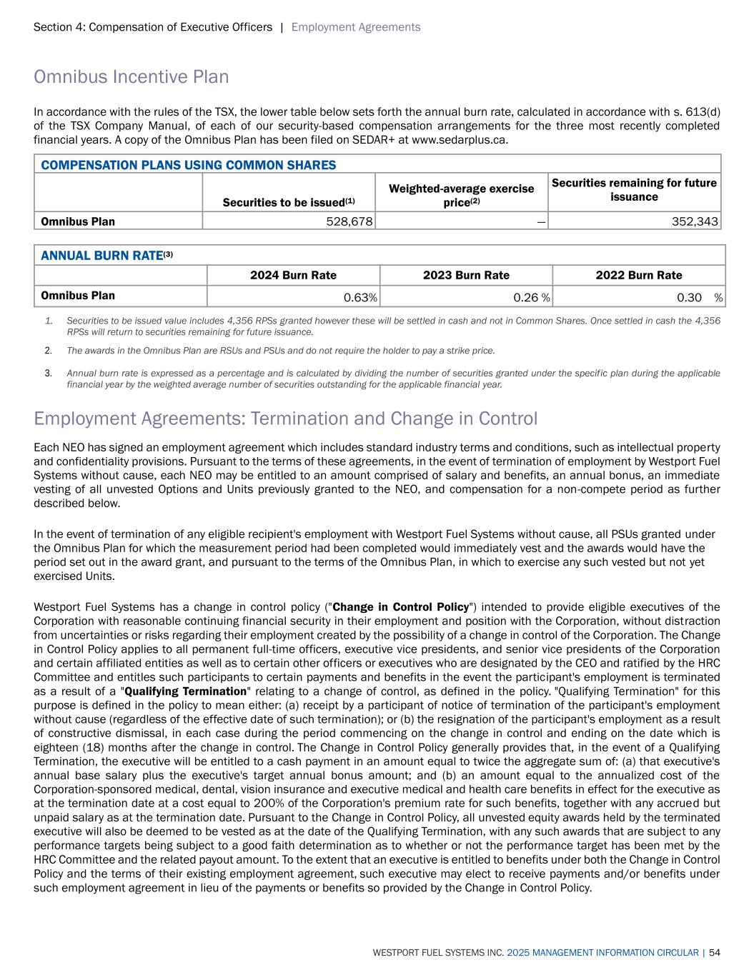 Section 4: Compensation of Executive Officers | Employment Agreements WESTPORT FUEL SYSTEMS INC. 2025 MANAGEMENT INFORMATION CIRCULAR | 54 Omnibus Incentive Plan In accordance with the rules of the TSX, the lower table below sets forth the annual burn rate, calculated in accordance with s. 613(d) of the TSX Company Manual, of each of our security-based compensation arrangements for the three most recently completed financial years. A copy of the Omnibus Plan has been filed on SEDAR+ at www.sedarplus.ca. COMPENSATION PLANS USING COMMON SHARES Securities to be issued(1) Weighted-average exercise price(2) Securities remaining for future issuance Omnibus Plan 528,678 — 352,343 ANNUAL BURN RATE(3) 2024 Burn Rate 2023 Burn Rate 2022 Burn Rate Omnibus Plan 0.63% 0.26 % 0.30 % 1. Securities to be issued value includes 4,356 RPSs granted however these will be settled in cash and not in Common Shares. Once settled in cash the 4,356 RPSs will return to securities remaining for future issuance. 2. The awards in the Omnibus Plan are RSUs and PSUs and do not require the holder to pay a strike price. 3. Annual burn rate is expressed as a percentage and is calculated by dividing the number of securities granted under the specific plan during the applicable financial year by the weighted average number of securities outstanding for the applicable financial year. Employment Agreements: Termination and Change in Control Each NEO has signed an employment agreement which includes standard industry terms and conditions, such as intellectual property and confidentiality provisions. Pursuant to the terms of these agreements, in the event of termination of employment by Westport Fuel Systems without cause, each NEO may be entitled to an amount comprised of salary and benefits, an annual bonus, an immediate vesting of all unvested Options and Units previously granted to the NEO, and compensation for a non-compete period as further described below. In the event of termination of any eligible recipient's employment with Westport Fuel Systems without cause, all PSUs granted under the Omnibus Plan for which the measurement period had been completed would immediately vest and the awards would have the period set out in the award grant, and pursuant to the terms of the Omnibus Plan, in which to exercise any such vested but not yet exercised Units. Westport Fuel Systems has a change in control policy ("Change in Control Policy") intended to provide eligible executives of the Corporation with reasonable continuing financial security in their employment and position with the Corporation, without distraction from uncertainties or risks regarding their employment created by the possibility of a change in control of the Corporation. The Change in Control Policy applies to all permanent full-time officers, executive vice presidents, and senior vice presidents of the Corporation and certain affiliated entities as well as to certain other officers or executives who are designated by the CEO and ratified by the HRC Committee and entitles such participants to certain payments and benefits in the event the participant's employment is terminated as a result of a "Qualifying Termination" relating to a change of control, as defined in the policy. "Qualifying Termination" for this purpose is defined in the policy to mean either: (a) receipt by a participant of notice of termination of the participant's employment without cause (regardless of the effective date of such termination); or (b) the resignation of the participant's employment as a result of constructive dismissal, in each case during the period commencing on the change in control and ending on the date which is eighteen (18) months after the change in control. The Change in Control Policy generally provides that, in the event of a Qualifying Termination, the executive will be entitled to a cash payment in an amount equal to twice the aggregate sum of: (a) that executive's annual base salary plus the executive's target annual bonus amount; and (b) an amount equal to the annualized cost of the Corporation-sponsored medical, dental, vision insurance and executive medical and health care benefits in effect for the executive as at the termination date at a cost equal to 200% of the Corporation's premium rate for such benefits, together with any accrued but unpaid salary as at the termination date. Pursuant to the Change in Control Policy, all unvested equity awards held by the terminated executive will also be deemed to be vested as at the date of the Qualifying Termination, with any such awards that are subject to any performance targets being subject to a good faith determination as to whether or not the performance target has been met by the HRC Committee and the related payout amount. To the extent that an executive is entitled to benefits under both the Change in Control Policy and the terms of their existing employment agreement, such executive may elect to receive payments and/or benefits under such employment agreement in lieu of the payments or benefits so provided by the Change in Control Policy.