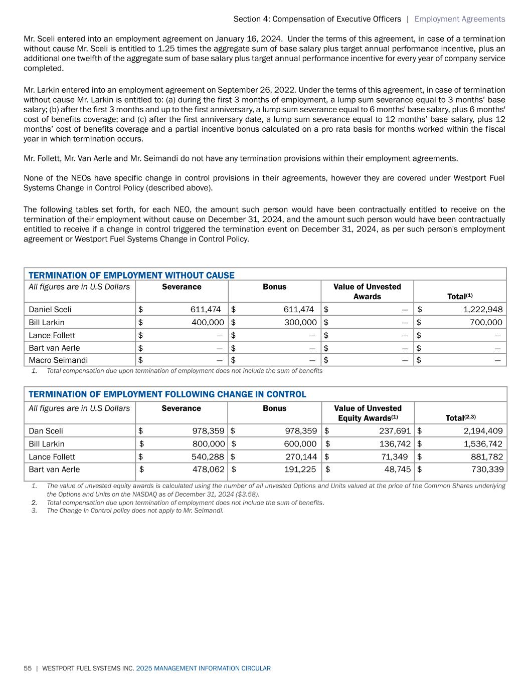 Section 4: Compensation of Executive Officers | Employment Agreements 55 | WESTPORT FUEL SYSTEMS INC. 2025 MANAGEMENT INFORMATION CIRCULAR Mr. Sceli entered into an employment agreement on January 16, 2024. Under the terms of this agreement, in case of a termination without cause Mr. Sceli is entitled to 1.25 times the aggregate sum of base salary plus target annual performance incentive, plus an additional one twelfth of the aggregate sum of base salary plus target annual performance incentive for every year of company service completed. Mr. Larkin entered into an employment agreement on September 26, 2022. Under the terms of this agreement, in case of termination without cause Mr. Larkin is entitled to: (a) during the first 3 months of employment, a lump sum severance equal to 3 months' base salary; (b) after the first 3 months and up to the first anniversary, a lump sum severance equal to 6 months' base salary, plus 6 months' cost of benefits coverage; and (c) after the first anniversary date, a lump sum severance equal to 12 months’ base salary, plus 12 months’ cost of benefits coverage and a partial incentive bonus calculated on a pro rata basis for months worked within the f iscal year in which termination occurs. Mr. Follett, Mr. Van Aerle and Mr. Seimandi do not have any termination provisions within their employment agreements. None of the NEOs have specific change in control provisions in their agreements, however they are covered under Westport Fuel Systems Change in Control Policy (described above). The following tables set forth, for each NEO, the amount such person would have been contractually entitled to receive on the termination of their employment without cause on December 31, 2024, and the amount such person would have been contractually entitled to receive if a change in control triggered the termination event on December 31, 2024, as per such person's employment agreement or Westport Fuel Systems Change in Control Policy. TERMINATION OF EMPLOYMENT WITHOUT CAUSE All figures are in U.S Dollars Severance Bonus Value of Unvested Awards Total(1) Daniel Sceli $ 611,474 $ 611,474 $ — $ 1,222,948 Bill Larkin $ 400,000 $ 300,000 $ — $ 700,000 Lance Follett $ — $ — $ — $ — Bart van Aerle $ — $ — $ — $ — Macro Seimandi $ — $ — $ — $ — 1. Total compensation due upon termination of employment does not include the sum of benefits TERMINATION OF EMPLOYMENT FOLLOWING CHANGE IN CONTROL All figures are in U.S Dollars Severance Bonus Value of Unvested Equity Awards(1) Total(2,3) Dan Sceli $ 978,359 $ 978,359 $ 237,691 $ 2,194,409 Bill Larkin $ 800,000 $ 600,000 $ 136,742 $ 1,536,742 Lance Follett $ 540,288 $ 270,144 $ 71,349 $ 881,782 Bart van Aerle $ 478,062 $ 191,225 $ 48,745 $ 730,339 1. The value of unvested equity awards is calculated using the number of all unvested Options and Units valued at the price of the Common Shares underlying the Options and Units on the NASDAQ as of December 31, 2024 ($3.58). 2. Total compensation due upon termination of employment does not include the sum of benefits. 3. The Change in Control policy does not apply to Mr. Seimandi.