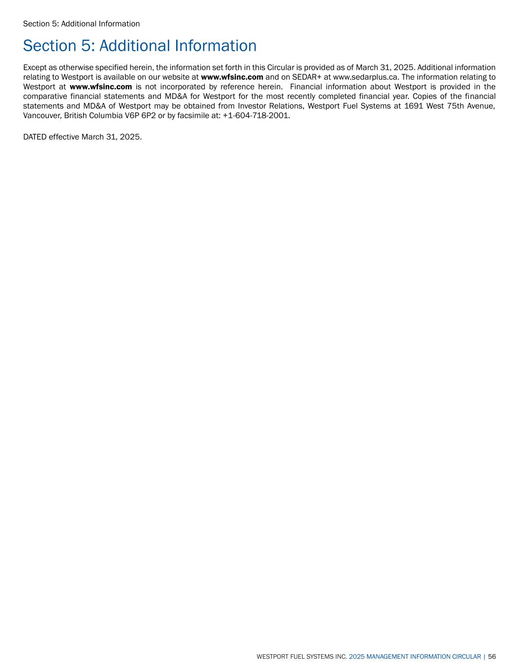 Section 5: Additional Information WESTPORT FUEL SYSTEMS INC. 2025 MANAGEMENT INFORMATION CIRCULAR | 56 Section 5: Additional Information Except as otherwise specified herein, the information set forth in this Circular is provided as of March 31, 2025. Additional information relating to Westport is available on our website at www.wfsinc.com and on SEDAR+ at www.sedarplus.ca. The information relating to Westport at www.wfsinc.com is not incorporated by reference herein. Financial information about Westport is provided in the comparative financial statements and MD&A for Westport for the most recently completed financial year. Copies of the financial statements and MD&A of Westport may be obtained from Investor Relations, Westport Fuel Systems at 1691 West 75th Avenue, Vancouver, British Columbia V6P 6P2 or by facsimile at: +1-604-718-2001. DATED effective March 31, 2025.