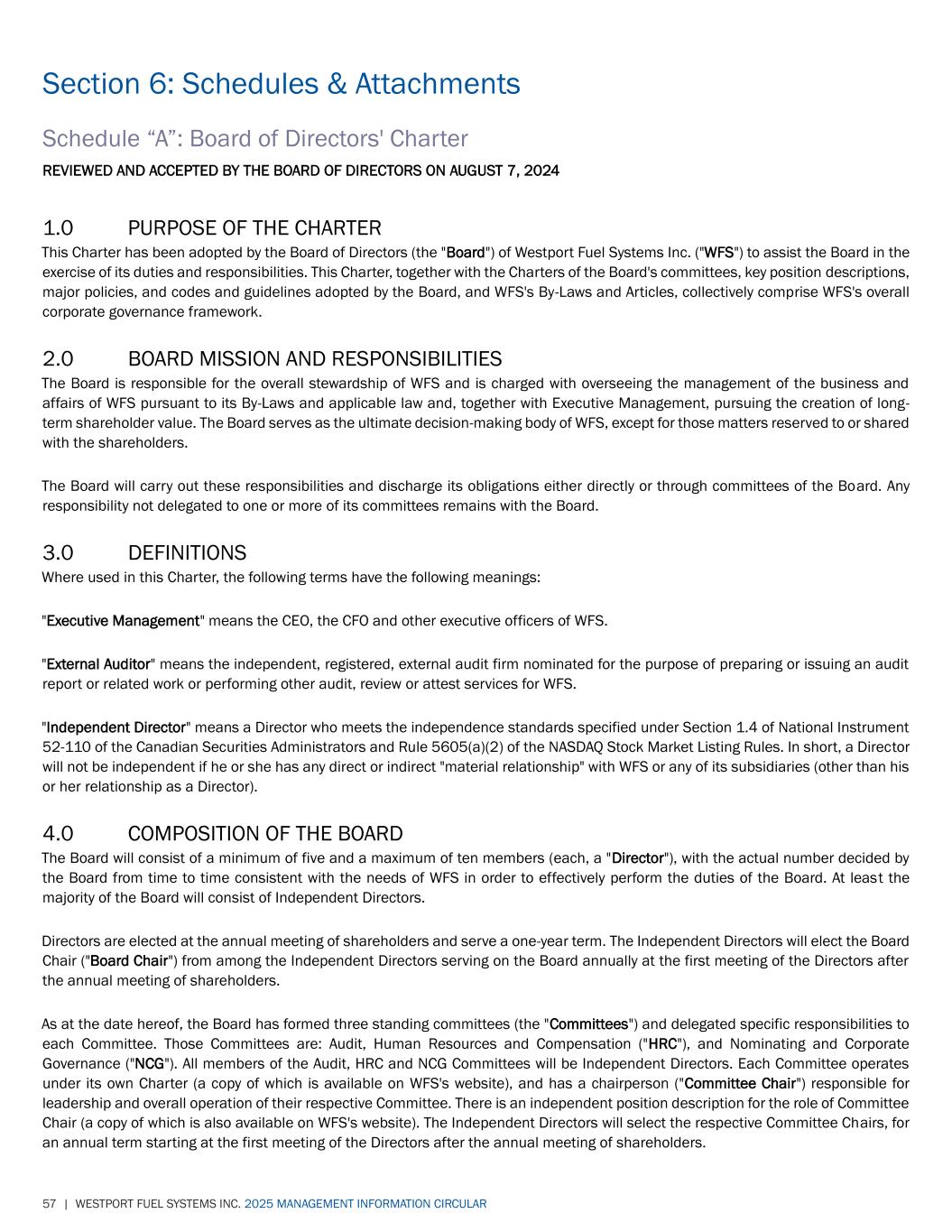 Section 6: Schedules & Attachments | Schedule A: Board of Directors' Charter WESTPORT FUEL SYSTEMS INC. 2025 MANAGEMENT INFORMATION CIRCULAR | 58 New committees of the Board may be established from time to time at the discretion of the Board in accordance with Section 23. 5.0 NOMINATION AND ELECTION OF DIRECTORS The NCG Committee, with input from all Directors, will work together to determine the optimum size of the Board and the appropriate mix of business skills, experience, and diversity of the members of the Board in order to effectively fulfill its mission. Prospective Directors must have a demonstrated commitment to high personal and professional integrity and ethical standards and a broad range of skills, expertise and experience that are relevant to WFS's business and/or its risk management, significant achievement in their respective fields of endeavor, sound business judgment, the ability to effectively collaborate and communicate with other Directors and with management, and be committed to devoting the time and effort needed to perform their duties effectively. The Board also recognizes that diverse views and backgrounds will enhance balanced decision making. To that end, the Board has implemented the WFS Diversity Policy (a copy of which is available on WFS's website), which recognizes the value of diversity, including gender diversity, across the WFS organization. For the purposes of the WFS Diversity Policy, "diversity" encompasses characteristics or qualities that can be used to differentiate groups and people from one another and includes age, ethnicity, Indigenous origin or heritage, gender, physical attributes, beliefs, language, sexual orientation, education, nationality, social background and culture and other personal characteristics. In support of maintaining a more gender-balance board, the Board has adopted a target of having at least 30% female representation on the Board. The NCG Committee will annually review Board composition and requirements with consideration of these diversity attributes, any stated diversity targets, WFS's strategy and all relevant facts and circumstances, individual Director contributions and potential candidates for election as WFS Directors and recommend to the Board a slate of Directors for election by shareholders that brings a diversity of background and industry or related expertise and experience to the Board. In assessing Board composition and identifying suitable candidates, the NCG Committee will review the current composition of the Board with a view to ensuring it reflects a diverse mix of knowledge, experience, education, skills, gender, age, ethnicity and geographic location, and that stated diversity targets are achieved. Ultimately, Director nominations are based on merit, measured against objective criteria. If a nominated Director fails to achieve a majority of votes for their appointment in an uncontested election, that nominated Director will immediately submit his or her resignation to the Board Chair in accordance with WFS's Majority Voting Policy (a copy of which is available on WFS's website). Following receipt of a resignation tendered pursuant to WFS's Majority Voting Policy, the Board Chair shall promptly advise the NCG Committee and the Board thereof and the resignation shall be considered in accordance with the Majority Voting Policy. 6.0 BOARD INDEPENDENCE AND EFFECTIVENESS The business of WFS is conducted by Executive Management under the oversight of the Board. WFS believes an effective Board means a Board that maintains a clear distinction between Board oversight functions and the responsibilities and duties of Executive Management. Although a working culture of trust and collaboration must exist between the Board and Executive Management in order for WFS to succeed, the Board must exercise its duties and responsibilities in accordance with its own best judgment and its own views of the long-term interests of WFS and its shareholders. This means that individual Directors must be technically independent as defined by applicable law and the regulations of the relevant stock exchanges where WFS shares are listed (except for any non- Independent Directors) but also independent in practice. In addition, a Director must act strictly in the best interests of WFS and its shareholders generally and not in the interest of any one shareholder or group of shareholders. To that end, the Board has adopted several organizational principles: • At least the majority of the Board will consist of Independent Directors. • The Audit Committee Chair, the HRC Committee Chair and the NCG Committee Chair will only be held by Independent Directors. All members of the Audit Committee, the HRC Committee and the NCG Committee will be Independent Directors. • Executive sessions of the Board excluding any Directors who are also officers or employees of WFS will be held at each meeting of the Board. These sessions will be led by the Board Chair. • Where appropriate, executive sessions of only the Independent Directors will be held. These sessions will be led by the Board Chair.