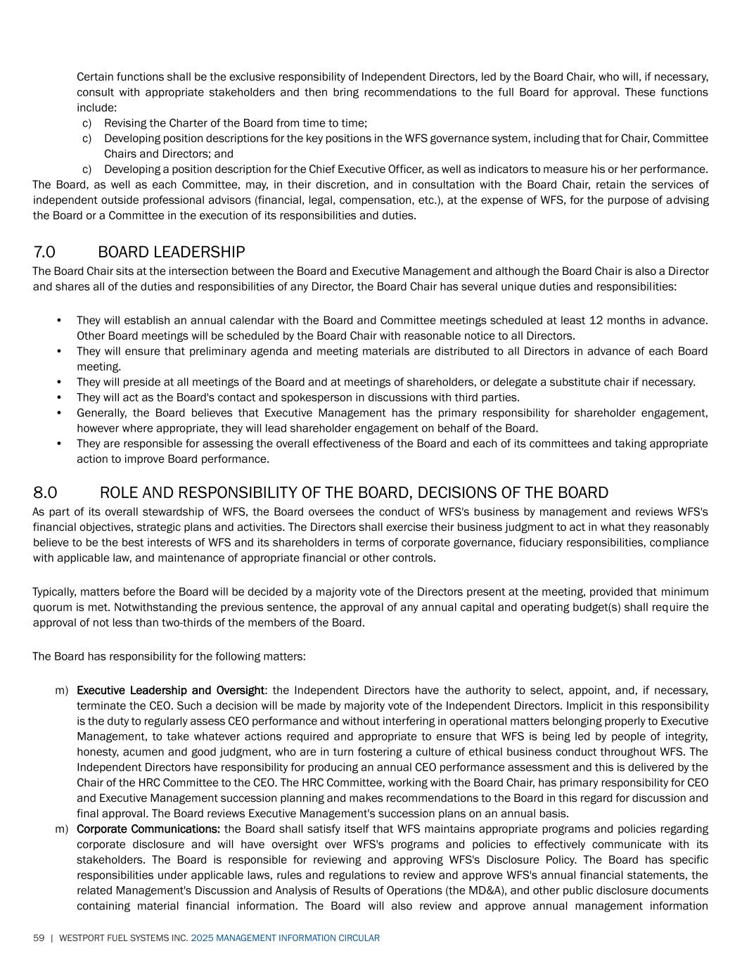59 | WESTPORT FUEL SYSTEMS INC. 2025 MANAGEMENT INFORMATION CIRCULAR Certain functions shall be the exclusive responsibility of Independent Directors, led by the Board Chair, who will, if necessary, consult with appropriate stakeholders and then bring recommendations to the full Board for approval. These functions include: c) Revising the Charter of the Board from time to time; c) Developing position descriptions for the key positions in the WFS governance system, including that for Chair, Committee Chairs and Directors; and c) Developing a position description for the Chief Executive Officer, as well as indicators to measure his or her performance. The Board, as well as each Committee, may, in their discretion, and in consultation with the Board Chair, retain the services of independent outside professional advisors (financial, legal, compensation, etc.), at the expense of WFS, for the purpose of advising the Board or a Committee in the execution of its responsibilities and duties. 7.0 BOARD LEADERSHIP The Board Chair sits at the intersection between the Board and Executive Management and although the Board Chair is also a Director and shares all of the duties and responsibilities of any Director, the Board Chair has several unique duties and responsibilities: • They will establish an annual calendar with the Board and Committee meetings scheduled at least 12 months in advance. Other Board meetings will be scheduled by the Board Chair with reasonable notice to all Directors. • They will ensure that preliminary agenda and meeting materials are distributed to all Directors in advance of each Board meeting. • They will preside at all meetings of the Board and at meetings of shareholders, or delegate a substitute chair if necessary. • They will act as the Board's contact and spokesperson in discussions with third parties. • Generally, the Board believes that Executive Management has the primary responsibility for shareholder engagement, however where appropriate, they will lead shareholder engagement on behalf of the Board. • They are responsible for assessing the overall effectiveness of the Board and each of its committees and taking appropriate action to improve Board performance. 8.0 ROLE AND RESPONSIBILITY OF THE BOARD, DECISIONS OF THE BOARD As part of its overall stewardship of WFS, the Board oversees the conduct of WFS's business by management and reviews WFS's financial objectives, strategic plans and activities. The Directors shall exercise their business judgment to act in what they reasonably believe to be the best interests of WFS and its shareholders in terms of corporate governance, fiduciary responsibilities, compliance with applicable law, and maintenance of appropriate financial or other controls. Typically, matters before the Board will be decided by a majority vote of the Directors present at the meeting, provided that minimum quorum is met. Notwithstanding the previous sentence, the approval of any annual capital and operating budget(s) shall require the approval of not less than two-thirds of the members of the Board. The Board has responsibility for the following matters: m) Executive Leadership and Oversight: the Independent Directors have the authority to select, appoint, and, if necessary, terminate the CEO. Such a decision will be made by majority vote of the Independent Directors. Implicit in this responsibility is the duty to regularly assess CEO performance and without interfering in operational matters belonging properly to Executive Management, to take whatever actions required and appropriate to ensure that WFS is being led by people of integrity, honesty, acumen and good judgment, who are in turn fostering a culture of ethical business conduct throughout WFS. The Independent Directors have responsibility for producing an annual CEO performance assessment and this is delivered by the Chair of the HRC Committee to the CEO. The HRC Committee, working with the Board Chair, has primary responsibility for CEO and Executive Management succession planning and makes recommendations to the Board in this regard for discussion and final approval. The Board reviews Executive Management's succession plans on an annual basis. m) Corporate Communications: the Board shall satisfy itself that WFS maintains appropriate programs and policies regarding corporate disclosure and will have oversight over WFS's programs and policies to effectively communicate with its stakeholders. The Board is responsible for reviewing and approving WFS's Disclosure Policy. The Board has specific responsibilities under applicable laws, rules and regulations to review and approve WFS's annual financial statements, the related Management's Discussion and Analysis of Results of Operations (the MD&A), and other public disclosure documents containing material financial information. The Board will also review and approve annual management information
