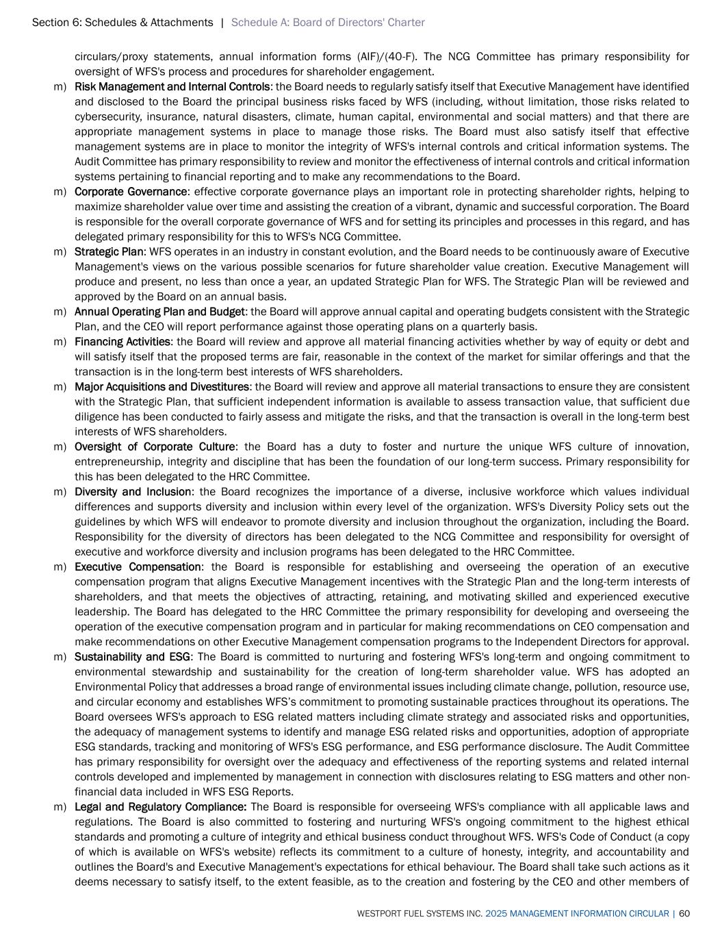 Section 6: Schedules & Attachments | Schedule A: Board of Directors' Charter WESTPORT FUEL SYSTEMS INC. 2025 MANAGEMENT INFORMATION CIRCULAR | 60 circulars/proxy statements, annual information forms (AIF)/(40-F). The NCG Committee has primary responsibility for oversight of WFS's process and procedures for shareholder engagement. m) Risk Management and Internal Controls: the Board needs to regularly satisfy itself that Executive Management have identified and disclosed to the Board the principal business risks faced by WFS (including, without limitation, those risks related to cybersecurity, insurance, natural disasters, climate, human capital, environmental and social matters) and that there are appropriate management systems in place to manage those risks. The Board must also satisfy itself that effective management systems are in place to monitor the integrity of WFS's internal controls and critical information systems. The Audit Committee has primary responsibility to review and monitor the effectiveness of internal controls and critical information systems pertaining to financial reporting and to make any recommendations to the Board. m) Corporate Governance: effective corporate governance plays an important role in protecting shareholder rights, helping to maximize shareholder value over time and assisting the creation of a vibrant, dynamic and successful corporation. The Board is responsible for the overall corporate governance of WFS and for setting its principles and processes in this regard, and has delegated primary responsibility for this to WFS's NCG Committee. m) Strategic Plan: WFS operates in an industry in constant evolution, and the Board needs to be continuously aware of Executive Management's views on the various possible scenarios for future shareholder value creation. Executive Management will produce and present, no less than once a year, an updated Strategic Plan for WFS. The Strategic Plan will be reviewed and approved by the Board on an annual basis. m) Annual Operating Plan and Budget: the Board will approve annual capital and operating budgets consistent with the Strategic Plan, and the CEO will report performance against those operating plans on a quarterly basis. m) Financing Activities: the Board will review and approve all material financing activities whether by way of equity or debt and will satisfy itself that the proposed terms are fair, reasonable in the context of the market for similar offerings and that the transaction is in the long-term best interests of WFS shareholders. m) Major Acquisitions and Divestitures: the Board will review and approve all material transactions to ensure they are consistent with the Strategic Plan, that sufficient independent information is available to assess transaction value, that sufficient due diligence has been conducted to fairly assess and mitigate the risks, and that the transaction is overall in the long-term best interests of WFS shareholders. m) Oversight of Corporate Culture: the Board has a duty to foster and nurture the unique WFS culture of innovation, entrepreneurship, integrity and discipline that has been the foundation of our long-term success. Primary responsibility for this has been delegated to the HRC Committee. m) Diversity and Inclusion: the Board recognizes the importance of a diverse, inclusive workforce which values individual differences and supports diversity and inclusion within every level of the organization. WFS's Diversity Policy sets out the guidelines by which WFS will endeavor to promote diversity and inclusion throughout the organization, including the Board. Responsibility for the diversity of directors has been delegated to the NCG Committee and responsibility for oversight of executive and workforce diversity and inclusion programs has been delegated to the HRC Committee. m) Executive Compensation: the Board is responsible for establishing and overseeing the operation of an executive compensation program that aligns Executive Management incentives with the Strategic Plan and the long-term interests of shareholders, and that meets the objectives of attracting, retaining, and motivating skilled and experienced executive leadership. The Board has delegated to the HRC Committee the primary responsibility for developing and overseeing the operation of the executive compensation program and in particular for making recommendations on CEO compensation and make recommendations on other Executive Management compensation programs to the Independent Directors for approval. m) Sustainability and ESG: The Board is committed to nurturing and fostering WFS's long-term and ongoing commitment to environmental stewardship and sustainability for the creation of long-term shareholder value. WFS has adopted an Environmental Policy that addresses a broad range of environmental issues including climate change, pollution, resource use, and circular economy and establishes WFS’s commitment to promoting sustainable practices throughout its operations. The Board oversees WFS's approach to ESG related matters including climate strategy and associated risks and opportunities, the adequacy of management systems to identify and manage ESG related risks and opportunities, adoption of appropriate ESG standards, tracking and monitoring of WFS's ESG performance, and ESG performance disclosure. The Audit Committee has primary responsibility for oversight over the adequacy and effectiveness of the reporting systems and related internal controls developed and implemented by management in connection with disclosures relating to ESG matters and other non- financial data included in WFS ESG Reports. m) Legal and Regulatory Compliance: The Board is responsible for overseeing WFS's compliance with all applicable laws and regulations. The Board is also committed to fostering and nurturing WFS's ongoing commitment to the highest ethical standards and promoting a culture of integrity and ethical business conduct throughou