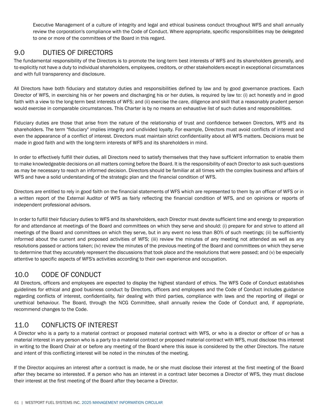 61 | WESTPORT FUEL SYSTEMS INC. 2025 MANAGEMENT INFORMATION CIRCULAR Executive Management of a culture of integrity and legal and ethical business conduct throughout WFS and shall annually review the corporation's compliance with the Code of Conduct. Where appropriate, specific responsibilities may be delegated to one or more of the committees of the Board in this regard. 9.0 DUTIES OF DIRECTORS The fundamental responsibility of the Directors is to promote the long-term best interests of WFS and its shareholders generally, and to explicitly not have a duty to individual shareholders, employees, creditors, or other stakeholders except in exceptional circumstances and with full transparency and disclosure. All Directors have both fiduciary and statutory duties and responsibilities defined by law and by good governance practices. Each Director of WFS, in exercising his or her powers and discharging his or her duties, is required by law to: (i) act honestly and in good faith with a view to the long-term best interests of WFS; and (ii) exercise the care, diligence and skill that a reasonably prudent person would exercise in comparable circumstances. This Charter is by no means an exhaustive list of such duties and responsibilities. Fiduciary duties are those that arise from the nature of the relationship of trust and confidence between Directors, WFS and its shareholders. The term "fiduciary" implies integrity and undivided loyalty. For example, Directors must avoid conflicts of interest and even the appearance of a conflict of interest. Directors must maintain strict confidentiality about all WFS matters. Decisions must be made in good faith and with the long-term interests of WFS and its shareholders in mind. In order to effectively fulfill their duties, all Directors need to satisfy themselves that they have sufficient information to enable them to make knowledgeable decisions on all matters coming before the Board. It is the responsibility of each Director to ask such questions as may be necessary to reach an informed decision. Directors should be familiar at all times with the complex business and affairs of WFS and have a solid understanding of the strategic plan and the financial condition of WFS. Directors are entitled to rely in good faith on the financial statements of WFS which are represented to them by an officer of WFS or in a written report of the External Auditor of WFS as fairly reflecting the financial condition of WFS, and on opinions or reports of independent professional advisors. In order to fulfill their fiduciary duties to WFS and its shareholders, each Director must devote sufficient time and energy to preparation for and attendance at meetings of the Board and committees on which they serve and should: (i) prepare for and strive to attend all meetings of the Board and committees on which they serve, but in any event no less than 80% of such meetings; (ii) be sufficiently informed about the current and proposed activities of WFS; (iii) review the minutes of any meeting not attended as well as any resolutions passed or actions taken; (iv) review the minutes of the previous meeting of the Board and committees on which they serve to determine that they accurately represent the discussions that took place and the resolutions that were passed; and (v) be especially attentive to specific aspects of WFS's activities according to their own experience and occupation. 10.0 CODE OF CONDUCT All Directors, officers and employees are expected to display the highest standard of ethics. The WFS Code of Conduct establishes guidelines for ethical and good business conduct by Directors, officers and employees and the Code of Conduct includes guidance regarding conflicts of interest, confidentiality, fair dealing with third parties, compliance with laws and the reporting of illegal or unethical behaviour. The Board, through the NCG Committee, shall annually review the Code of Conduct and, if appropriate, recommend changes to the Code. 11.0 CONFLICTS OF INTEREST A Director who is a party to a material contract or proposed material contract with WFS, or who is a director or officer of or has a material interest in any person who is a party to a material contract or proposed material contract with WFS, must disclose this interest in writing to the Board Chair at or before any meeting of the Board where this issue is considered by the other Directors. The nature and intent of this conflicting interest will be noted in the minutes of the meeting. If the Director acquires an interest after a contract is made, he or she must disclose their interest at the first meeting of the Board after they became so interested. If a person who has an interest in a contract later becomes a Director of WFS, they must disclose their interest at the first meeting of the Board after they became a Director.