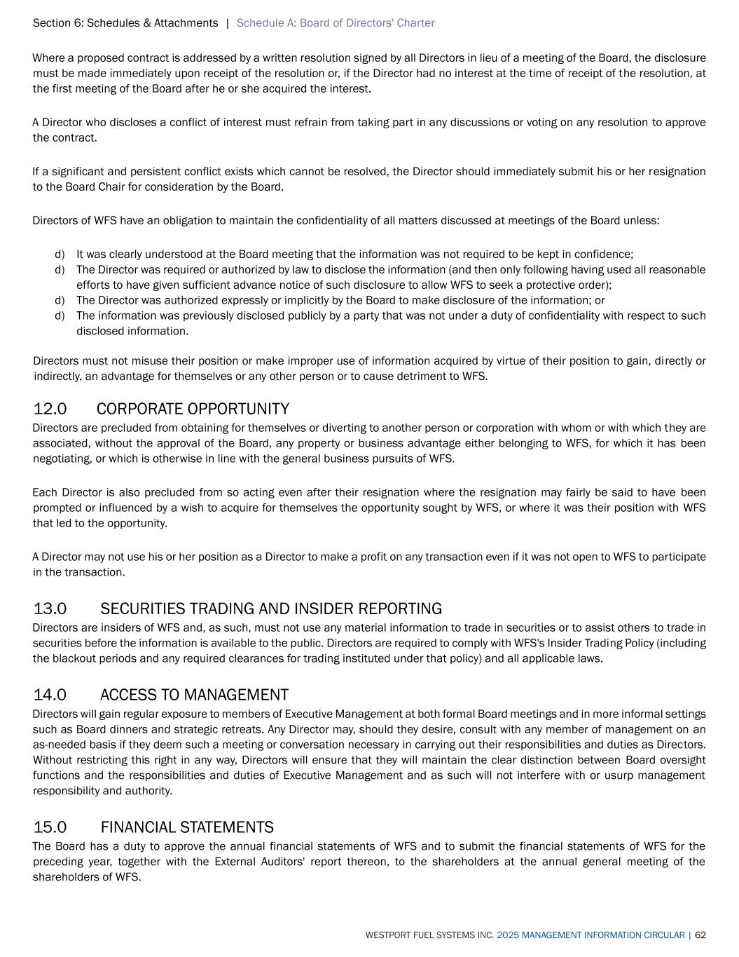 Section 6: Schedules & Attachments | Schedule A: Board of Directors' Charter WESTPORT FUEL SYSTEMS INC. 2025 MANAGEMENT INFORMATION CIRCULAR | 62 Where a proposed contract is addressed by a written resolution signed by all Directors in lieu of a meeting of the Board, the disclosure must be made immediately upon receipt of the resolution or, if the Director had no interest at the time of receipt of the resolution, at the first meeting of the Board after he or she acquired the interest. A Director who discloses a conflict of interest must refrain from taking part in any discussions or voting on any resolution to approve the contract. If a significant and persistent conflict exists which cannot be resolved, the Director should immediately submit his or her resignation to the Board Chair for consideration by the Board. Directors of WFS have an obligation to maintain the confidentiality of all matters discussed at meetings of the Board unless: d) It was clearly understood at the Board meeting that the information was not required to be kept in confidence; d) The Director was required or authorized by law to disclose the information (and then only following having used all reasonable efforts to have given sufficient advance notice of such disclosure to allow WFS to seek a protective order); d) The Director was authorized expressly or implicitly by the Board to make disclosure of the information; or d) The information was previously disclosed publicly by a party that was not under a duty of confidentiality with respect to such disclosed information. Directors must not misuse their position or make improper use of information acquired by virtue of their position to gain, directly or indirectly, an advantage for themselves or any other person or to cause detriment to WFS. 12.0 CORPORATE OPPORTUNITY Directors are precluded from obtaining for themselves or diverting to another person or corporation with whom or with which they are associated, without the approval of the Board, any property or business advantage either belonging to WFS, for which it has been negotiating, or which is otherwise in line with the general business pursuits of WFS. Each Director is also precluded from so acting even after their resignation where the resignation may fairly be said to have been prompted or influenced by a wish to acquire for themselves the opportunity sought by WFS, or where it was their position with WFS that led to the opportunity. A Director may not use his or her position as a Director to make a profit on any transaction even if it was not open to WFS to participate in the transaction. 13.0 SECURITIES TRADING AND INSIDER REPORTING Directors are insiders of WFS and, as such, must not use any material information to trade in securities or to assist others to trade in securities before the information is available to the public. Directors are required to comply with WFS's Insider Trading Policy (including the blackout periods and any required clearances for trading instituted under that policy) and all applicable laws. 14.0 ACCESS TO MANAGEMENT Directors will gain regular exposure to members of Executive Management at both formal Board meetings and in more informal settings such as Board dinners and strategic retreats. Any Director may, should they desire, consult with any member of management on an as-needed basis if they deem such a meeting or conversation necessary in carrying out their responsibilities and duties as Directors. Without restricting this right in any way, Directors will ensure that they will maintain the clear distinction between Board oversight functions and the responsibilities and duties of Executive Management and as such will not interfere with or usurp management responsibility and authority. 15.0 FINANCIAL STATEMENTS The Board has a duty to approve the annual financial statements of WFS and to submit the financial statements of WFS for the preceding year, together with the External Auditors' report thereon, to the shareholders at the annual general meeting of the shareholders of WFS.