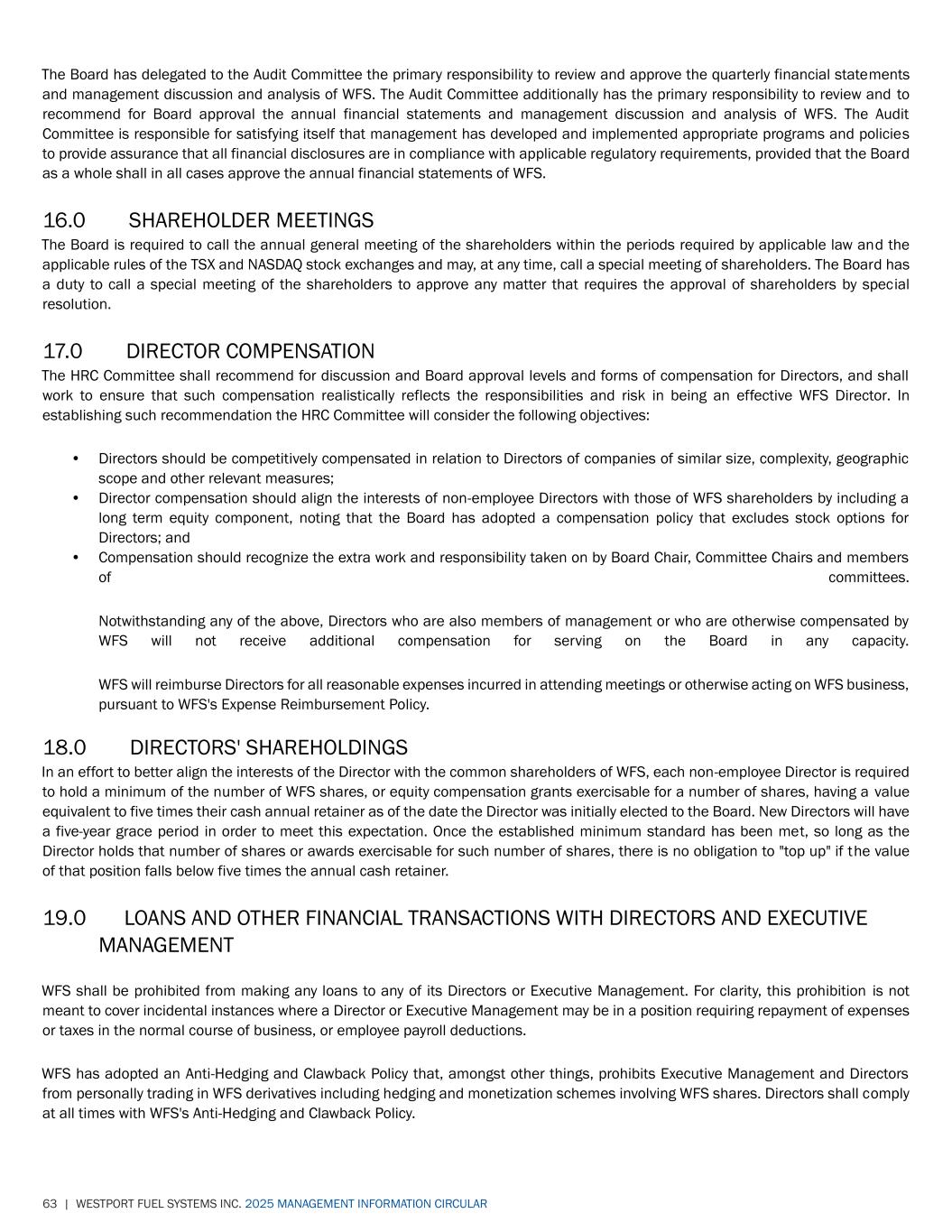63 | WESTPORT FUEL SYSTEMS INC. 2025 MANAGEMENT INFORMATION CIRCULAR The Board has delegated to the Audit Committee the primary responsibility to review and approve the quarterly financial statements and management discussion and analysis of WFS. The Audit Committee additionally has the primary responsibility to review and to recommend for Board approval the annual financial statements and management discussion and analysis of WFS. The Audit Committee is responsible for satisfying itself that management has developed and implemented appropriate programs and policies to provide assurance that all financial disclosures are in compliance with applicable regulatory requirements, provided that the Board as a whole shall in all cases approve the annual financial statements of WFS. 16.0 SHAREHOLDER MEETINGS The Board is required to call the annual general meeting of the shareholders within the periods required by applicable law and the applicable rules of the TSX and NASDAQ stock exchanges and may, at any time, call a special meeting of shareholders. The Board has a duty to call a special meeting of the shareholders to approve any matter that requires the approval of shareholders by special resolution. 17.0 DIRECTOR COMPENSATION The HRC Committee shall recommend for discussion and Board approval levels and forms of compensation for Directors, and shall work to ensure that such compensation realistically reflects the responsibilities and risk in being an effective WFS Director. In establishing such recommendation the HRC Committee will consider the following objectives: • Directors should be competitively compensated in relation to Directors of companies of similar size, complexity, geographic scope and other relevant measures; • Director compensation should align the interests of non-employee Directors with those of WFS shareholders by including a long term equity component, noting that the Board has adopted a compensation policy that excludes stock options for Directors; and • Compensation should recognize the extra work and responsibility taken on by Board Chair, Committee Chairs and members of committees. Notwithstanding any of the above, Directors who are also members of management or who are otherwise compensated by WFS will not receive additional compensation for serving on the Board in any capacity. WFS will reimburse Directors for all reasonable expenses incurred in attending meetings or otherwise acting on WFS business, pursuant to WFS's Expense Reimbursement Policy. 18.0 DIRECTORS' SHAREHOLDINGS In an effort to better align the interests of the Director with the common shareholders of WFS, each non-employee Director is required to hold a minimum of the number of WFS shares, or equity compensation grants exercisable for a number of shares, having a value equivalent to five times their cash annual retainer as of the date the Director was initially elected to the Board. New Directors will have a five-year grace period in order to meet this expectation. Once the established minimum standard has been met, so long as the Director holds that number of shares or awards exercisable for such number of shares, there is no obligation to "top up" if the value of that position falls below five times the annual cash retainer. 19.0 LOANS AND OTHER FINANCIAL TRANSACTIONS WITH DIRECTORS AND EXECUTIVE MANAGEMENT WFS shall be prohibited from making any loans to any of its Directors or Executive Management. For clarity, this prohibition is not meant to cover incidental instances where a Director or Executive Management may be in a position requiring repayment of expenses or taxes in the normal course of business, or employee payroll deductions. WFS has adopted an Anti-Hedging and Clawback Policy that, amongst other things, prohibits Executive Management and Directors from personally trading in WFS derivatives including hedging and monetization schemes involving WFS shares. Directors shall comply at all times with WFS's Anti-Hedging and Clawback Policy.