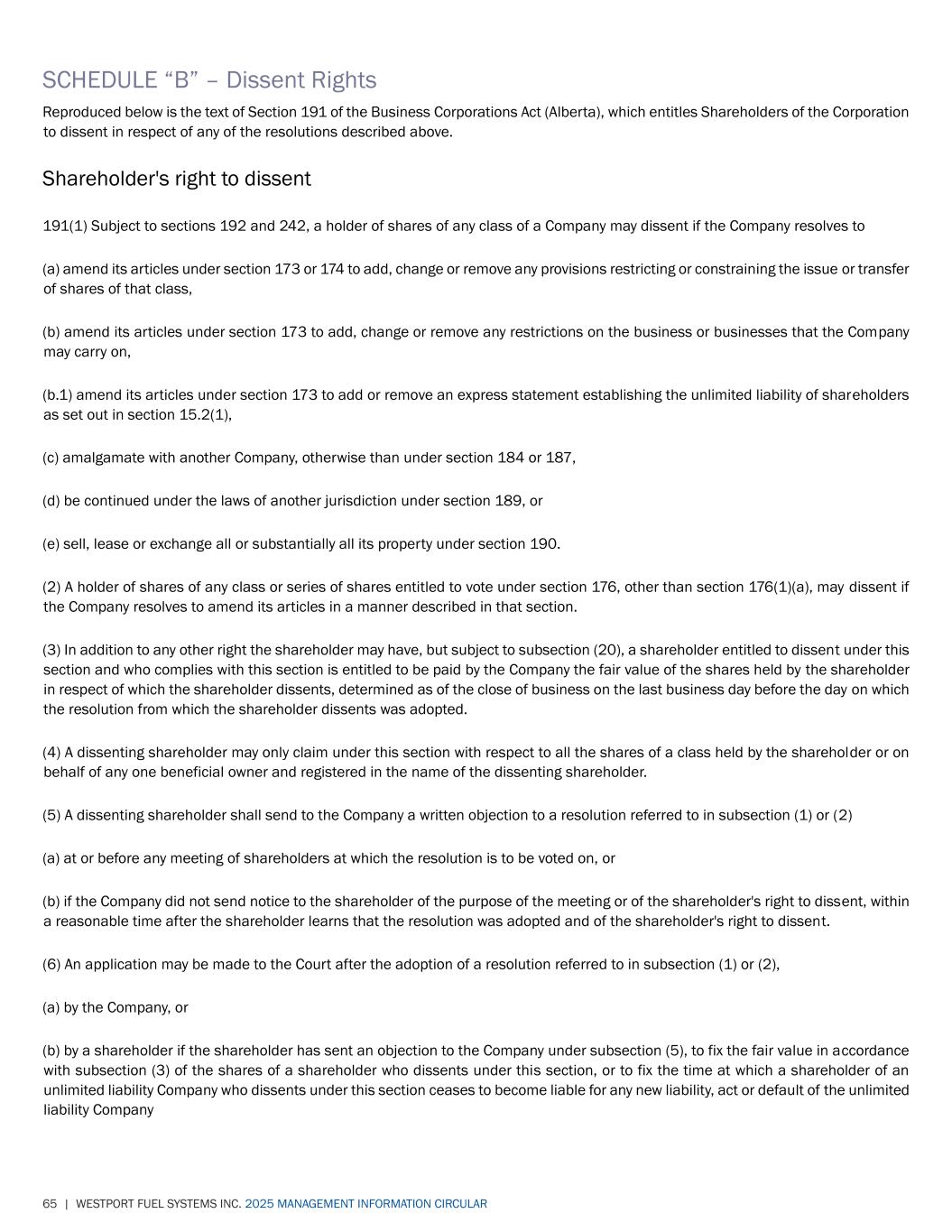 65 | WESTPORT FUEL SYSTEMS INC. 2025 MANAGEMENT INFORMATION CIRCULAR SCHEDULE “B” – Dissent Rights Reproduced below is the text of Section 191 of the Business Corporations Act (Alberta), which entitles Shareholders of the Corporation to dissent in respect of any of the resolutions described above. Shareholder's right to dissent 191(1) Subject to sections 192 and 242, a holder of shares of any class of a Company may dissent if the Company resolves to (a) amend its articles under section 173 or 174 to add, change or remove any provisions restricting or constraining the issue or transfer of shares of that class, (b) amend its articles under section 173 to add, change or remove any restrictions on the business or businesses that the Company may carry on, (b.1) amend its articles under section 173 to add or remove an express statement establishing the unlimited liability of shareholders as set out in section 15.2(1), (c) amalgamate with another Company, otherwise than under section 184 or 187, (d) be continued under the laws of another jurisdiction under section 189, or (e) sell, lease or exchange all or substantially all its property under section 190. (2) A holder of shares of any class or series of shares entitled to vote under section 176, other than section 176(1)(a), may dissent if the Company resolves to amend its articles in a manner described in that section. (3) In addition to any other right the shareholder may have, but subject to subsection (20), a shareholder entitled to dissent under this section and who complies with this section is entitled to be paid by the Company the fair value of the shares held by the shareholder in respect of which the shareholder dissents, determined as of the close of business on the last business day before the day on which the resolution from which the shareholder dissents was adopted. (4) A dissenting shareholder may only claim under this section with respect to all the shares of a class held by the shareholder or on behalf of any one beneficial owner and registered in the name of the dissenting shareholder. (5) A dissenting shareholder shall send to the Company a written objection to a resolution referred to in subsection (1) or (2) (a) at or before any meeting of shareholders at which the resolution is to be voted on, or (b) if the Company did not send notice to the shareholder of the purpose of the meeting or of the shareholder's right to dissent, within a reasonable time after the shareholder learns that the resolution was adopted and of the shareholder's right to dissent. (6) An application may be made to the Court after the adoption of a resolution referred to in subsection (1) or (2), (a) by the Company, or (b) by a shareholder if the shareholder has sent an objection to the Company under subsection (5), to fix the fair value in accordance with subsection (3) of the shares of a shareholder who dissents under this section, or to fix the time at which a shareholder of an unlimited liability Company who dissents under this section ceases to become liable for any new liability, act or default of the unlimited liability Company