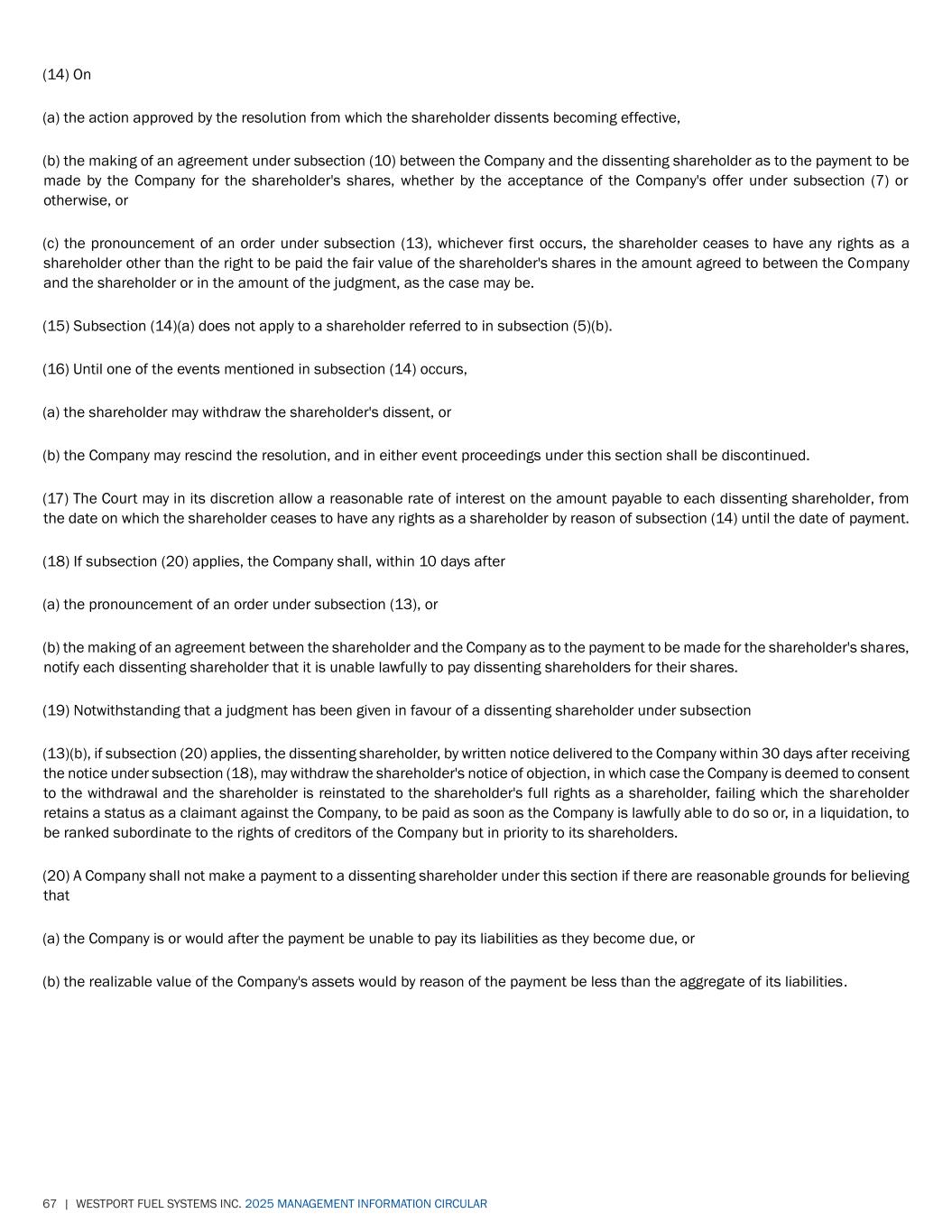 67 | WESTPORT FUEL SYSTEMS INC. 2025 MANAGEMENT INFORMATION CIRCULAR (14) On (a) the action approved by the resolution from which the shareholder dissents becoming effective, (b) the making of an agreement under subsection (10) between the Company and the dissenting shareholder as to the payment to be made by the Company for the shareholder's shares, whether by the acceptance of the Company's offer under subsection (7) or otherwise, or (c) the pronouncement of an order under subsection (13), whichever first occurs, the shareholder ceases to have any rights as a shareholder other than the right to be paid the fair value of the shareholder's shares in the amount agreed to between the Company and the shareholder or in the amount of the judgment, as the case may be. (15) Subsection (14)(a) does not apply to a shareholder referred to in subsection (5)(b). (16) Until one of the events mentioned in subsection (14) occurs, (a) the shareholder may withdraw the shareholder's dissent, or (b) the Company may rescind the resolution, and in either event proceedings under this section shall be discontinued. (17) The Court may in its discretion allow a reasonable rate of interest on the amount payable to each dissenting shareholder, from the date on which the shareholder ceases to have any rights as a shareholder by reason of subsection (14) until the date of payment. (18) If subsection (20) applies, the Company shall, within 10 days after (a) the pronouncement of an order under subsection (13), or (b) the making of an agreement between the shareholder and the Company as to the payment to be made for the shareholder's shares, notify each dissenting shareholder that it is unable lawfully to pay dissenting shareholders for their shares. (19) Notwithstanding that a judgment has been given in favour of a dissenting shareholder under subsection (13)(b), if subsection (20) applies, the dissenting shareholder, by written notice delivered to the Company within 30 days after receiving the notice under subsection (18), may withdraw the shareholder's notice of objection, in which case the Company is deemed to consent to the withdrawal and the shareholder is reinstated to the shareholder's full rights as a shareholder, failing which the shareholder retains a status as a claimant against the Company, to be paid as soon as the Company is lawfully able to do so or, in a liquidation, to be ranked subordinate to the rights of creditors of the Company but in priority to its shareholders. (20) A Company shall not make a payment to a dissenting shareholder under this section if there are reasonable grounds for believing that (a) the Company is or would after the payment be unable to pay its liabilities as they become due, or (b) the realizable value of the Company's assets would by reason of the payment be less than the aggregate of its liabilities.