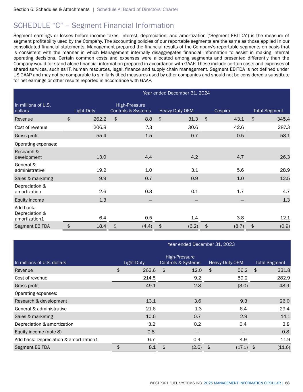 Section 6: Schedules & Attachments | Schedule A: Board of Directors' Charter WESTPORT FUEL SYSTEMS INC. 2025 MANAGEMENT INFORMATION CIRCULAR | 68 SCHEDULE “C” – Segment Financial Information Segment earnings or losses before income taxes, interest, depreciation, and amortization ("Segment EBITDA") is the measure of segment profitability used by the Company. The accounting policies of our reportable segments are the same as those applied in our consolidated financial statements. Management prepared the financial results of the Company's reportable segments on basis that is consistent with the manner in which Management internally disaggregates financial information to assist in making internal operating decisions. Certain common costs and expenses were allocated among segments and presented differently than the Company would for stand-alone financial information prepared in accordance with GAAP. These include certain costs and expenses of shared services, such as IT, human resources, legal, finance and supply chain management. Segment EBITDA is not defined under US GAAP and may not be comparable to similarly titled measures used by other companies and should not be considered a substitute for net earnings or other results reported in accordance with GAAP. Year ended December 31, 2024 In millions of U.S. dollars Light-Duty High-Pressure Controls & Systems Heavy-Duty OEM Cespira Total Segment Revenue $ 262.2 $ 8.8 $ 31.3 $ 43.1 $ 345.4 Cost of revenue 206.8 7.3 30.6 42.6 287.3 Gross profit 55.4 1.5 0.7 0.5 58.1 Operating expenses: Research & development 13.0 4.4 4.2 4.7 26.3 General & administrative 19.2 1.0 3.1 5.6 28.9 Sales & marketing 9.9 0.7 0.9 1.0 12.5 Depreciation & amortization 2.6 0.3 0.1 1.7 4.7 Equity income 1.3 — — — 1.3 Add back: Depreciation & amortization1 6.4 0.5 1.4 3.8 12.1 Segment EBITDA $ 18.4 $ (4.4) $ (6.2) $ (8.7) $ (0.9) Year ended December 31, 2023 In millions of U.S. dollars Light-Duty High-Pressure Controls & Systems Heavy-Duty OEM Total Segment Revenue $ 263.6 $ 12.0 $ 56.2 $ 331.8 Cost of revenue 214.5 9.2 59.2 282.9 Gross profit 49.1 2.8 (3.0) 48.9 Operating expenses: Research & development 13.1 3.6 9.3 26.0 General & administrative 21.6 1.3 6.4 29.4 Sales & marketing 10.6 0.7 2.9 14.1 Depreciation & amortization 3.2 0.2 0.4 3.8 Equity income (note 8) 0.8 — — 0.8 Add back: Depreciation & amortization1 6.7 0.4 4.9 11.9 Segment EBITDA $ 8.1 $ (2.6) $ (17.1) $ (11.6)
