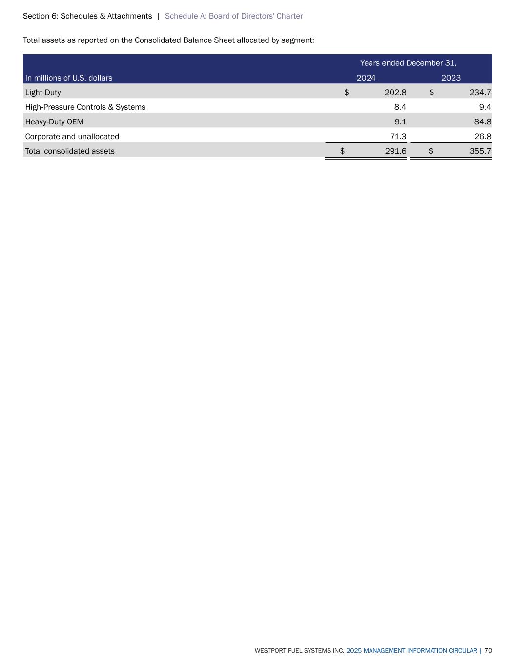 Section 6: Schedules & Attachments | Schedule A: Board of Directors' Charter WESTPORT FUEL SYSTEMS INC. 2025 MANAGEMENT INFORMATION CIRCULAR | 70 Total assets as reported on the Consolidated Balance Sheet allocated by segment: Years ended December 31, In millions of U.S. dollars 2024 2023 Light-Duty $ 202.8 $ 234.7 High-Pressure Controls & Systems 8.4 9.4 Heavy-Duty OEM 9.1 84.8 Corporate and unallocated 71.3 26.8 Total consolidated assets $ 291.6 $ 355.7