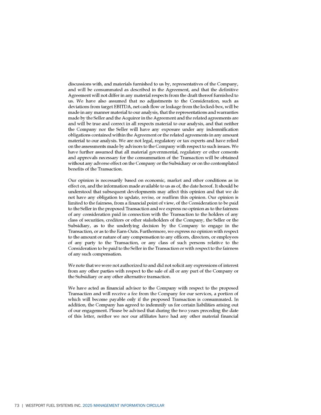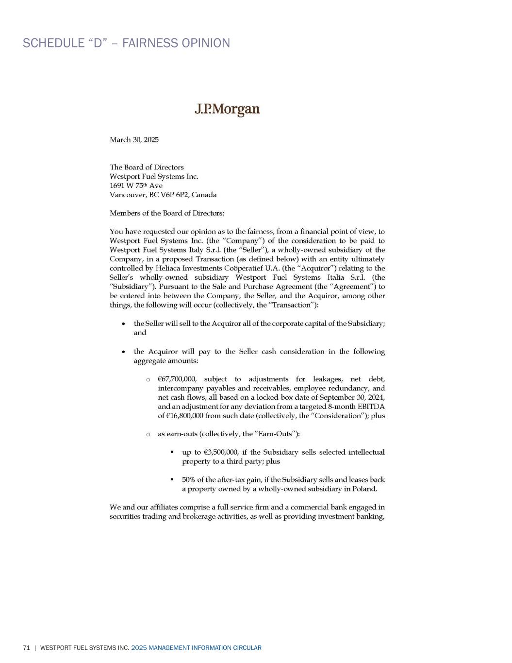 71 | WESTPORT FUEL SYSTEMS INC. 2025 MANAGEMENT INFORMATION CIRCULAR SCHEDULE “D” – FAIRNESS OPINION