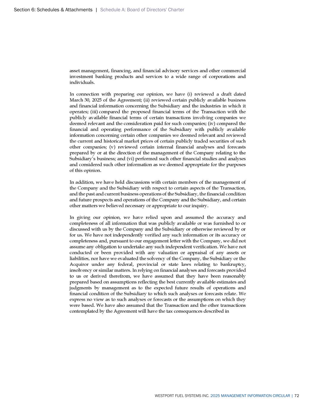 Section 6: Schedules & Attachments | Schedule A: Board of Directors' Charter WESTPORT FUEL SYSTEMS INC. 2025 MANAGEMENT INFORMATION CIRCULAR | 72