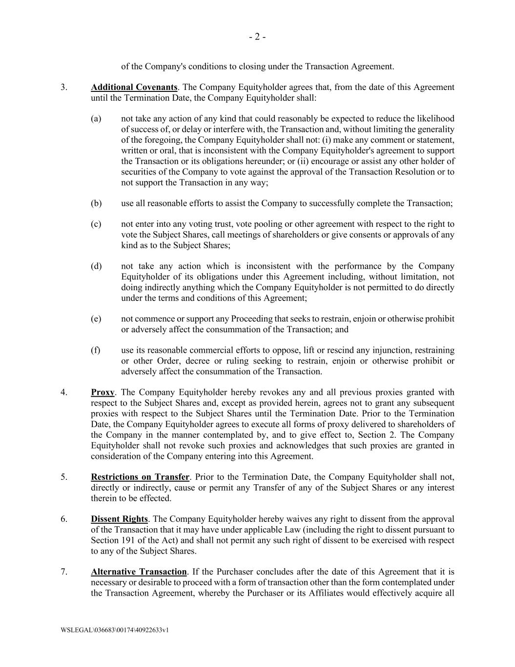 WSLEGAL\036683\00174\40922538v1 - 2 - of the Company's conditions to closing under the Transaction Agreement. 3. Additional Covenants. The Company Equityholder agrees that, from the date of this Agreement until the Termination Date, the Company Equityholder shall: (a) not take any action of any kind that could reasonably be expected to reduce the likelihood of success of, or delay or interfere with, the Transaction and, without limiting the generality of the foregoing, the Company Equityholder shall not: (i) make any comment or statement, written or oral, that is inconsistent with the Company Equityholder's agreement to support the Transaction or its obligations hereunder; or (ii) encourage or assist any other holder of securities of the Company to vote against the approval of the Transaction Resolution or to not support the Transaction in any way; (b) use all reasonable efforts to assist the Company to successfully complete the Transaction; (c) not enter into any voting trust, vote pooling or other agreement with respect to the right to vote the Subject Shares, call meetings of shareholders or give consents or approvals of any kind as to the Subject Shares; (d) not take any action which is inconsistent with the performance by the Company Equityholder of its obligations under this Agreement including, without limitation, not doing indirectly anything which the Company Equityholder is not permitted to do directly under the terms and conditions of this Agreement; (e) not commence or support any Proceeding that seeks to restrain, enjoin or otherwise prohibit or adversely affect the consummation of the Transaction; and (f) use its reasonable commercial efforts to oppose, lift or rescind any injunction, restraining or other Order, decree or ruling seeking to restrain, enjoin or otherwise prohibit or adversely affect the consummation of the Transaction. 4. Proxy. The Company Equityholder hereby revokes any and all previous proxies granted with respect to the Subject Shares and, except as provided herein, agrees not to grant any subsequent proxies with respect to the Subject Shares until the Termination Date. Prior to the Termination Date, the Company Equityholder agrees to execute all forms of proxy delivered to shareholders of the Company in the manner contemplated by, and to give effect to, Section 2. The Company Equityholder shall not revoke such proxies and acknowledges that such proxies are granted in consideration of the Company entering into this Agreement. 5. Restrictions on Transfer. Prior to the Termination Date, the Company Equityholder shall not, directly or indirectly, cause or permit any Transfer of any of the Subject Shares or any interest therein to be effected. 6. Dissent Rights. The Company Equityholder hereby waives any right to dissent from the approval of the Transaction that it may have under applicable Law (including the right to dissent pursuant to Section 191 of the Act) and shall not permit any such right of dissent to be exercised with respect to any of the Subject Shares. 7. Alternative Transaction. If the Purchaser concludes after the date of this Agreement that it is necessary or desirable to proceed with a form of transaction other than the form contemplated under the Transaction Agreement, whereby the Purchaser or its Affiliates would effectively acquire all