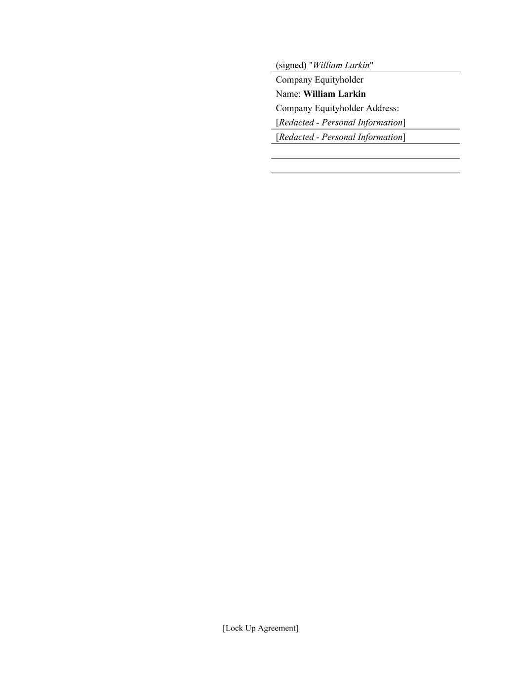 [Lock Up Agreement] (signed) "William Larkin" Company Equityholder Name: William Larkin Company Equityholder Address: [Redacted - Personal Information] [Redacted - Personal Information]